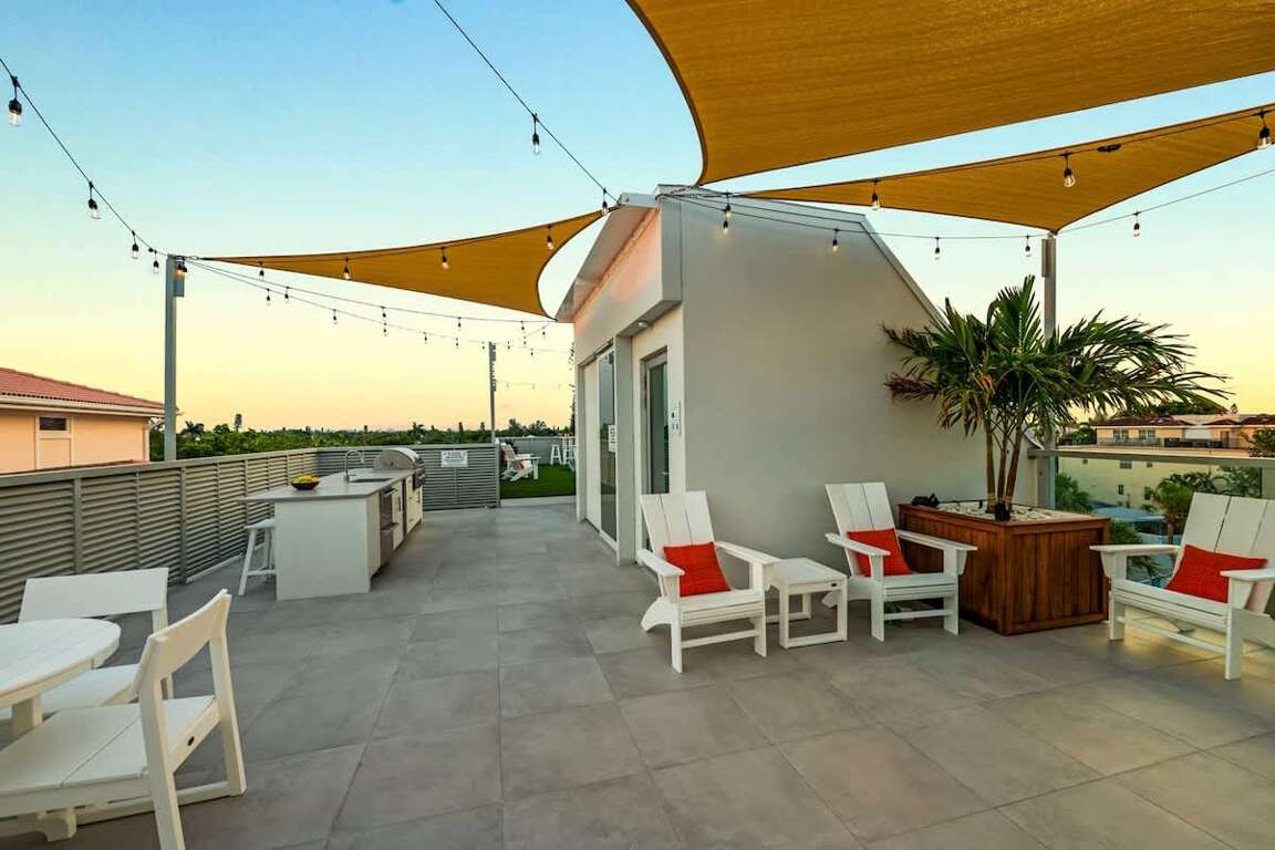 This home has elevator service to ALL floors. This spacious Siesta Key vacation rental features a total of over 7,000 square foot of vacation space. It has 6 bedrooms, including a bunkroom, and all have En-Suite bathrooms. The 5 King Suites include the Master Bedroom, which features a King-sized Bed, a wraparound balcony, a double vanity, soaking tub and walk-in shower. This luxury vacation rental in Siesta Key can comfortably accommodate 14 people. It also boasts of the best rooftop deck in Siesta Key. This includes a covered outdoor cooking area with gas grill and large HDTV. There are also games, seating and other amenities.