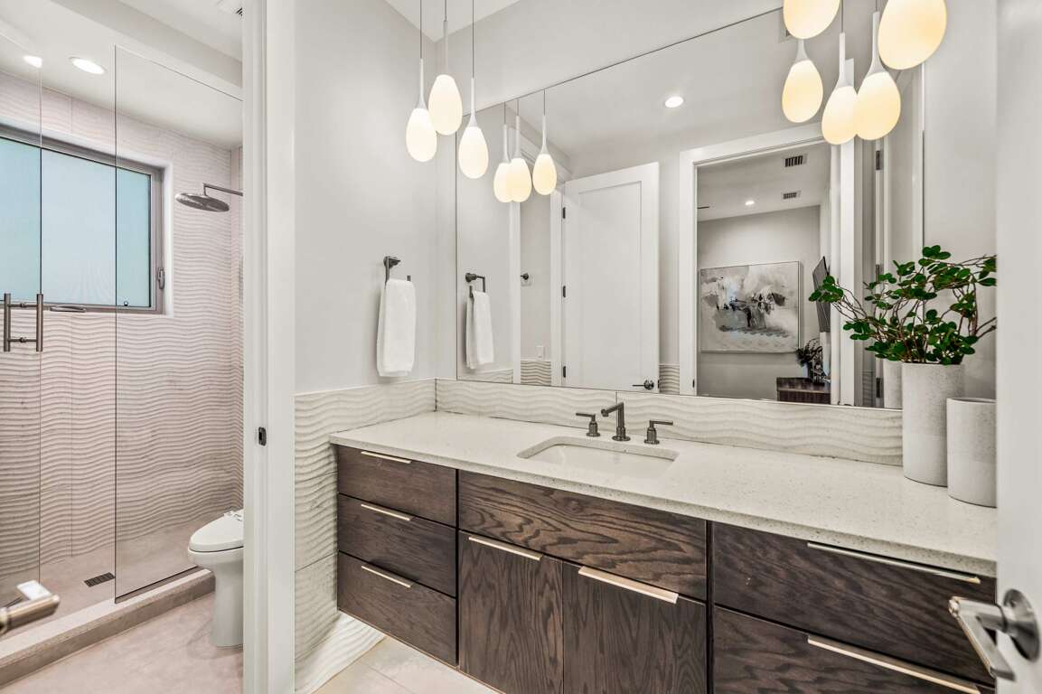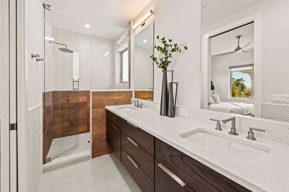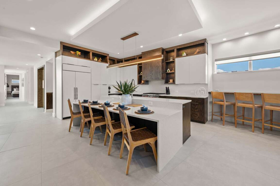 This level features parking for five vehicles - one covered parking space and four open air driveway parking spaces. This level also includes the pool, lounging area, and the main entrance foyer with elevator and stairs access to the home’s two living levels.
