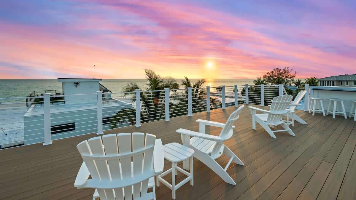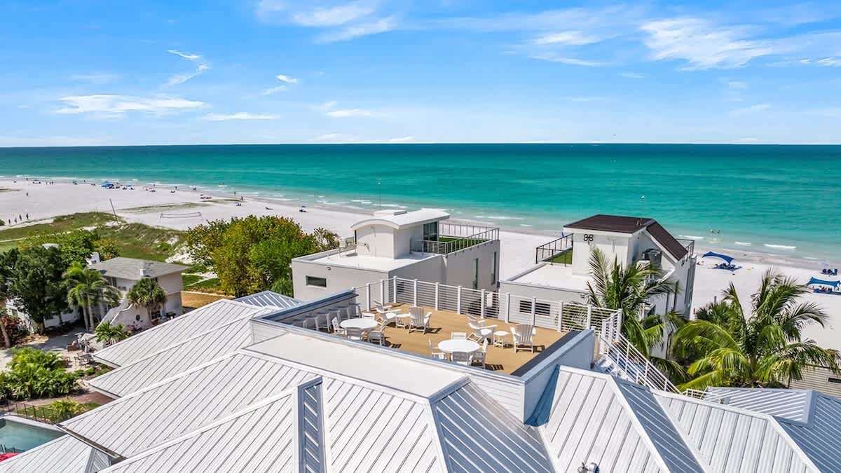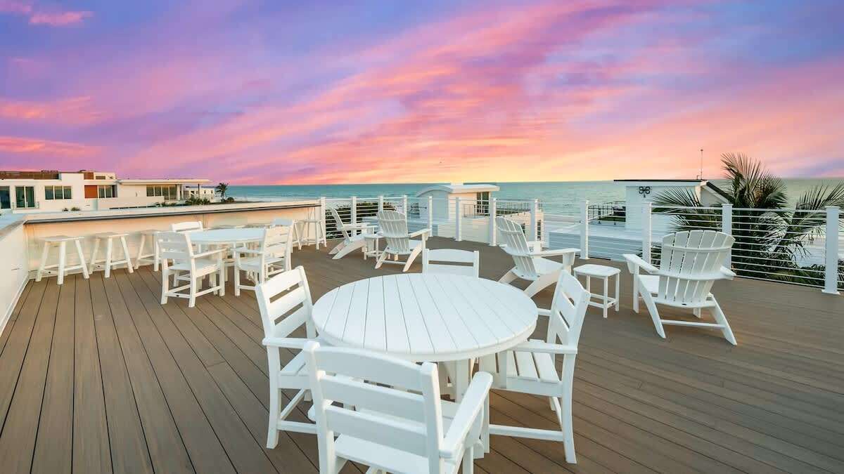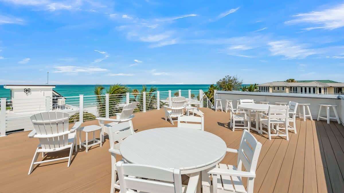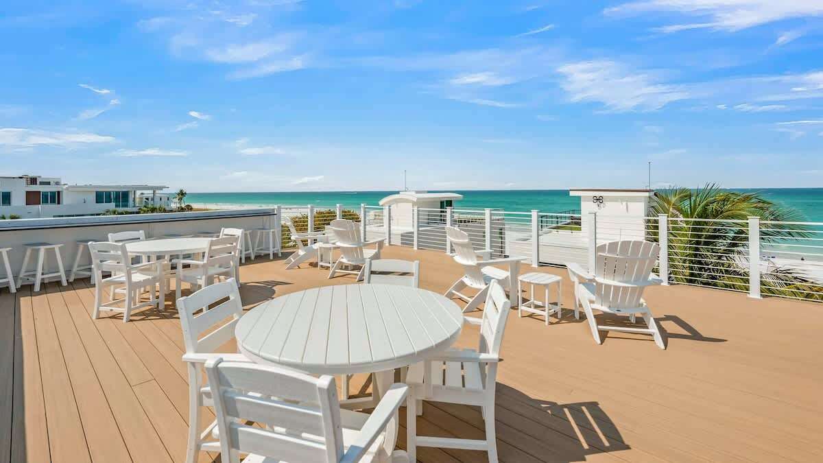 Features views, views, and more views. This tasteful space provides multiple seating options via 4 top dining tables and bar top seating along the railing edge. It is perfect for enjoying sunrise over the Siesta Key Village, or sunset over the Gulf of Mexico, so be sure to grab a book, a coffee or cocktail, and enjoy the sea breeze and Florida sun from this amazing perch overlooking all of Siesta Key.