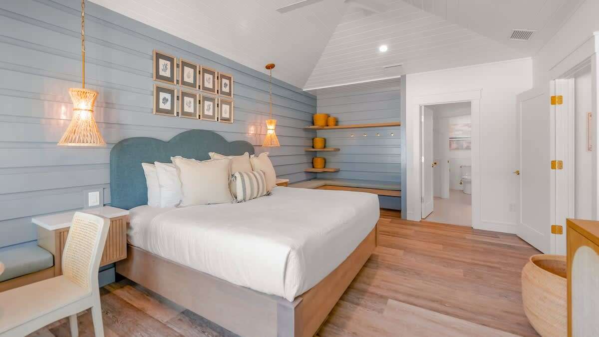Features a club room with a wet bar with 2 beverage refrigerators and bar seating for 4, 6-seat card table, shuffleboard and foosball tables, a living area with large TV and gaming consoles - Nintendo and PS4, half bath, and 2 balconies. The front balcony has views of the Village, and the rear balcony provides sunset and Gulf views and access to the rooftop deck. There are also 4 bedrooms on this floor. Bedroom 4 offers Gulf views, a seating area, city closet and built ins, and an en suite bath with double vanity, walk in shower with standing bathtub, and a private water closet. Bedroom 5 has Gulf views, balcony access, king bed, and an en suite bathroom with oversized vanity and walk-in shower. Bedroom 6 feature king beds, city closet system, and en suite baths with vanity and walk-in showers. Bedroom 7 is the second bunk room with a custom king over king bunk bed and an en suite bath with a shower/tub combo.