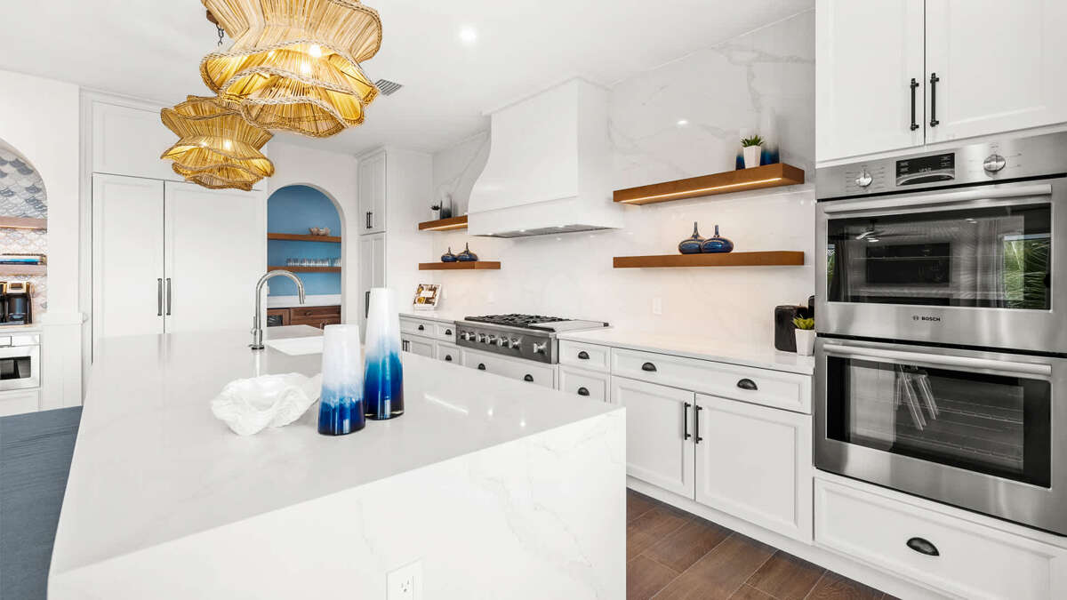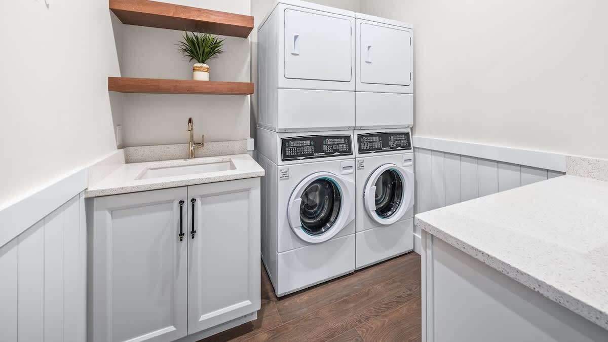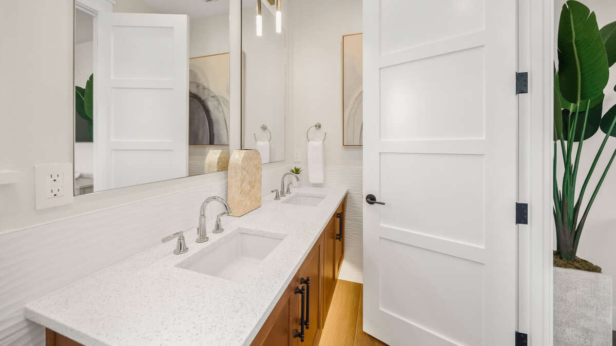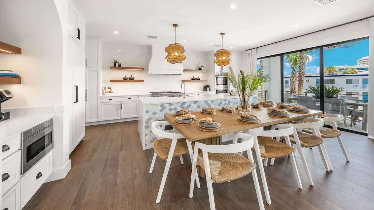 Features the Great Room with fully stocked chef's kitchen that includes: a butler pantry, full sized refrigerator and freezer (with ice maker), 2 dishwashers, wall mounted double ovens, oversized cooktop with vent hood, microwave, toaster, coffee maker. It is very well appointed with cookware, bakeware, dishware, cutlery, and specialty items like crockpots, blenders, and more. If you have any questions on kitchen supplies, our reservationists would be happy to provide more details. The great room also includes a custom dining table for 12, and a living room with a smart TV, and a half-bath. There is a balcony off this space, offering additional dining and seating options that extends the living space and offers views throughout. There are 2 bedrooms on this floor. Bedroom 2 features a king bed and en-suite bathroom with a double vanity and a walk-in shower, while Bedroom 5 features 2 sets of custom-built bunk beds, a king over king bunk bed and a full over full bunk bed. This bunk room has an en-suite bathroom that has a double vanity and shower/tub combo. The laundry room with 2 stackable washer/dryer units is on this level as well. We include a full refrigerator and freezer (with ice maker) here as well so your beach prep and breakdown, and your use of the home and pool is that much easier.