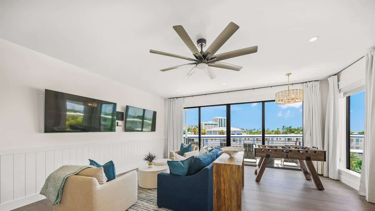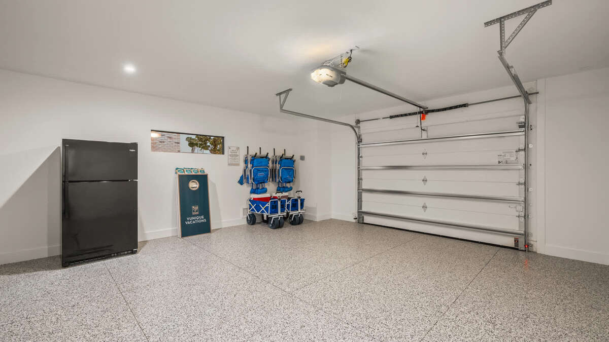 This home provides free parking for up to 6 vehicles (2 in garages and 3-4 in driveway). The home's beach equipment is stored in the garage, which includes 2 beach wagons, 2 coolers, 6 beach chairs, and 4 bikes. We include a full refrigerator and freezer (with ice maker) here as well so your beach prep and breakdown, and your use of the home and pool is that much easier. The ground level space features the fully fenced pool and back yard area, including the covered patio space. The pool is a Florida paradise as previously described, and the adjacent covered patio includes an open floor plan with soft seating, dining table for 6 persons, bar seating for 8, 2 large smart TVs, and an outdoor grill (natural gas). There are ceiling fans throughout this space for added comfort. Nearby, you'll find a ping pong table and putt-putt golf. From the ground level, you'll also access the home's main entrance foyer with elevator and stair access to the home's two (2) living levels and rooftop deck above.
