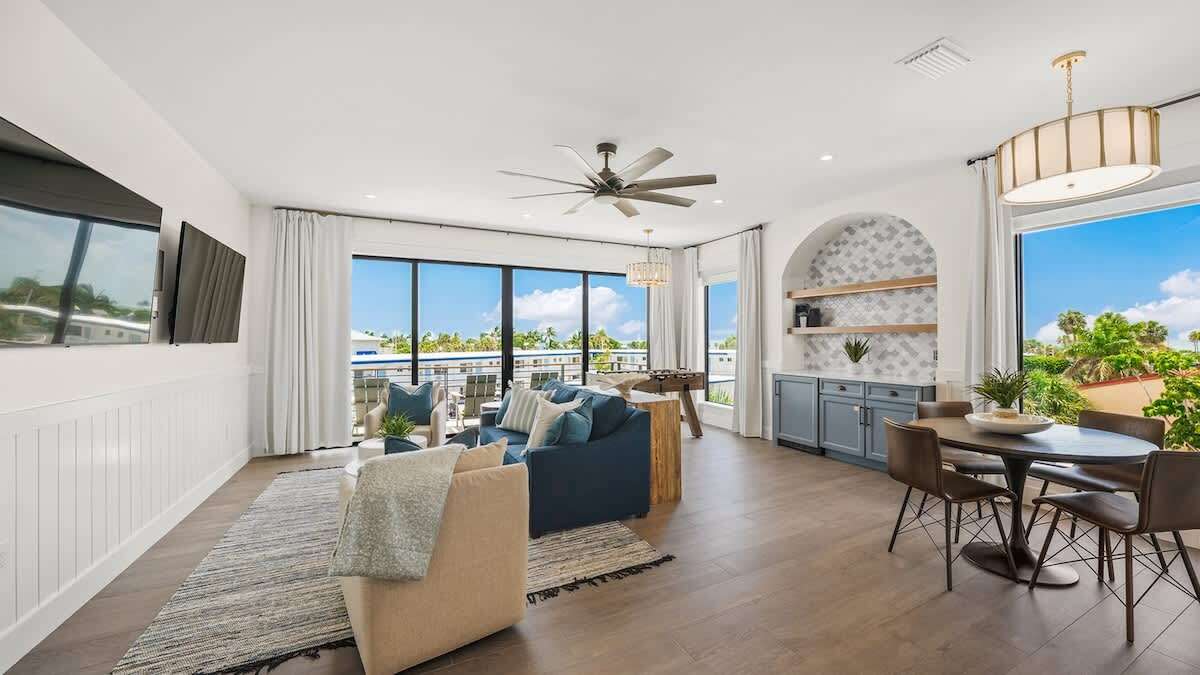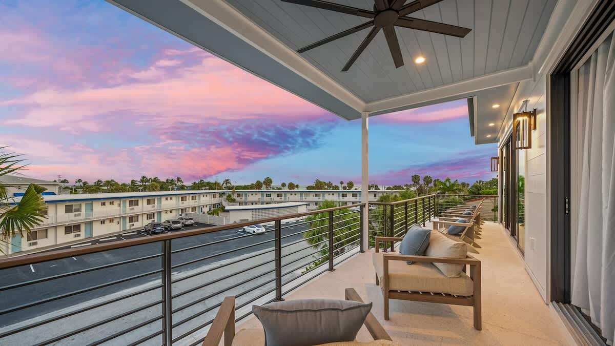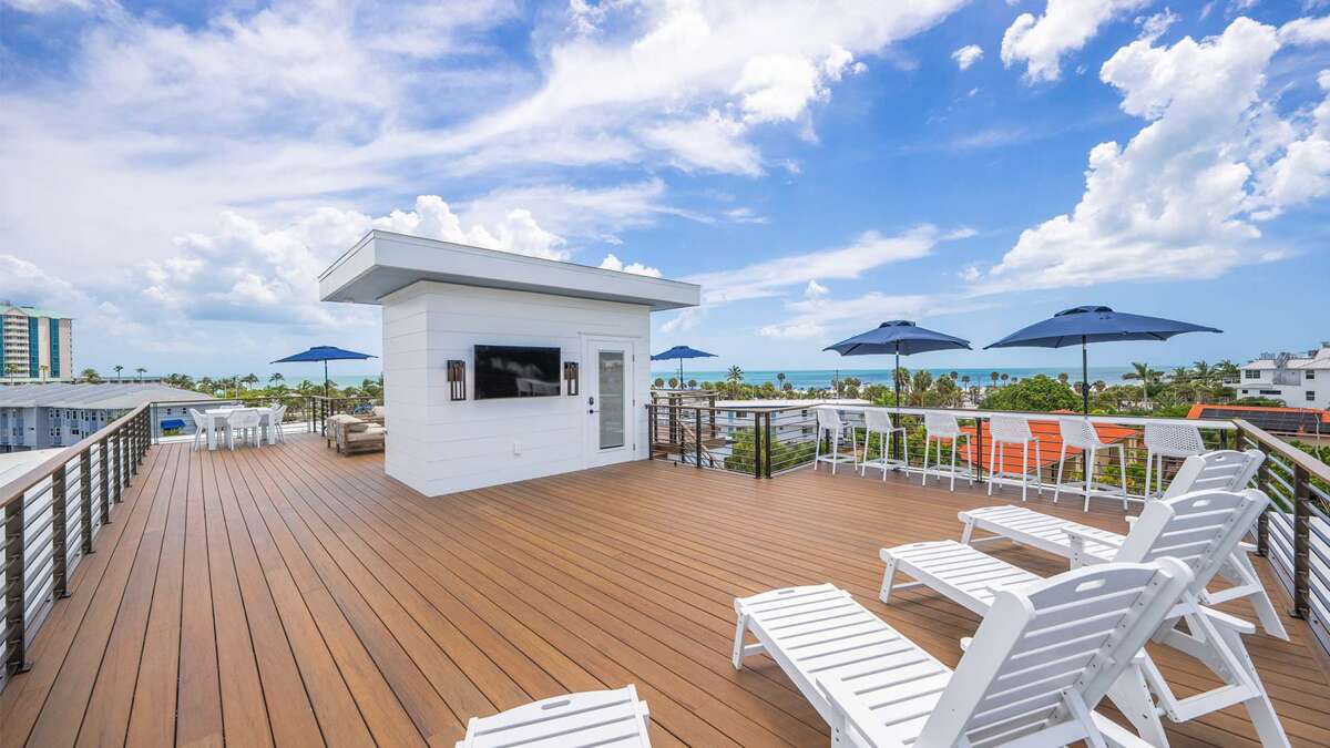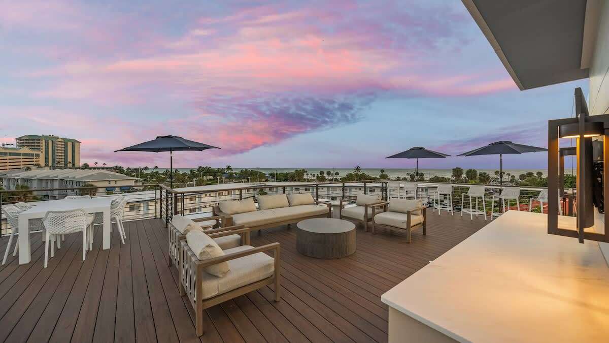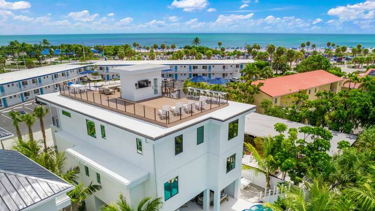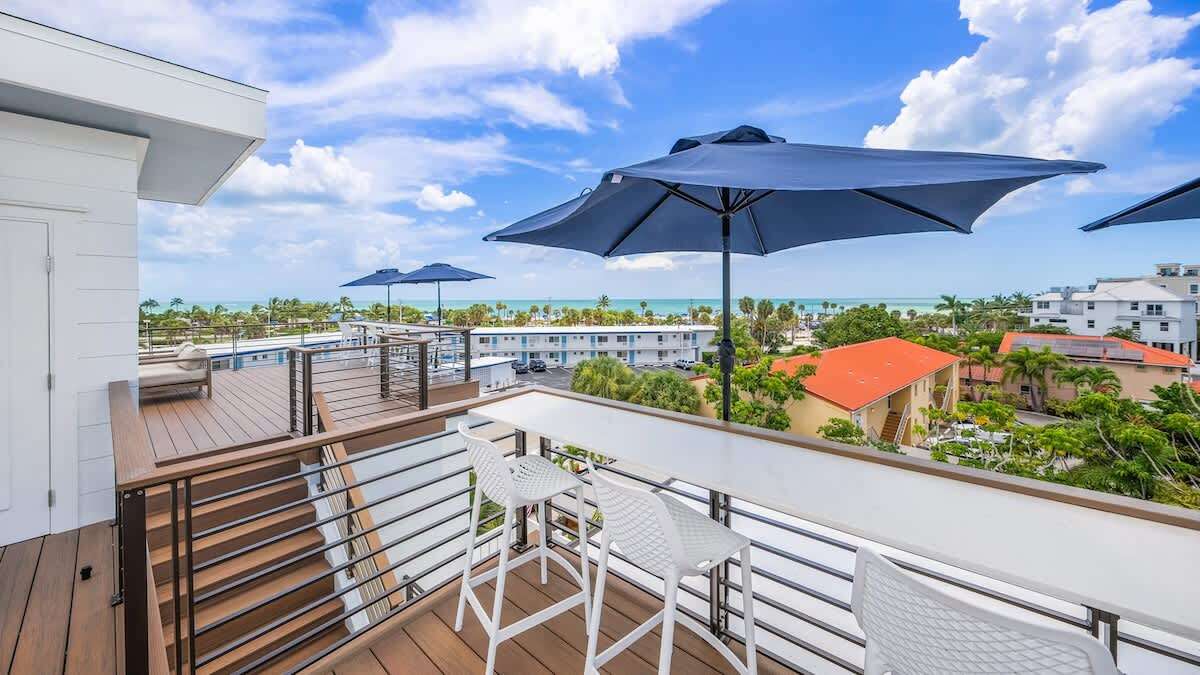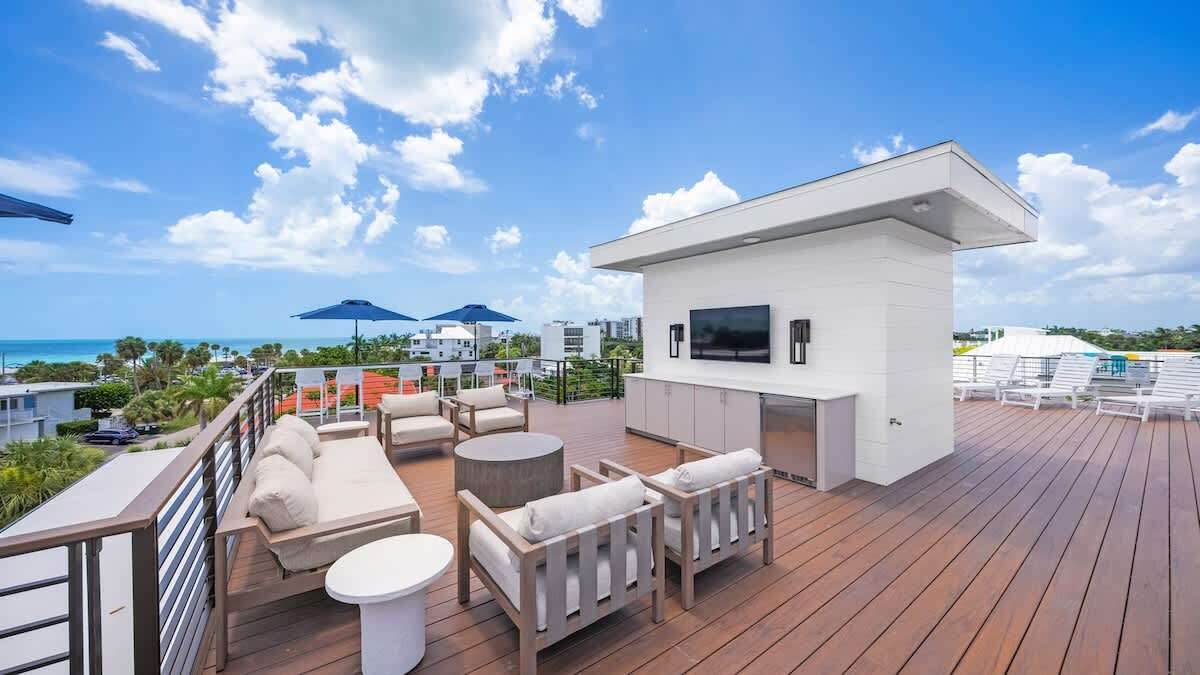 Stunning views can be expected in almost every direction from this elevated outdoor living space. This rooftop is not the norm. It provides a dry bar space, a beverage refrigerator with ice maker, and counter space. There is a smart TV, an outdoor living space, and bar top seating for 8 people along the railing. This elevated living space provides the perfect space for enjoying sunrises and sunsets, and open views of Lido Key, St. Armand's Circle, the Gulf of Mexico, and the downtown Sarasota skyline.