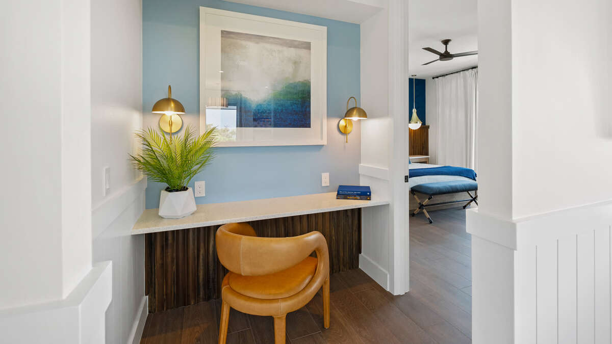 Features the club room. It provides a dry bar, beverage fridge and ice maker, card table, foosball table, a living area with 2 large TVs and gaming consoles - Nintendo and PS4, and a half bath. Like the great room, this club room has immediate access to a large balcony space with seating and provides stunning Gulf of Mexico views. There are also 3 bedrooms on this floor, including the master bedroom. The master bedroom offers Gulf views and a private balcony with seating, and features a king bed, workspace, walk-in closet, a spacious en-suite bathroom with double vanities, large shower and free-standing bathtub, and a private water closet. Bedrooms 3 and 4 feature king beds, en-suite baths, and walk-in showers.