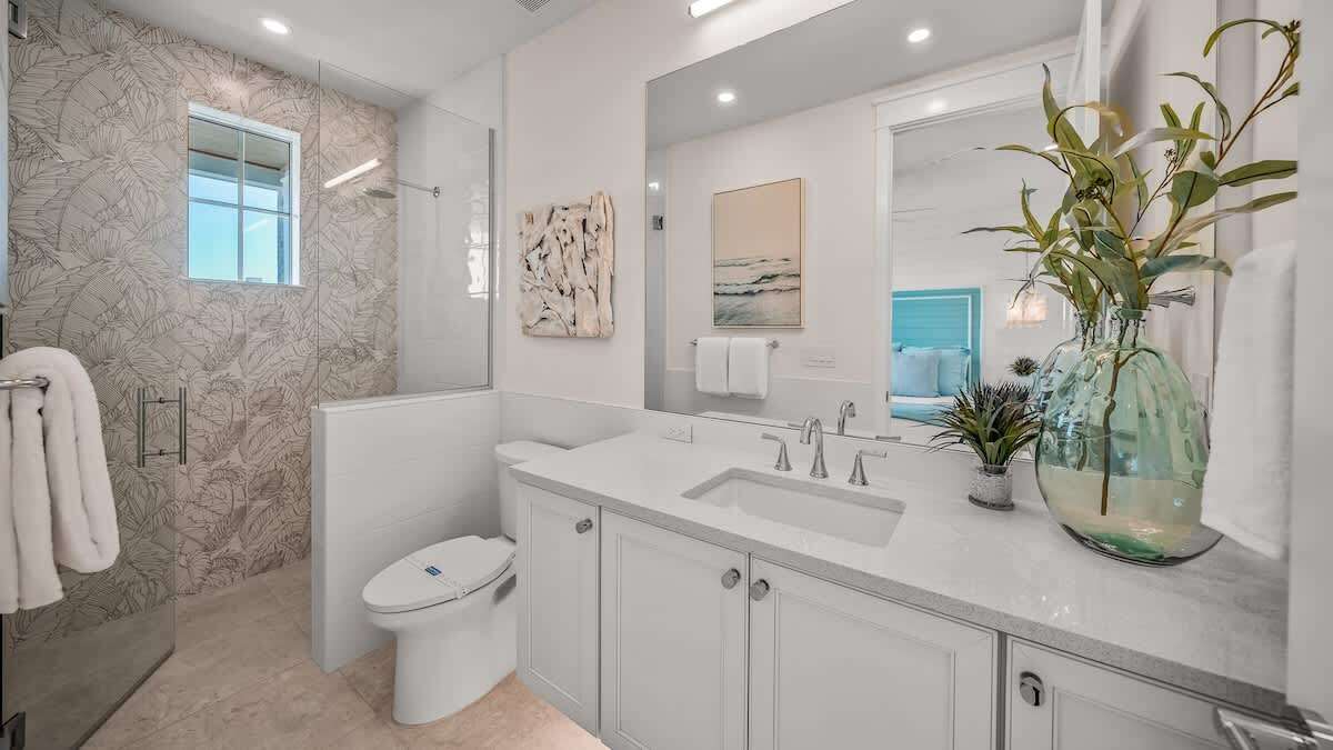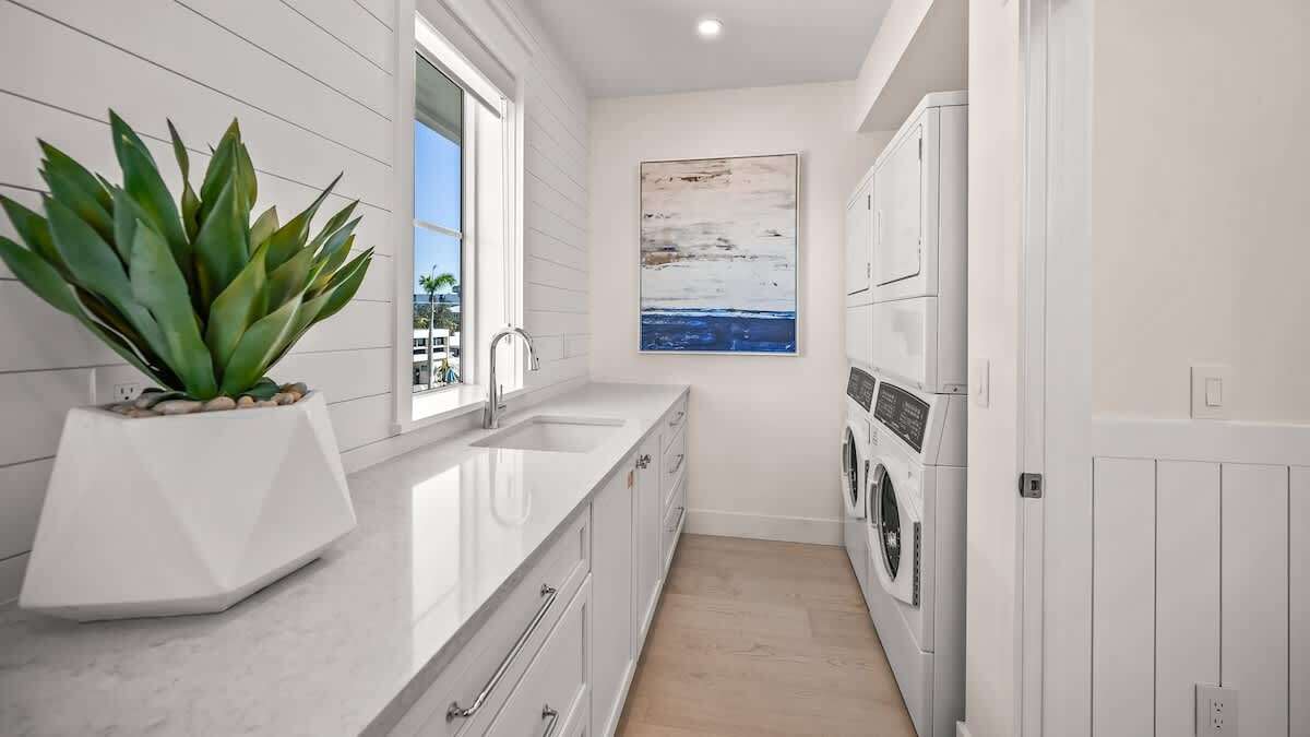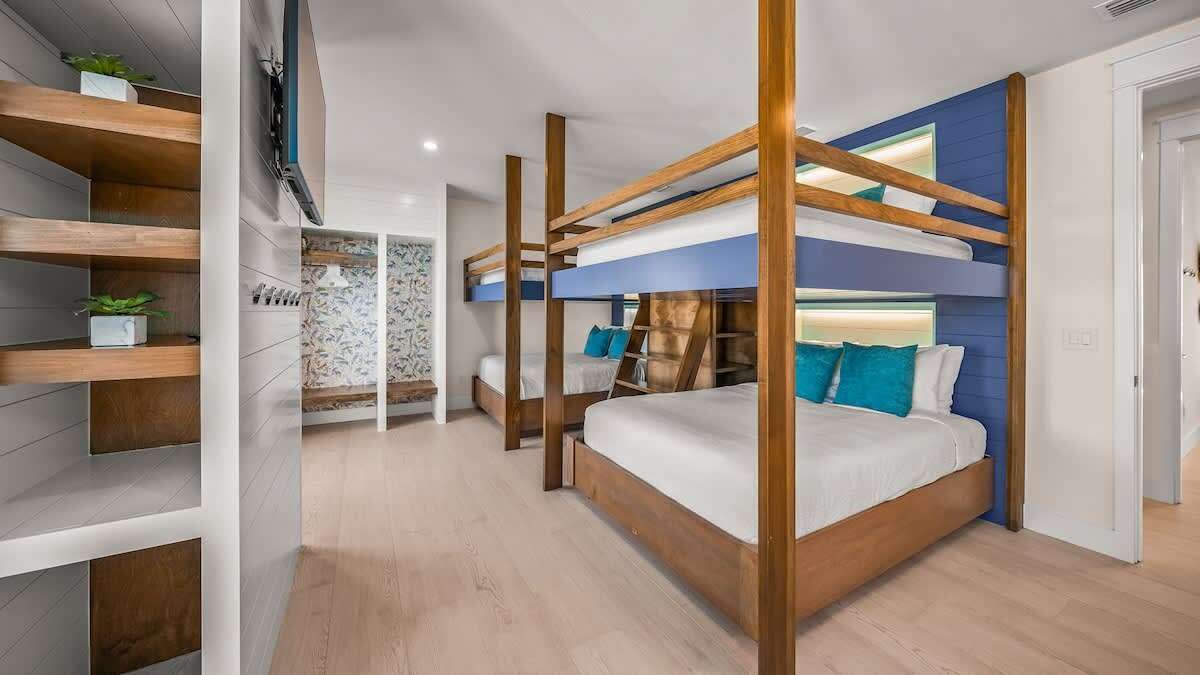 Bedrooms 3 and 4 both have balcony access, a king bed, and an en suite bath with double faucet vanity and walk-in shower. Bedroom 5 has balcony access (with parental safety features), 2 smart TVs, seating, workspace with TVs to connect your computer for dual screens for work or computer gaming, 2 queen over queen bunk beds, city closets, and an en suite bathroom with vanity and shower/bathtub combination. There is also an oversized laundry room on this level with utility sink and 2 stackable washer/dryer units.