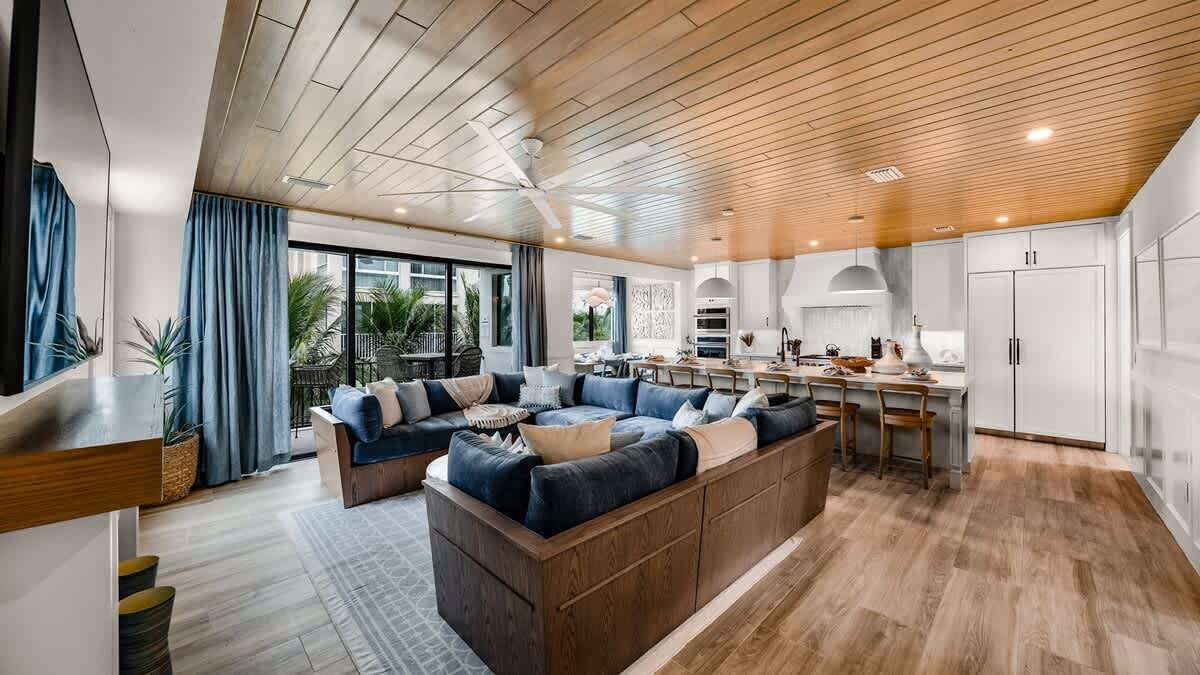 This nearly 3,600 square foot home provides views and balconies on all levels. This home has an elevator with service to all floors (except the rooftop). This home provides 5 bedrooms (all with en suite baths and balcony access), with 2 master bedrooms, and a bunk room that was outfitted to be a kids dream with a rock-climbing wall, smart TV and seating, and arcade and gaming consoles! There are 4 king beds and 2 custom full over full bunk beds in this home; and 5 full baths and 2 half baths. The home comfortably sleeps 14 people in beds. The great room is set up as a family friendly gathering space that includes the kitchen, living, dining areas, and a balcony with additional seating. The kitchen is fully stocked, and we mean that because we know how important it is to you, our valued guests! Not only is it stocked, but it's also stocked with the products and manufacturers you trust. This home also offers a club room or secondary living space with multiple games, wet bar that supports this space, and a balcony with seating that provides access to the home's 50-foot-high rooftop deck!
