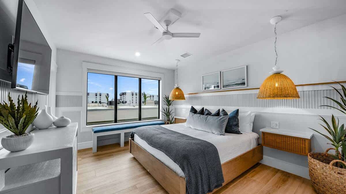 Master bedroom 1 has Gulf views, balcony access, window nook, walk in closet, and a large en suite bathroom with 2 vanities, walk-in double shower, freestanding bathtub, and private water closet. The club room has Gulf views, dry bar, seating, workspace, 2 smart TVs, dining/card table, Wall Scrabble, and PlayStation and Nintendo in this room. The dry bar has a beverage refrigerator with ice maker and trash pull-out. It also has a half bath, and a balcony with stair access to the roof top deck (both with Gulf views). The rooftop deck is perfect for enjoying sunrise over Siesta and greater Sarasota, or sunset over the Gulf of Mexico. So, be sure to grab a book, a coffee or cocktail, and enjoy the sea breeze and Florida sun from this amazing elevated outdoor living space that overlooks all of Siesta Key. These are great indoor and outdoor entertainment spaces!