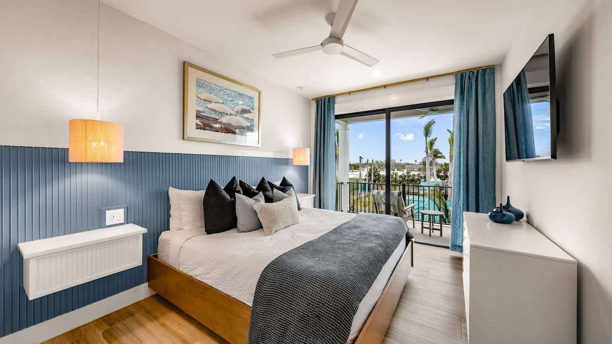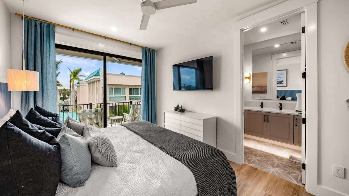 The great room has a fully stocked kitchen that includes a large pantry, cooktop with hood vent, double ovens (2), full sized refrigerator (with ice maker) and freezer, 2 trash and recycling pull-outs, 2 dishwashers, microwave, toaster, coffee maker, and is very well appointed with cookware, bakeware, dishware, cutlery, and specialty items like crockpots, blenders, and more. If you have any questions on kitchen supplies, our reservationists would be happy to provide more details. The living area is very comfortably set up with smart TV and seating, with access to a balcony with additional dining seating. The dining area here seats 14 people comfortably via a 8-person custom dining table, 6-person kitchen island bar top. Master bedroom 2 has double -Juliet balconies' accessed from the bedroom and bath, a king bed, and an en suite bathroom with double faucet vanity and walk-in shower. There is a half bath on this floor.