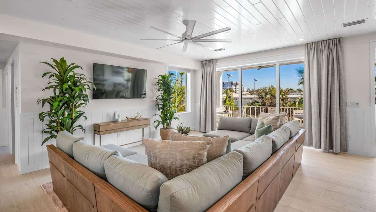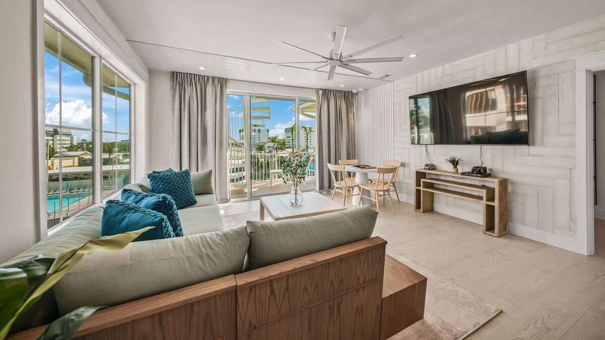 In Home A, the fully stocked chef’s kitchen includes a large pantry, cooktop with hood vent, dual wall ovens, full-size refrigerator with ice maker, freezer, two dishwashers, microwave, coffee maker, toaster, blender, crockpot, and extensive cookware and serve ware. Guests can dine together at the 8-person dining table or the 6-seat kitchen island. The adjacent living area offers plush seating, a large smart TV, and balcony access for enjoying the Gulf breeze.