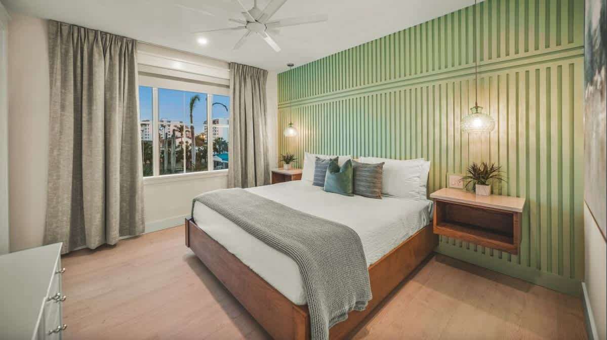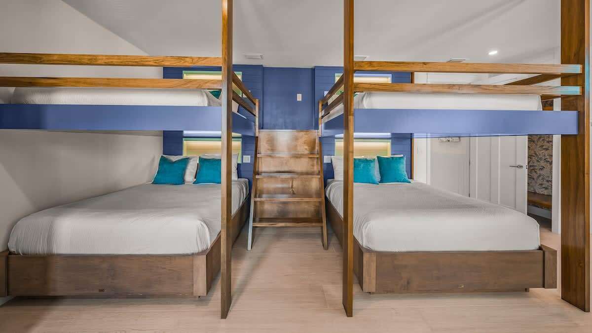 In Home B, Bedrooms 3 and 4 echo the same upscale design, each with a king bed, en suite bath, and private balconies with peeking Gulf views. Bedroom 5 is another children’s favorite with two full-over-full bunk beds, a rock-climbing wall, a cozy seating area with smart TV, and a fun layout designed to entertain. Its en suite bath includes a combination tub and shower.
