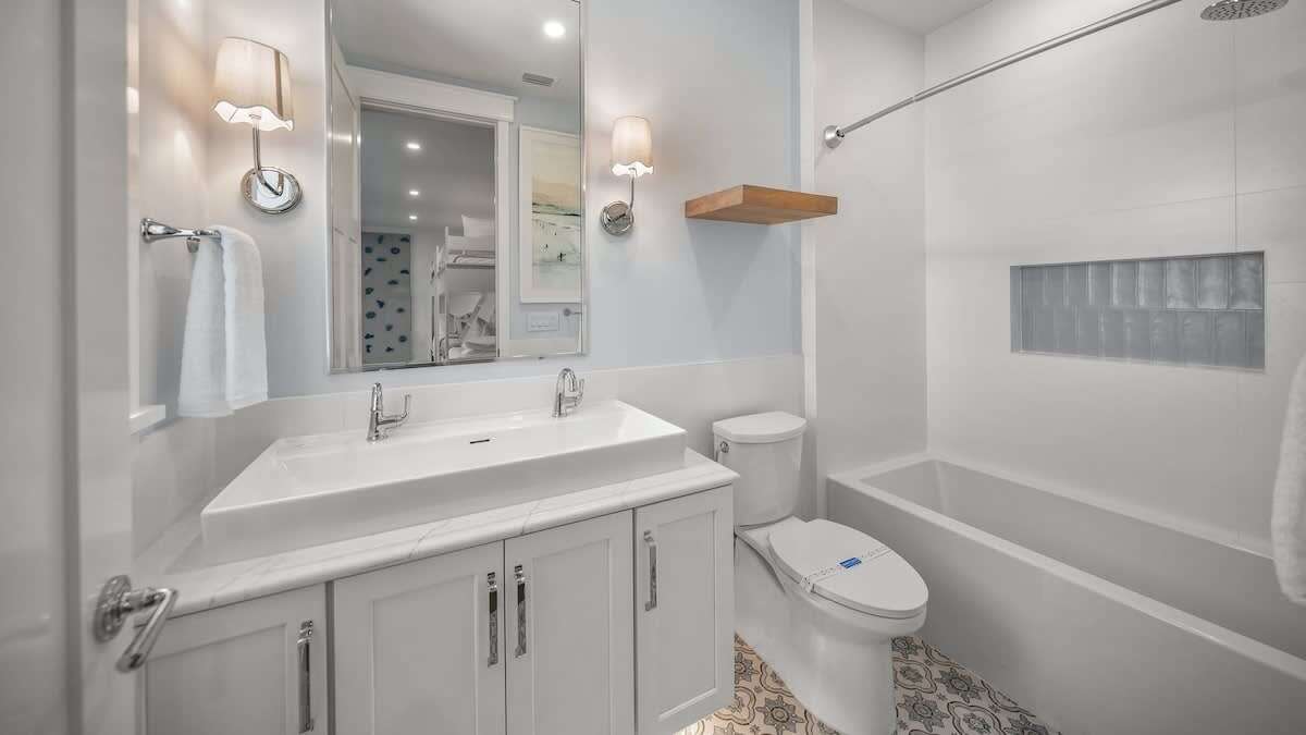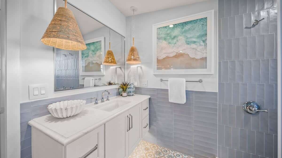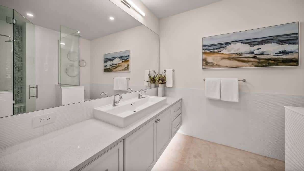 Each home also includes a king-bedroom on this level. Master Bedroom 2 in both homes features a king bed, dual Juliet balconies (one from the bedroom, one from the en suite bath), and a luxurious en suite bathroom with a walk-in shower and double faucet vanity with trough sink. A convenient half bath is also located in each home on this level.