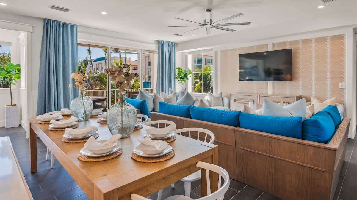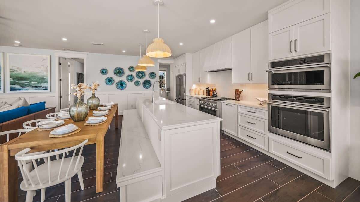 Home B mirrors these high-end finishes and appliances. The dining area seats 13 total guests with space for eight at the table and five at the island. Both homes’ open-concept layouts ensure everyone remains connected—whether preparing meals, watching a movie, or enjoying happy hour outdoors.
