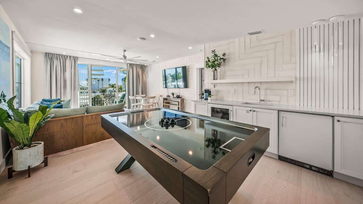 In Home B, the club room includes shuffleboard, Golden Tee arcade, dual smart TVs, and a workstation—along with a wet bar and beverage fridge. A half bath and stairway lead directly to the rooftop deck. These rooftop spaces are ideal for coffee at sunrise or cocktails at sunset, with panoramic views stretching across Siesta Key and the Gulf of Mexico. Outfitted with bar-top counters, smart TVs, umbrellas, and comfortable seating, these elevated retreats are unforgettable highlights of the estate.