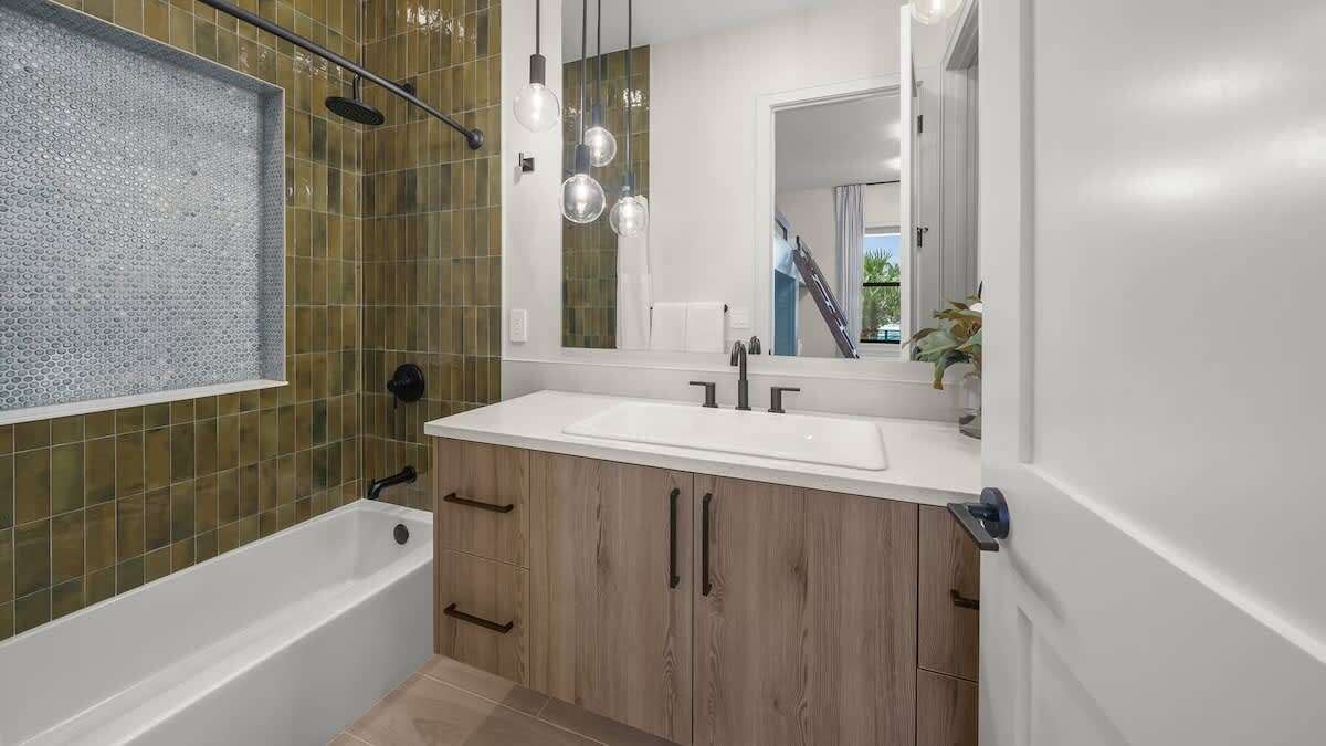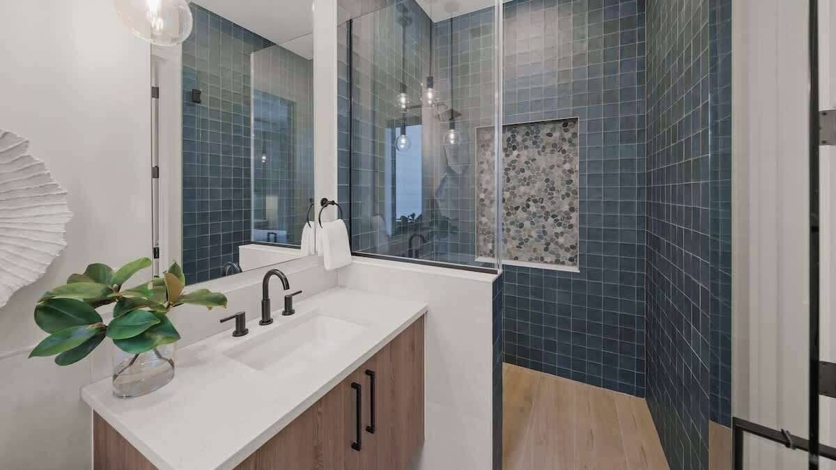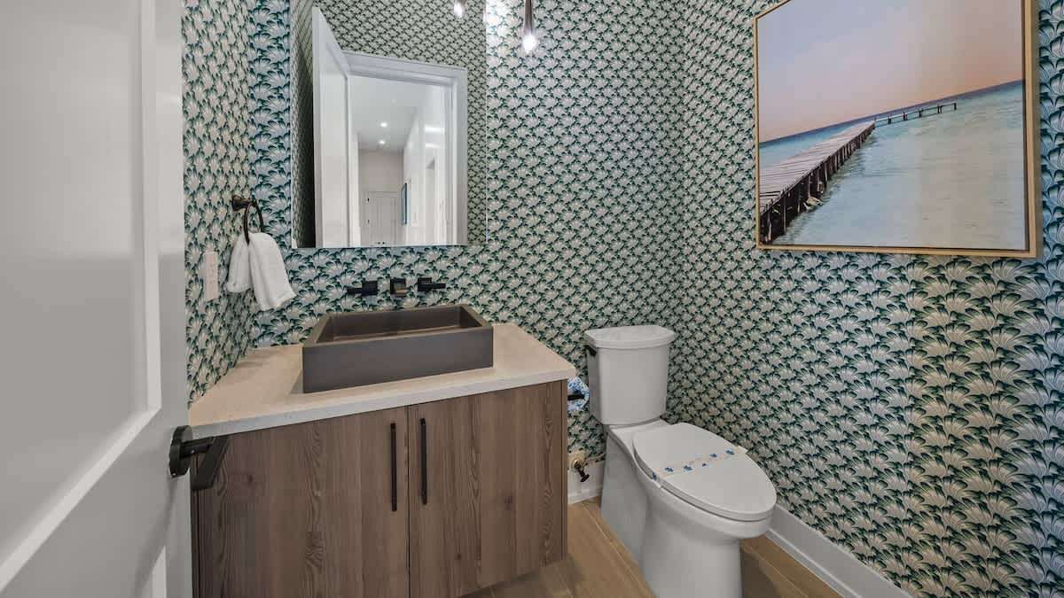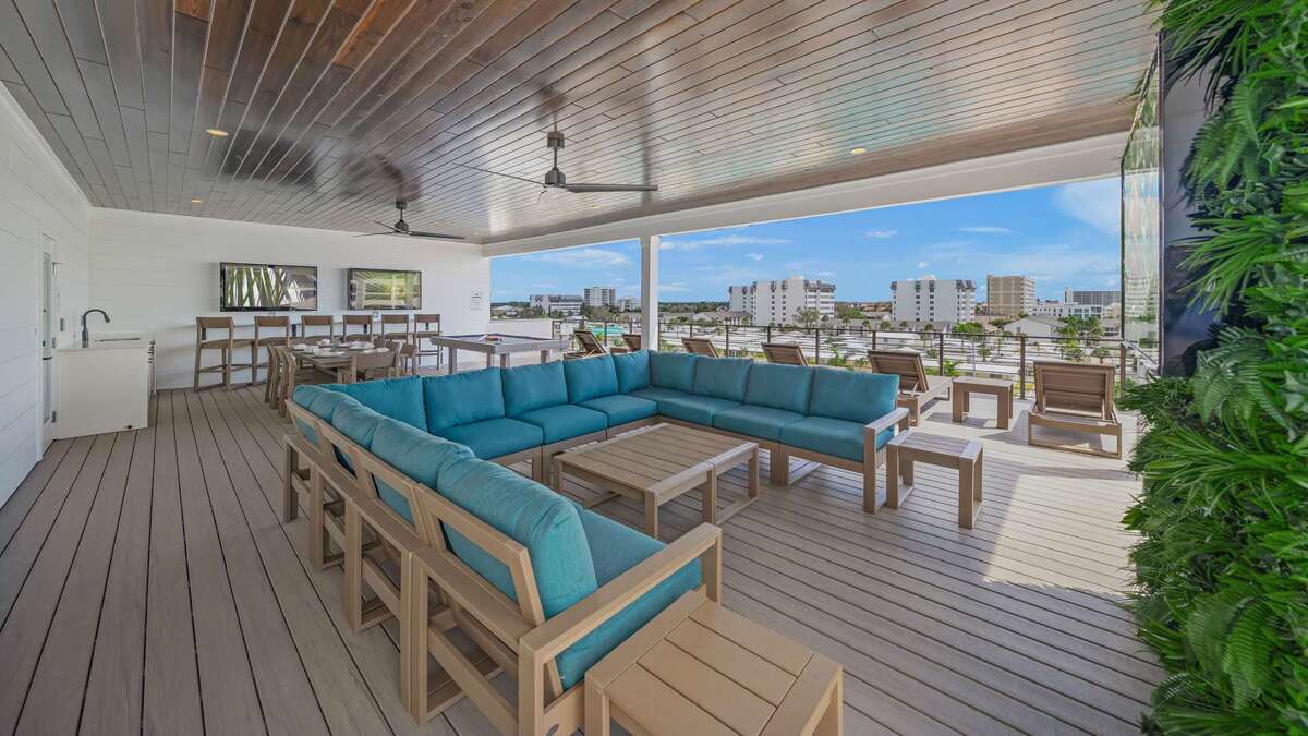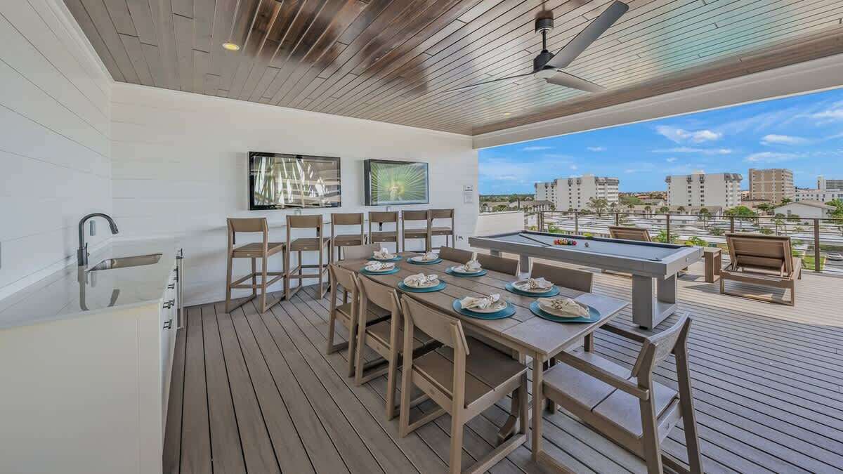 At the top of the estate awaits the crown jewel of the home: a rooftop deck that transforms entertaining into an experience by combining panoramic views, amenities, and thoughtful design into something unforgettable. This space includes a covered rooftop patio with seating for 11, an outdoor rated billiards table, and a large TV nestled into a lush faux greenery wall. It also offers an outdoor kitchen complete with a grill, beverage fridge and ice maker, sink, trash pull-outs, bar seating for 6, dining table seating for 8, and 2 more TVs. Outside of the covered rooftop space you'll find 6 loungers with side tables perfectly arranged for maximum sun exposure, as well as corn hole boards and a half bath.