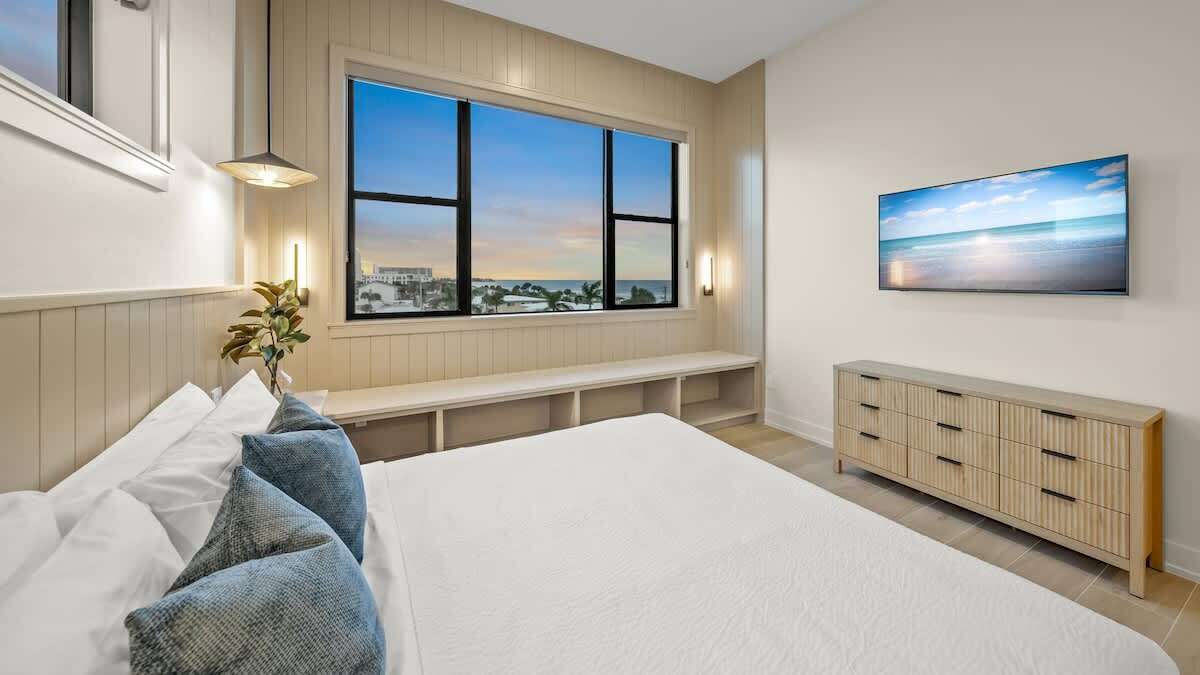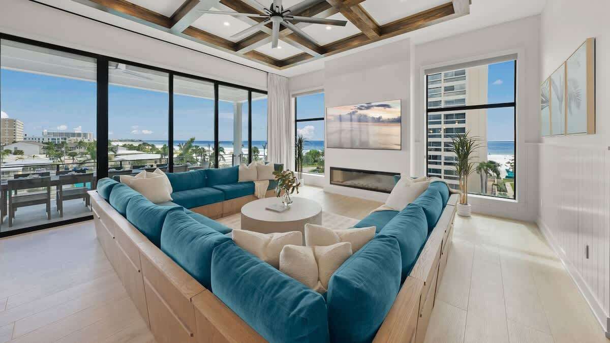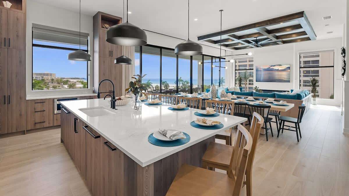 This level includes the heart of the home, the great room, with wide open and jaw dropping Gulf and Siesta Key Beach views! The kitchen is a chef's dream, fully outfitted with a 48-inch range, double wall ovens, a microwave drawer, 2 dishwashers, and a large island with bar seating for 7. With a coffee/beverage bar, and the adjacent pantry including a full-size refrigerator, sink, trash pull-out, and food storage, this kitchen is fully stocked! The dining space includes a large table accommodating 14 people and offers remarkable seated views. The living room offers the same amazing Gulf views, and a TV, an oversized custom modular sofa that comfortably seats 11, an electric fireplace for ultimate comfort. Adjacent to, and expanding the great room, is a large balcony, which is furnished with a dining table for 14, soft seating for 5, and a large TV - All overlooking the Gulf and Beach. Accommodations on this level include Bedrooms 6 and 7, both offering balcony or Juliette balcony access, Gulf views, a king bed, storage and closet(s), and an en suite bathroom with vanity and walk-in shower. The second master bedroom is also on this level, offering Gulf views, a king bed, a built-in bench and storage area, walk-in closet, and an en suite spa-style bathroom with a double vanity, a wet room with freestanding tub, and a stackable washer and dryer. A half bath is also located on this level.