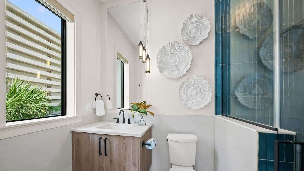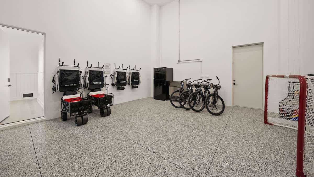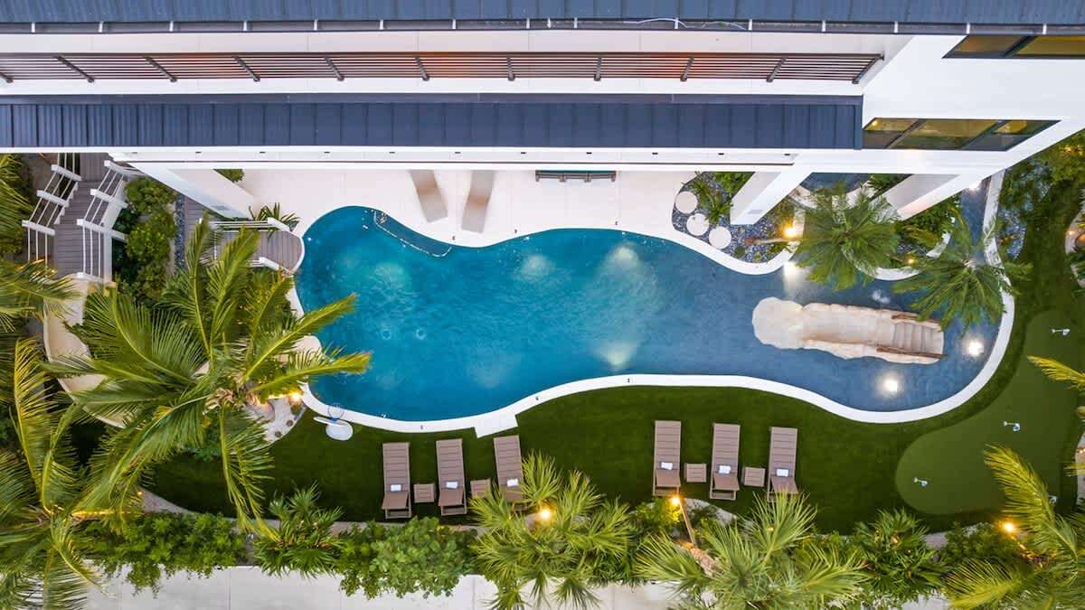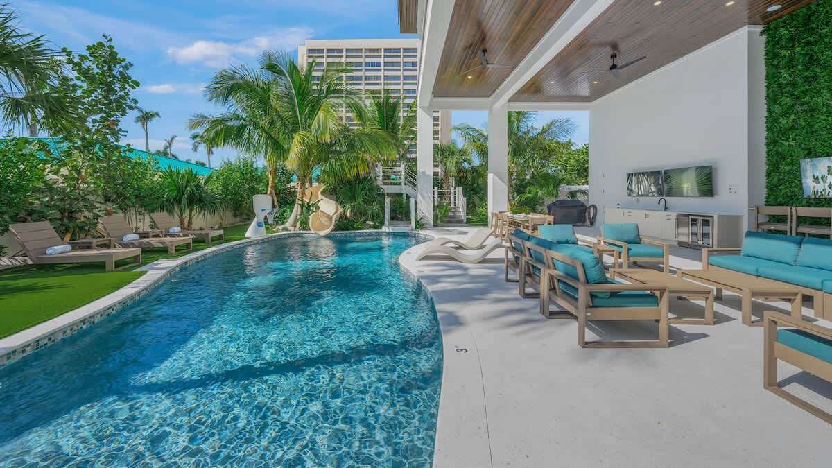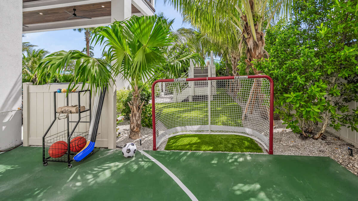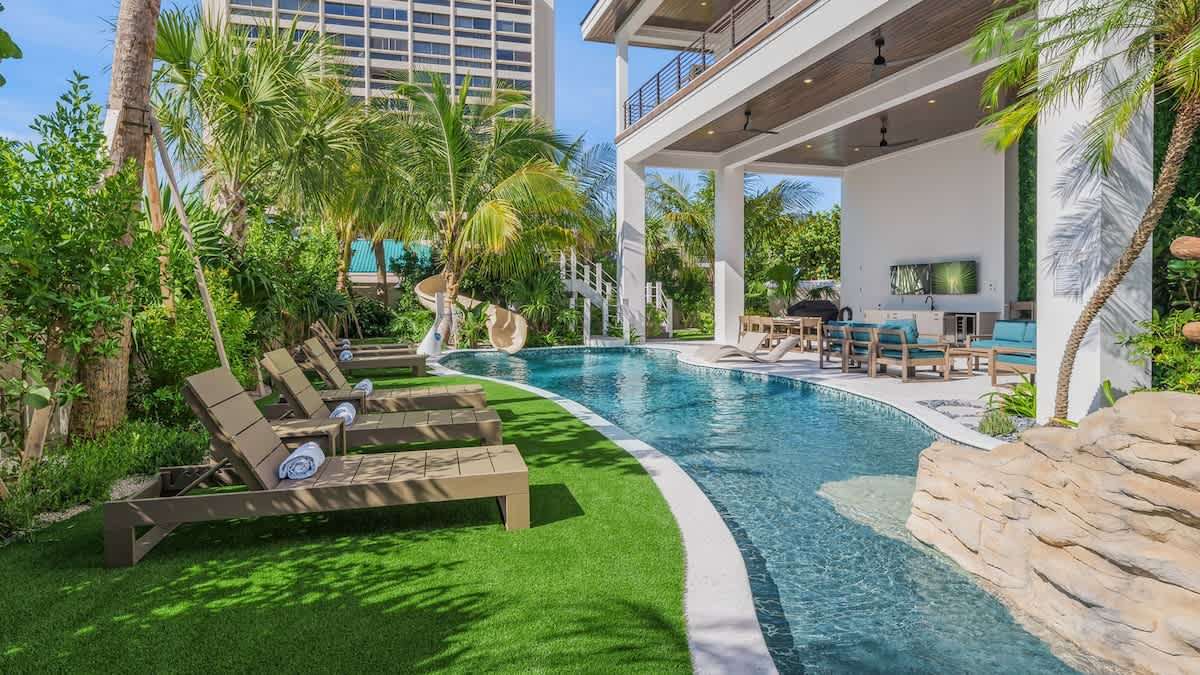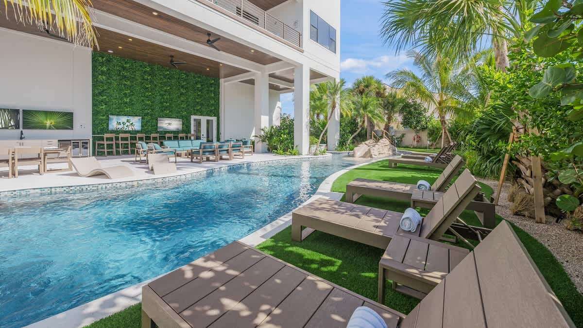 The ground level of this luxury home has been curated for entertainment and functionality, creating the ideal space to vacation better! Guests are greeted with a private entry foyer with staircase and elevator access to all levels above, including the rooftop deck. There are also 2 garages for covered parking (EV charger equipped) in addition to driveway parking provided. The home's beach gear is also stored here, including bikes, beach wagons and chairs, alongside a convenient fridge and freezer combination. From there, you'll step out to your private back yard oasis surrounded by lush native landscaping. The center piece of this level is the custom-designed, resort-style, heated saltwater pool and spa, featuring 2 waterslides: 1 for teens and adults and 1 for small children and toddlers as well as a poolside basketball hoop. Enjoy soaking in the sun, meals, and cocktails at multiple seating areas including 8 chaise loungers, soft seating for 10 people, and dining areas that accommodate 21. The outdoor kitchen includes a grill, sink, beverage fridge with ice maker, and ample countertop space. 4 TVs are placed throughout the covered pool patio and nestled into the -greenery wall' for seamless viewing and natural elements from all angles. A private sports court provides a space for activities like basketball, hockey, and soccer with provided equipment. There is also a putting green near the pool for additional entertainment.