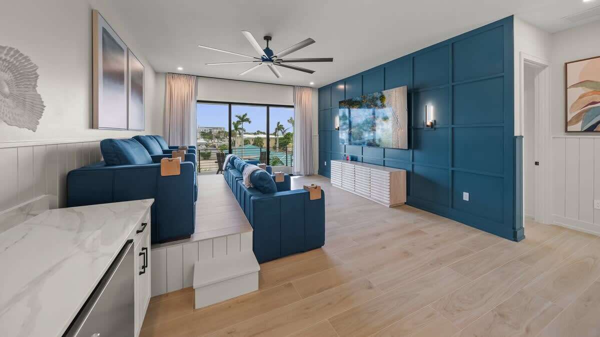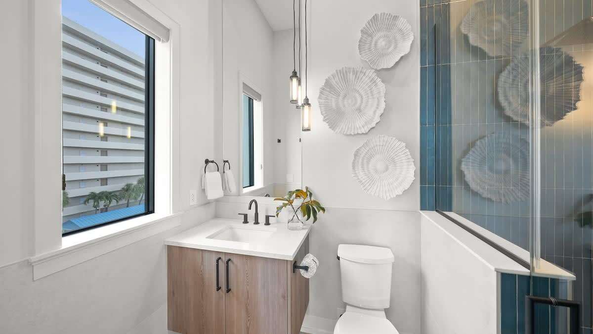 This level sets the tone for relaxed entertainment and restful nights. At its center is the club room, a cozy retreat that includes theater seating for 6, card or board game table for 4, and a media center with 80+ TV with Surround Sound for the perfect movie night. Off the club room you'll find a private balcony perfectly furnished with seating for 11 and a large TV. This outdoor living space is perfect for sunset cocktails or early morning coffee. Accommodations on this level include Master Bedroom 1, which features a king bed, balcony access, Gulf views, a walk-in closet, and a spa-style en suite bath with a double vanity and a wet room with double shower and freestanding bathtub. Bedrooms 3, 4, and 5 offer balcony or Juliette balcony access, Gulf views, a king bed, storage and closet(s), and an en suite bathroom with vanity and walk-in shower. Bedroom 8 is the homes Bunk Room, offering Gulf views, two full-over-full bunks, TVs for each bottom bunk + wall mounted TV for the room - with a Nintendo Switch gaming console, a workstation area and window bench, a closet, and an en suite bathroom with trough sink and dual faucets, and a shower bathtub combination. A half bath, and laundry room with 2 stackable washer/dryer units, are also located on this level.