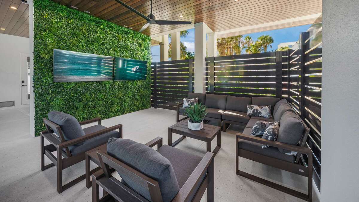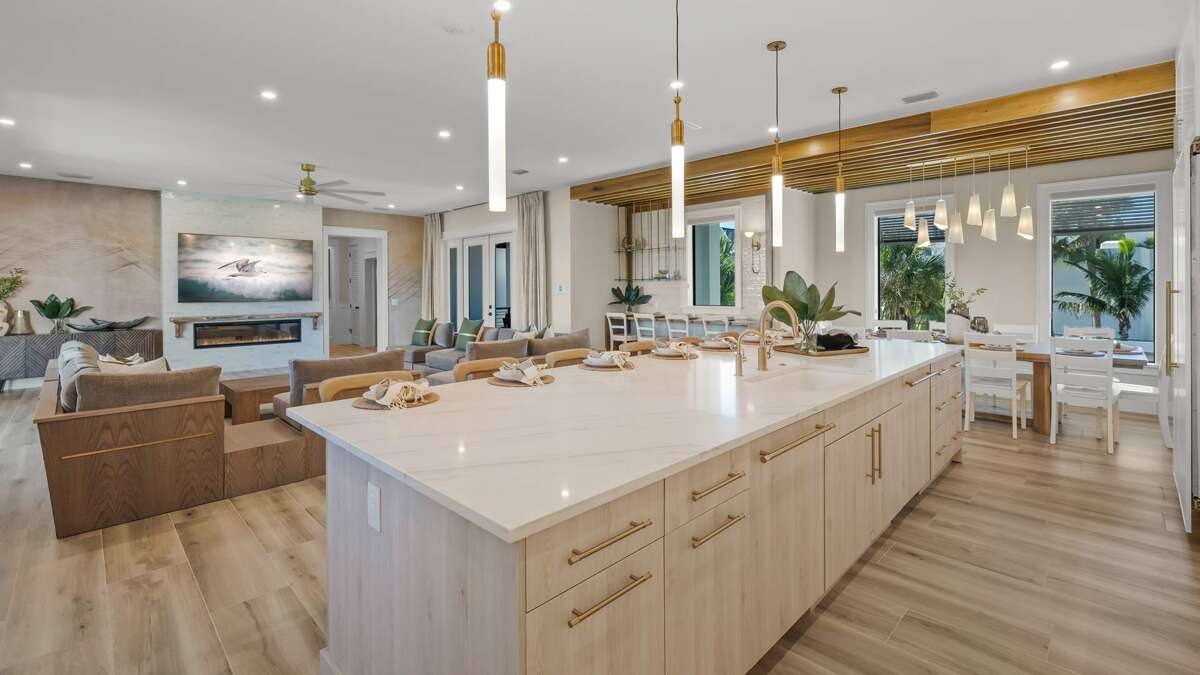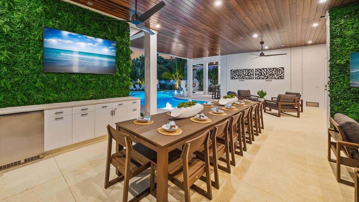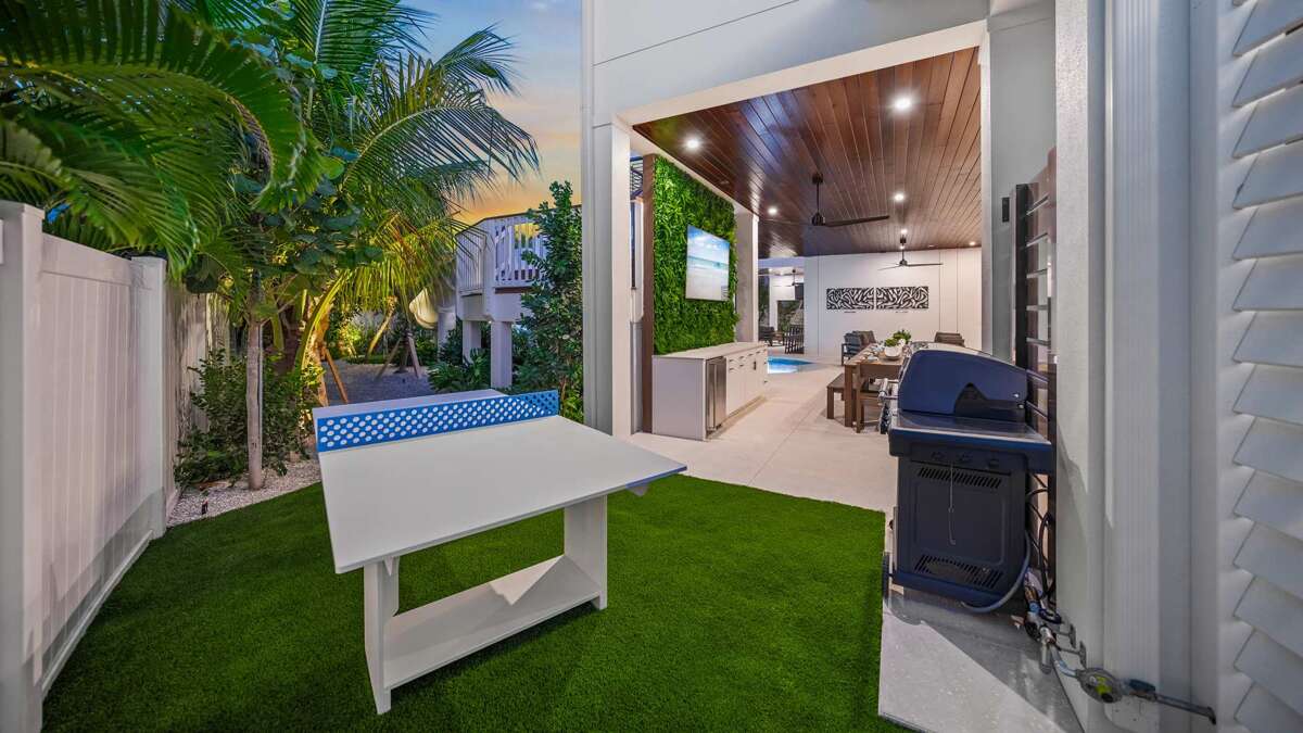 Outdoors, you’ll find a private resort-style pool with a sun shelf and ample chaise loungers for in-water and pool side seating. Just steps away, a Putt-Putt green, ping pong table, and ring toss provide active entertainment options. The covered pool patio offers an extensive array of seating featuring soft seating accommodating up to 14 people, a dining area that accommodates 14, and bar seating for up to 6. The outdoor kitchen includes a grill, beverage fridge with ice maker, and ample countertop space storage with drawers and cabinets. 3 TVs are placed throughout the covered pool patio for seamless viewing from all angles.