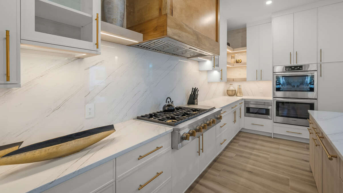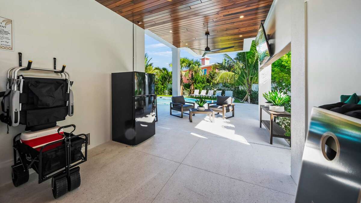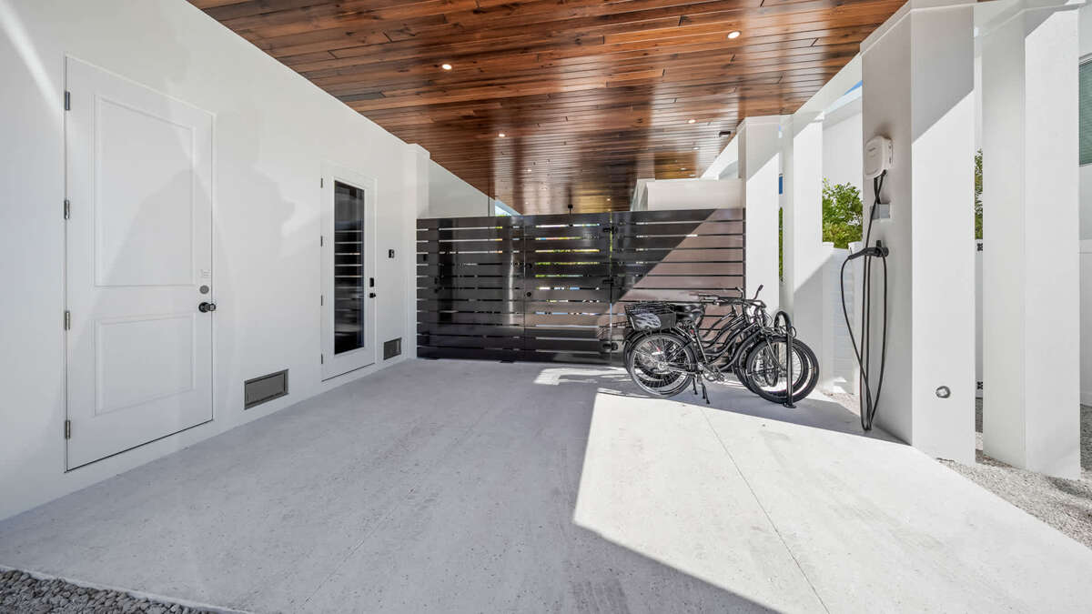 Guests are greeted with a private entry foyer with staircase and elevator access to all levels above, including the rooftop deck. There are also 2 garages for covered parking (EV charger equipped) in addition to driveway parking provided. The home’s beach gear is also stored here, including bikes, beach wagons and chairs, alongside a convenient fridge and freezer combination.