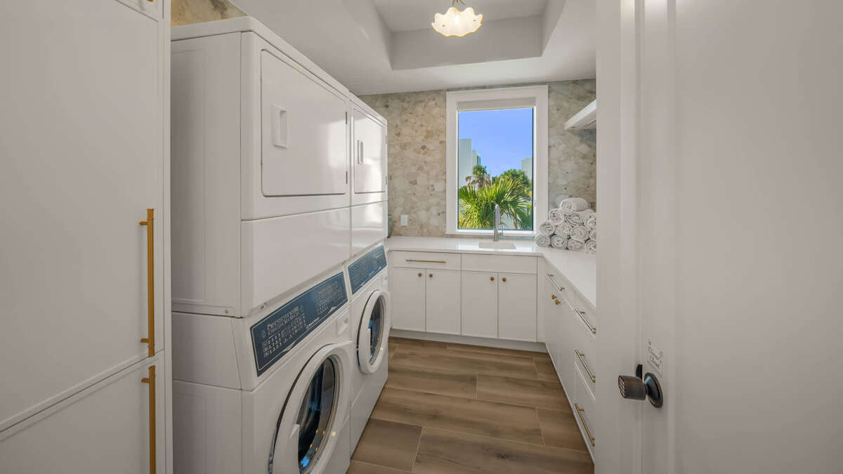 This level was designed for both restful retreats and social fun. The Club Room includes a billiards table, built-in bar with beverage fridge and ice maker, lounge seating for 6, a built-in desk for remote work or reading, and soft seating on two balconies — including a swing style daybed, club chairs for shade lounging with peaking gulf views. A second laundry area with two stacked washers and dryers, folding space, rod, and utility sink adds practicality for large groups.
