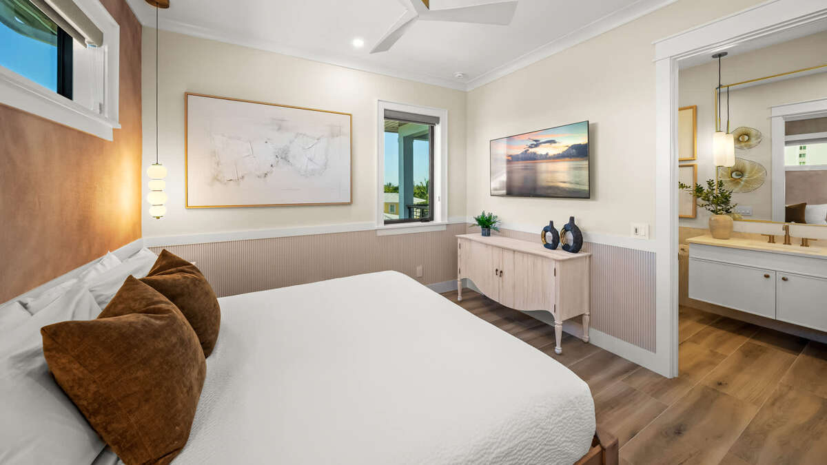 This level also houses four bedrooms, including the home’s Bunk Room. Bedrooms 3, 4, and 5 offer a king bed, en suite bath with a walk-in shower and vanity. Bedrooms 4 and 5 have private or shared balcony access with soft seating and sweeping views. Bedroom 6 is the Bunk Room and features a twin-over-twin bunk and a queen-over-queen bunk, plus an open closet system, a single sink vanity, and a bathtub/shower combo.