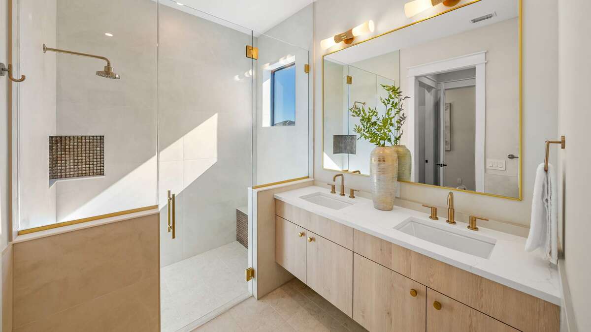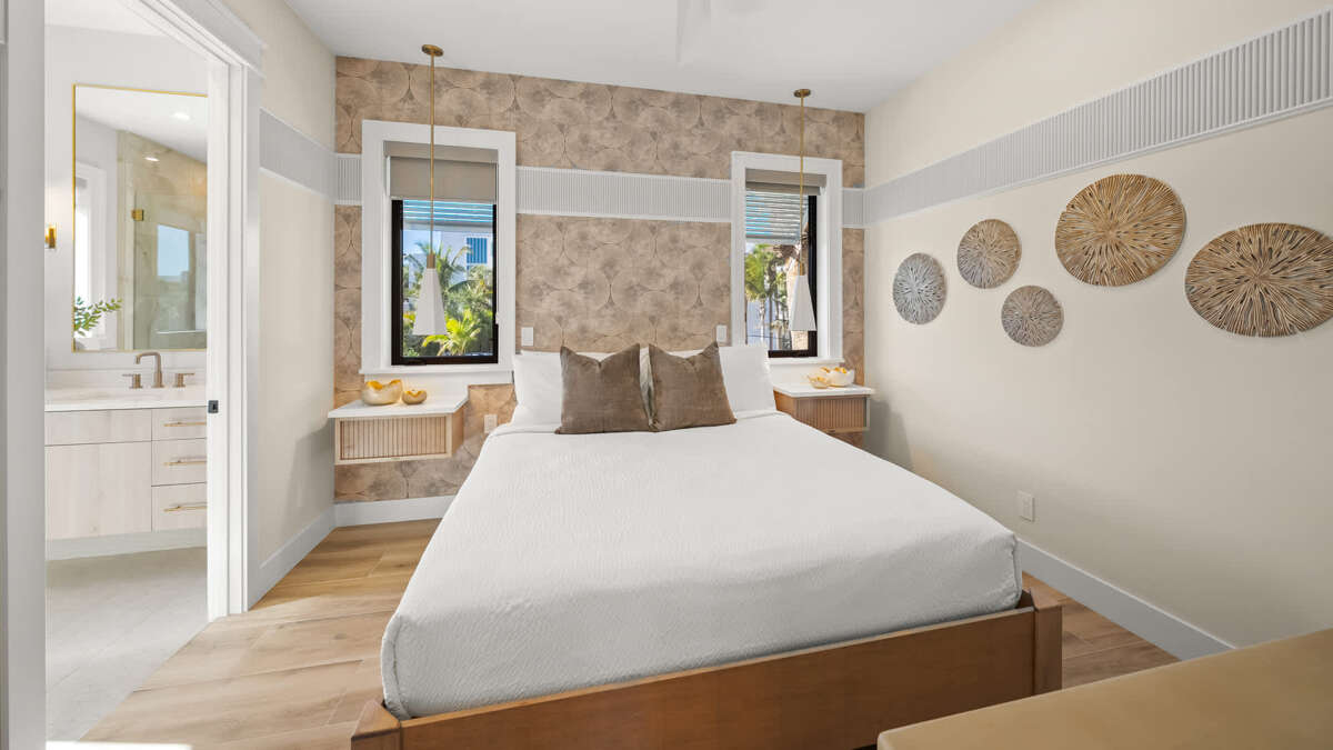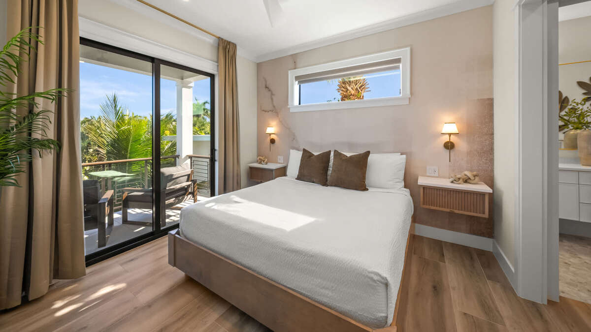 This level includes two private King bedrooms, Master bedroom 1 and bedroom 2. Master Bedroom 1, which features a king bed, walk-in closet, en suite bath with double sink vanity, a freestanding tub in shower, and access to its own private balcony with soft seating for two. Bedroom 2 features a king-size bed, walk-in closet, en suite bath with single sink vanity and walk-in shower.