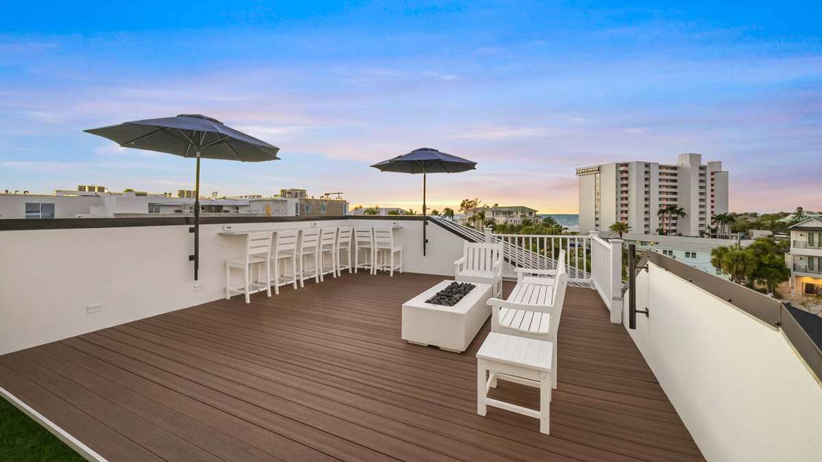 The Overlook has a stunning rooftop deck, designed to elevate your vacation experience. This stylish space includes a covered lounge area with bar seating for 7, soft seating for 4, and a fire pit table surrounded by plush chairs. A built-in bar area below the outdoor TV includes a beverage fridge with ice maker, trash storage, and cabinetry. Railing-style umbrellas provide shade, while thoughtful design ensures everyone has a seat with a view. Whether sipping sunset cocktails, enjoying a game of cornhole, or watching the game under the stars, this rooftop retreat is the ultimate place to gather and unwind.