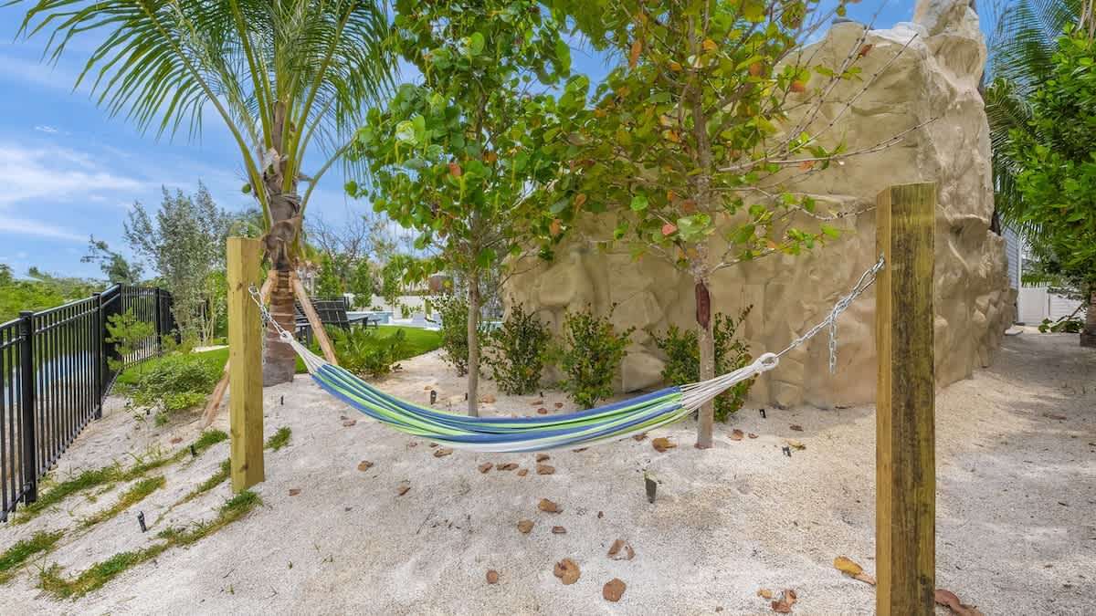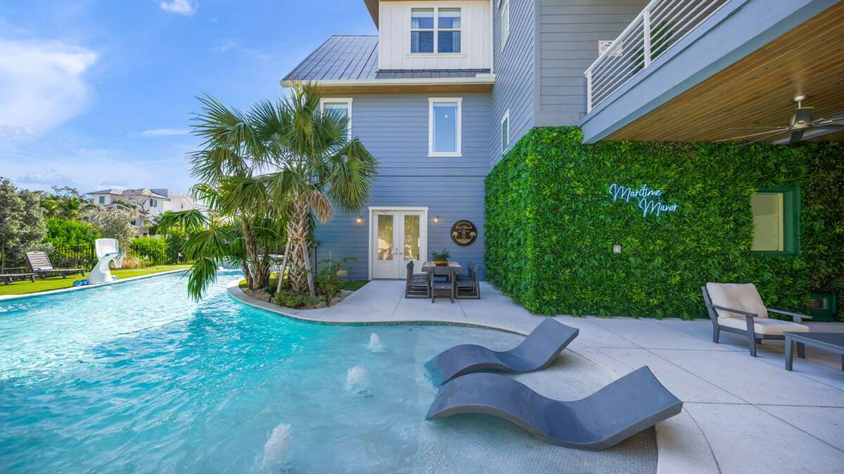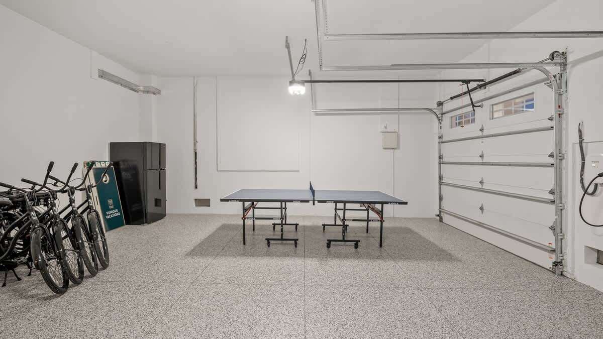 The main staircase and elevator access to all levels is here, along with free parking for up to 6 vehicles (2 covered and 4 uncovered). In the garage, you’ll find the beach equipment provided, 2 beach wagons, 2 coolers, 6 bikes, and 10 beach chairs. We also include a full refrigerator and freezer (with ice maker) here as well so your beach prep and breakdown, and your use of the home and pool is that much easier. The backyard area (pet friendly – fees and restrictions apply) is fully fenced and includes the resort style pool, covered patio area, pool patio, and the club room with climbing wall, golf simulator and theater, TVs and more that were all listed above in the initial summary. Ping Pong is also located here.