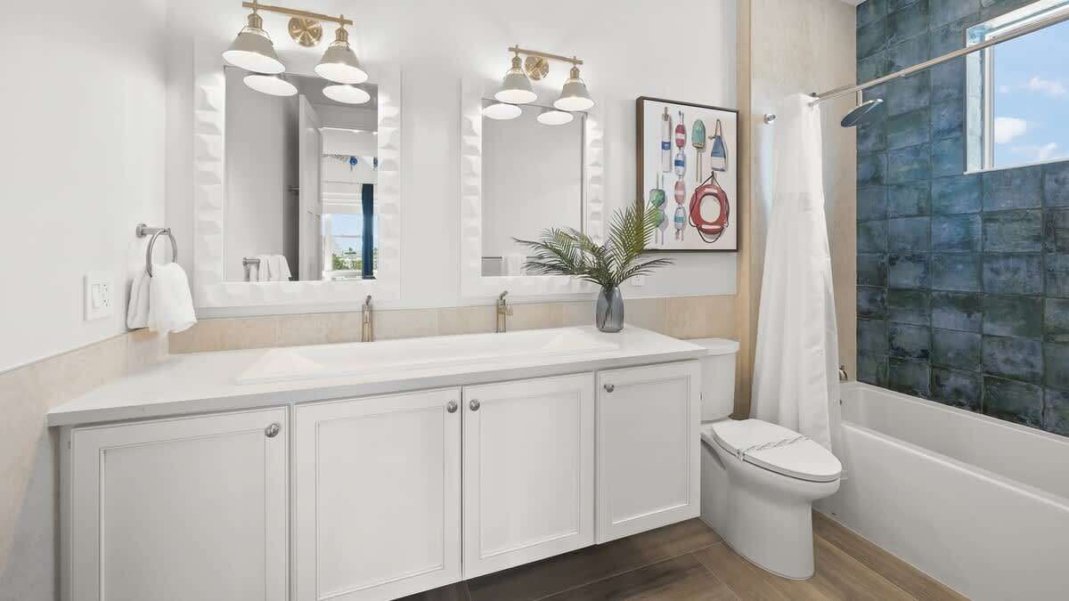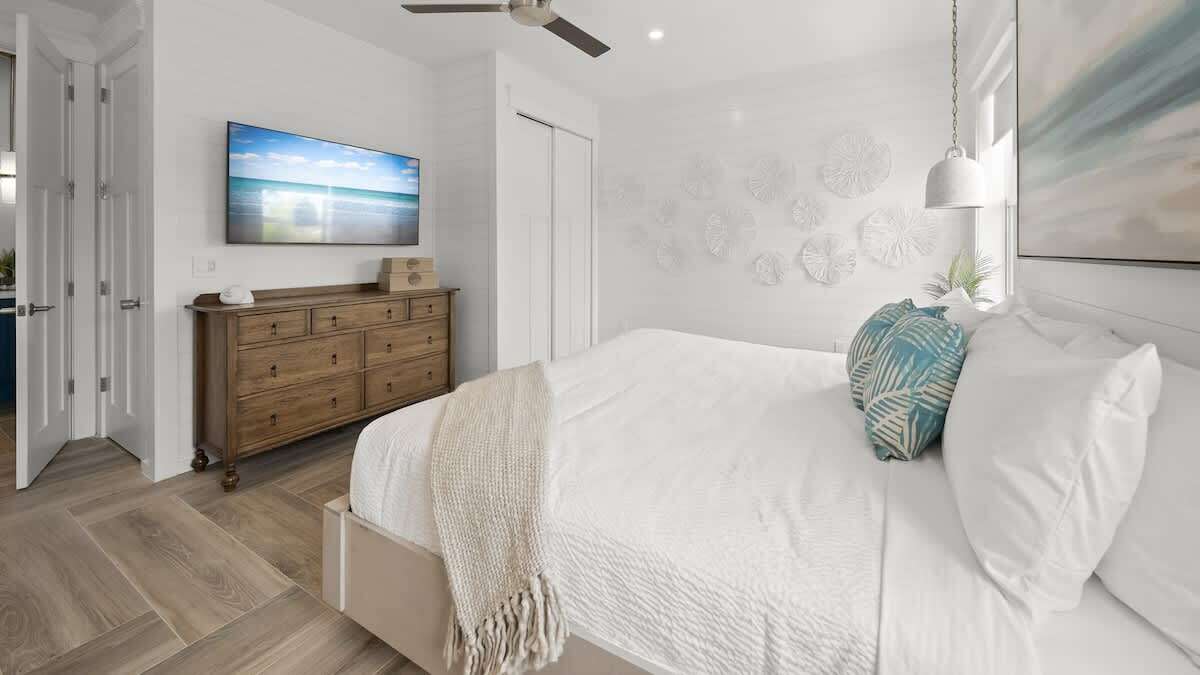 The home’s great room is on this level with the fully stocked kitchen that includes a pantry with refrigerator and freezer drawers, 4-burner cooktop with exhaust hood vent, double oven, full sized refrigerator and freezer (with ice maker), nugget ice maker, 2 sets of trash and recycling bins, 2 dishwashers, microwave, toaster, coffee maker, and more. The kitchen is very well appointed with cookware, bakeware, dishware, cutlery, and specialty items like crockpots, blenders, and more. Whether you’re cooking for the family, or you’ve hired a private chef or caterer, this kitchen has everything to support you! The interior dining area has a dining table for 10, plus bar seating for 8 at the kitchen island, and balcony dining options for 14. The living room provides comfortable custom furniture and a media center (80” + TV), and a dedicated workspace or office. Bedrooms 1-5 are on this level. Bedroom 1 is the home’s second master bedroom. It overlooks Sabal Lake and the pool area. It provides private balcony access, a king bed, closet, and an en suite bath that includes an oversized double vanity, a large shower with free-standing bathtub, and private water closet. Bedrooms 2-5 are king suites that feature a king bed, closet, and an en suite bathroom with vanity (some have double vanity) and walk-in shower. Bedrooms 2 and 3 have a shared balcony, and bedrooms 3 and 4 have a double vanity in their en suite baths. There is also a half bath and a laundry room with sink and 2 stackable washer/dryer units on this level.