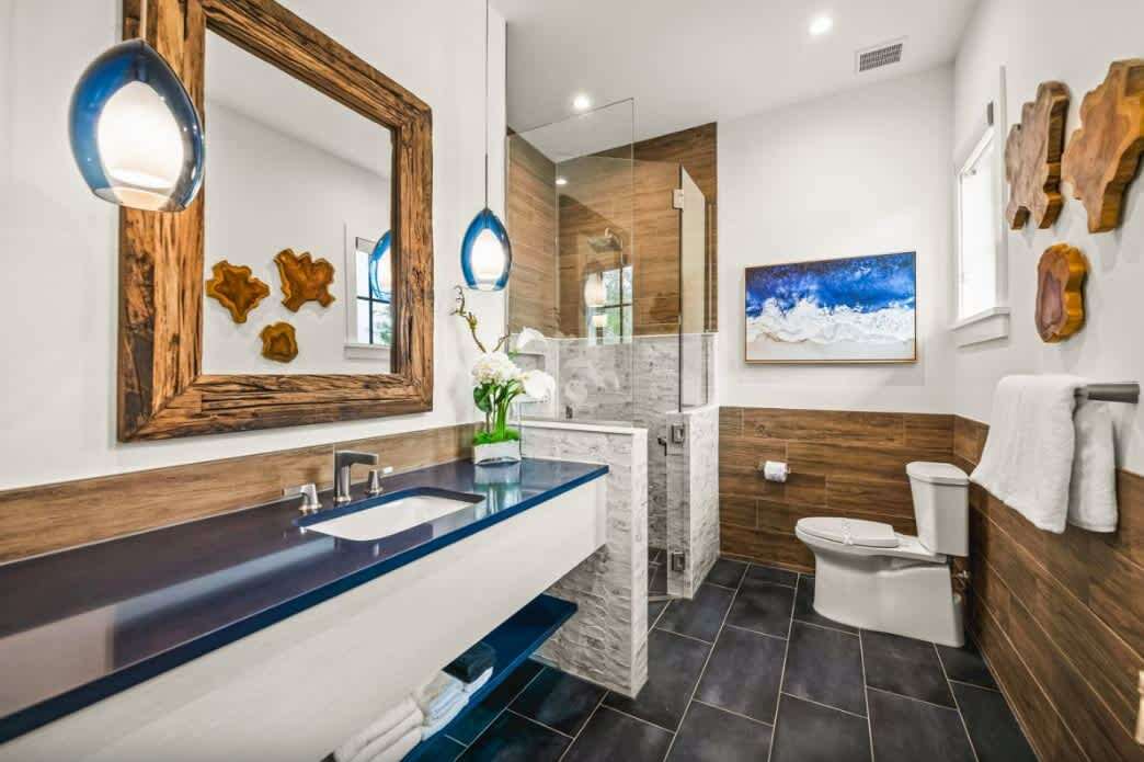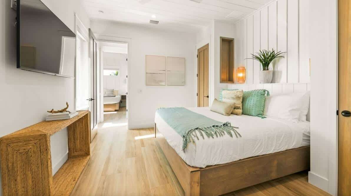 This level serves as the primary living space in both homes. In Home A (Salty Oak), the great room includes a fully stocked kitchen with a cooktop and griddle, double ovens, refrigerator and freezer, wine fridge, dual dishwashers, microwave, coffee maker, and all the essential cookware and dishware. There is island seating for six and a dining table for ten. The living area features custom furnishings and a smart TV, along with front and rear balconies—one among shaded oak trees and one overlooking the lake and pool. Also, on this level there are six bedrooms. Five of the bedrooms feature king beds, en suite bathrooms with walk-in showers, and smart TVs. The sixth bedroom is a custom bunk room with two full-over-queen bunks, built-in workspaces, and an en suite bath with a shower and tub combination. A half bath and laundry room with two stacked washer/dryer units complete this level.