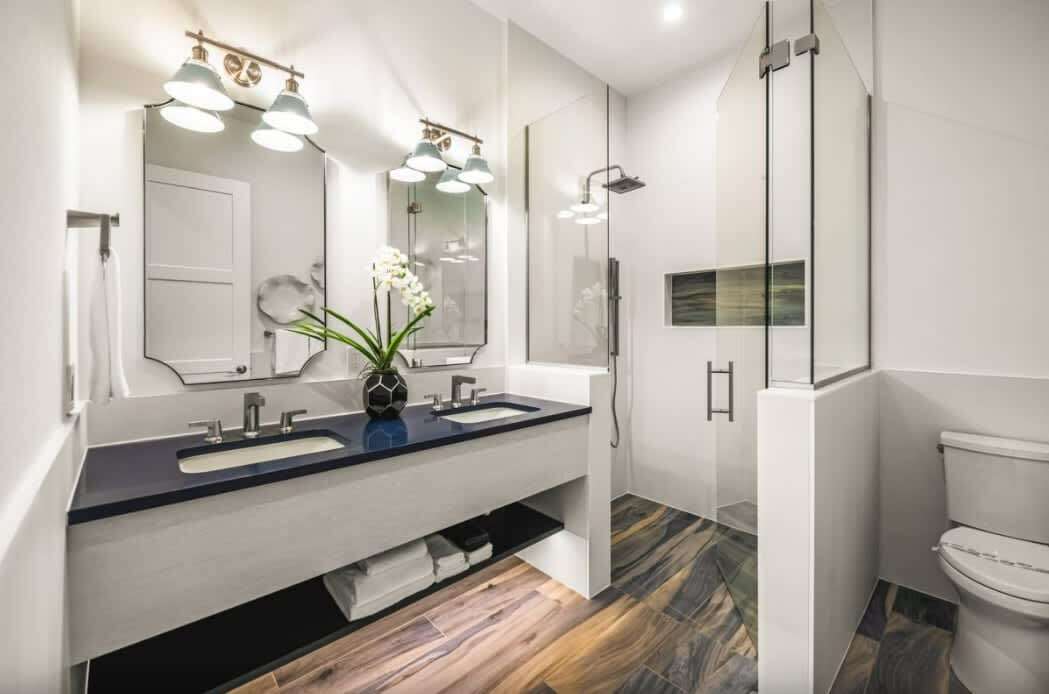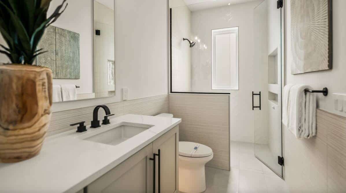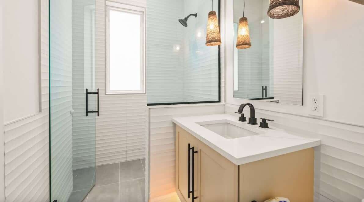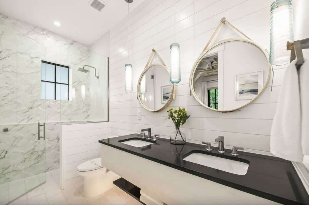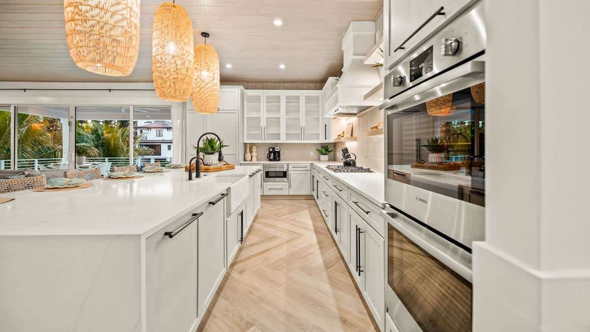 The estate offers free parking for up to twelve vehicles, with four covered spots and eight driveway spaces. On this level, guests can enjoy the two fully fenced backyards that include the multi-sport court, 60-foot waterslide, heated saltwater pools, oversized spas, outdoor kitchens with gas grills, ample lounge seating, and shaded dining areas. The patios are equipped with smart TVs, ping pong tables, and relaxing lake views. Each garage contains beach gear, including four wagons, four coolers, twelve chairs, and eight bikes. Refrigerators and deep freezers are also available near the garage areas, making it easy to prepare for beach outings or poolside gatherings. From the entry foyers of each home, you’ll access both the elevator and staircases that lead to the upper living levels and rooftop deck.