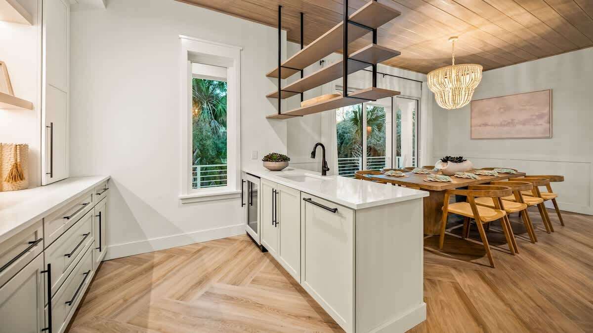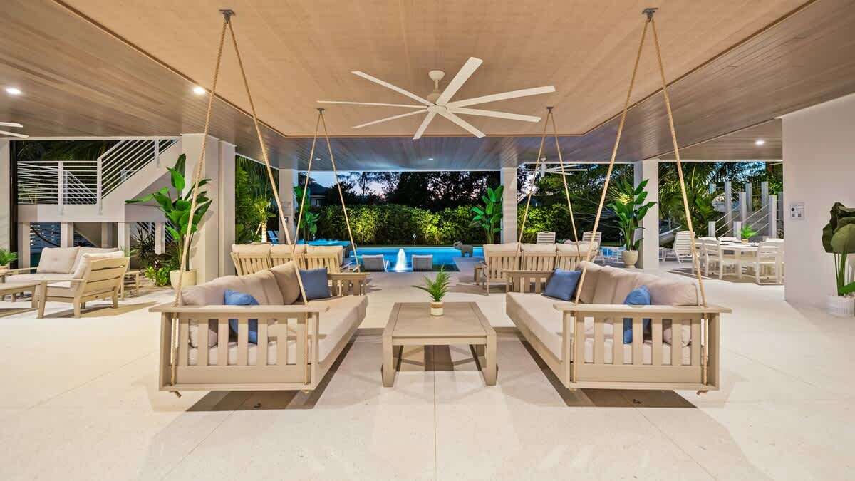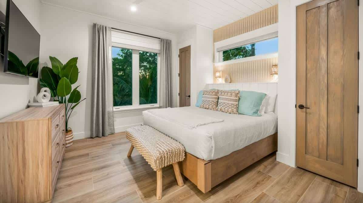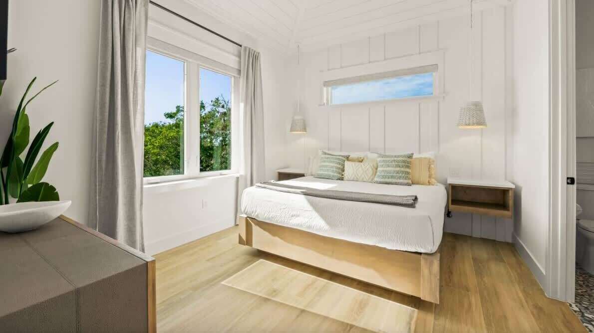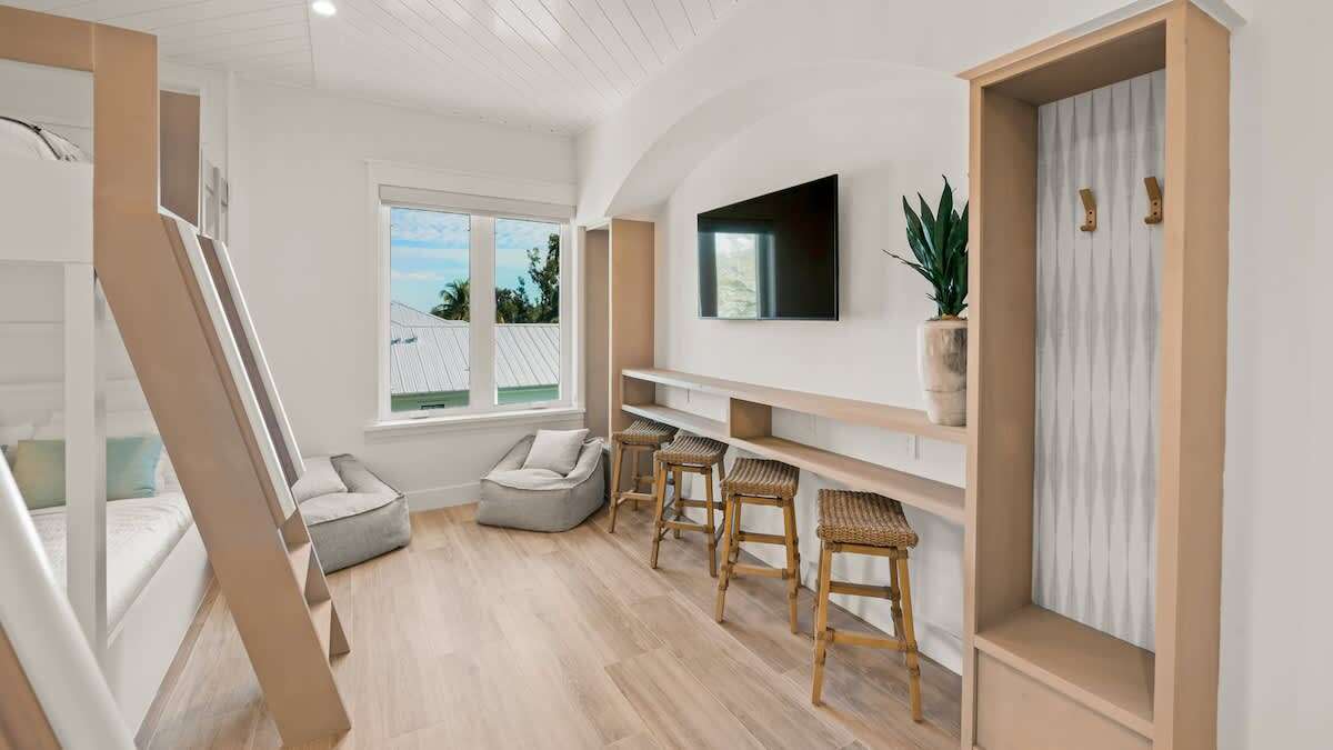 The rooftop level is a showstopper and offers sweeping views of Siesta Key and the Gulf of Mexico. The rooftop deck is furnished with soft seating, bar-top counters, umbrellas, and a smart TV, making it an ideal spot for lounging, sunbathing, or enjoying evening cocktails. Adjacent to the deck, the club room serves as a secondary indoor entertainment space and includes a smart TV, gaming systems, a dry bar with beverage refrigerator, trash pull-out, and a convenient half bath. This area is perfect for both early morning coffee and evening gatherings under the stars.