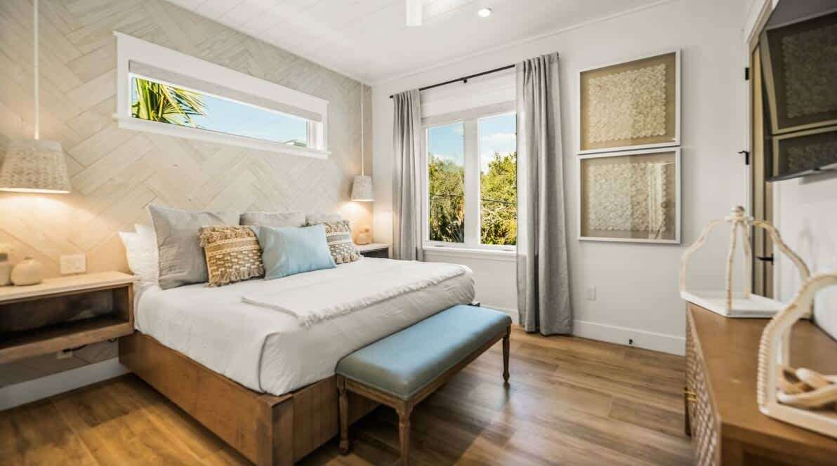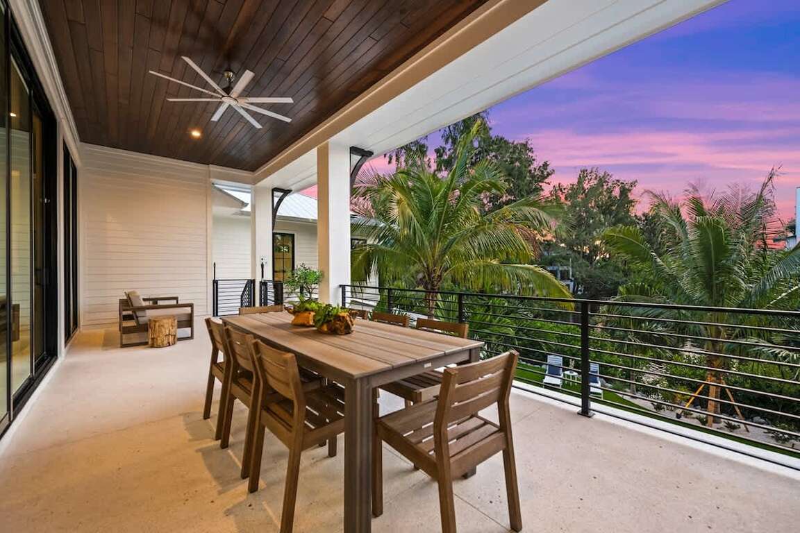 In Home B (Siesta Sun Sets), this floor features the estate’s second great room with a spacious kitchen, beverage bar, living space, and a dining table for ten, complemented by bar seating for five. There are three bedrooms on this floor, including a master king suite with lake views, an oversized bathroom with soaking tub, walk-in shower, dual vanities, and a private water closet. The two guest bedrooms also feature king beds, en suite bathrooms with walk-in showers, and views of Sabal Lake. This floor includes a half bath and a laundry room with two stacked washer/dryer units. The two balconies on this level overlook either the peaceful lake and backyard or the shaded front yard with majestic oak trees.