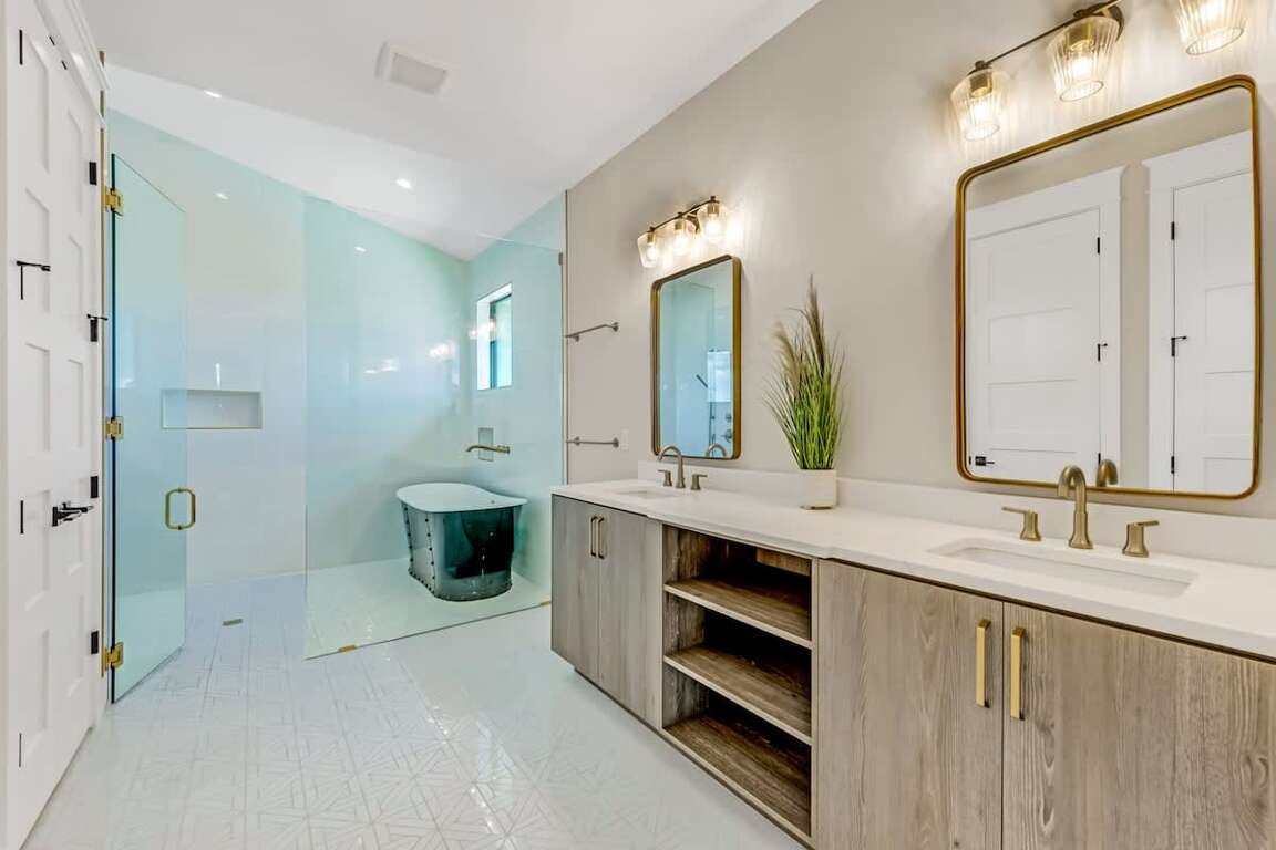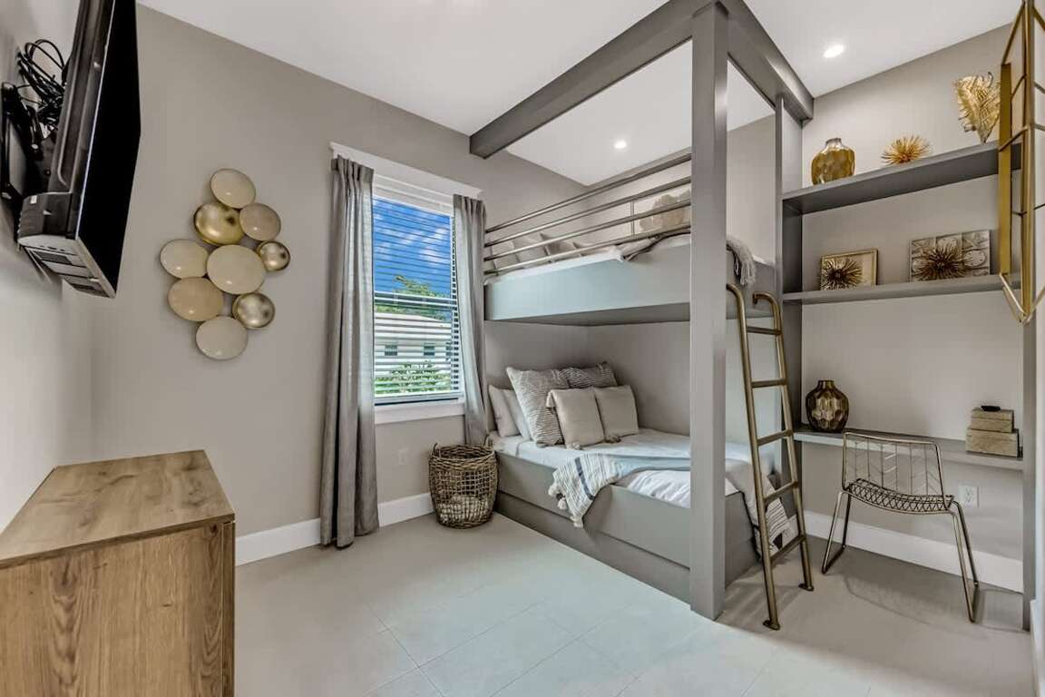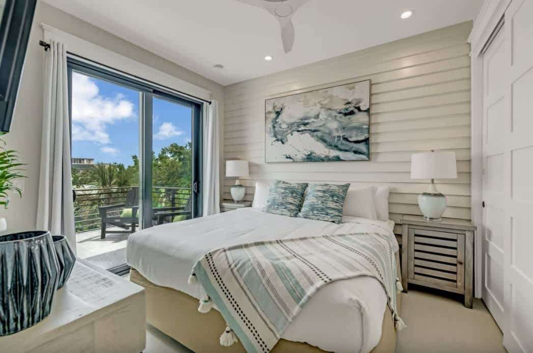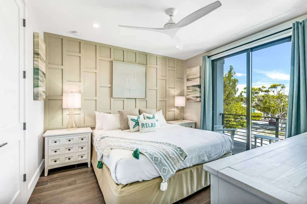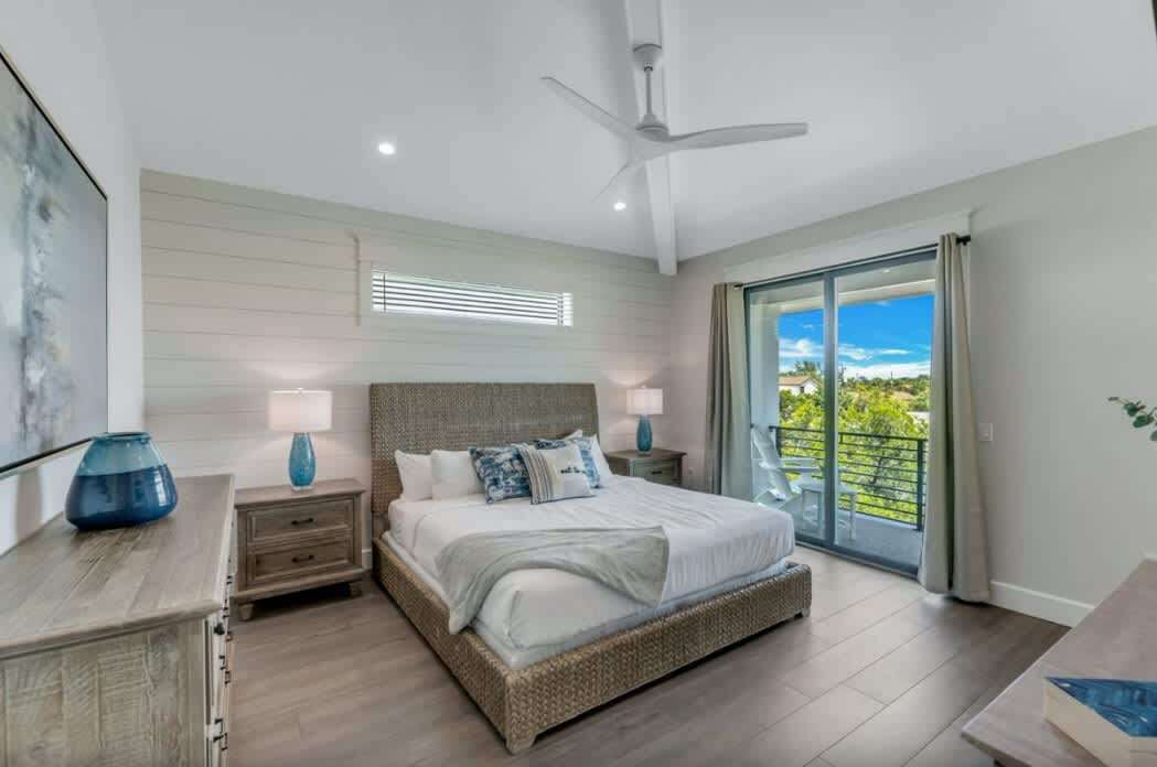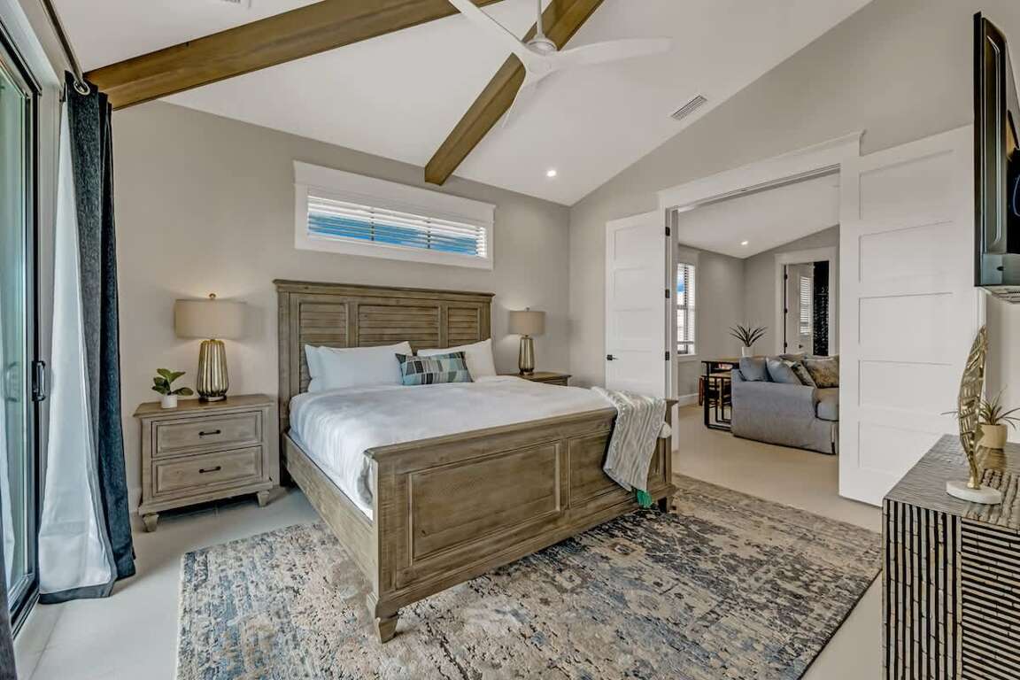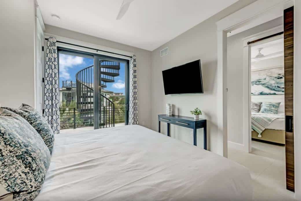 The third floor in each home offers luxurious bedroom accommodations and fun-filled entertainment areas. In Home A, guests can enjoy a stylish club room that includes a wet bar, beverage refrigerator, large smart TV, foosball table, and gaming consoles such as Nintendo and PS4. This space opens to a spacious balcony with additional seating and spiral stairs leading to the rooftop deck.This level features three bedrooms. The first master bedroom includes a king bed, balcony access, a walk-in closet, and an en-suite bathroom with a free-standing bathtub, walk-in shower, and dual vanities. The second master bedroom offers a king bed, balcony access, and a spa-style en-suite bath with a large shower and double vanities. The fifth bedroom includes a king bed, balcony access, and a private en-suite bathroom with a shower and bathtub combination.
