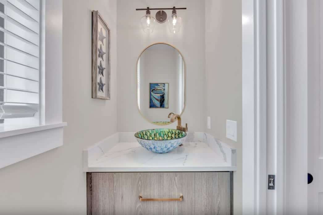 Home B mirrors that of its sister property. The kitchen includes the same array of upscale appliances and is fully stocked with cookware, dishware, and utensils. A dining table for eight and bar seating for six make meal gatherings effortless. The living space is thoughtfully furnished and opens to a balcony with more seating and coastal views. Bedroom three features a king bed, balcony access, and an en-suite bathroom with a walk-in shower. Bedroom four offers a king bed and another en-suite bath with a walk-in shower. The sixth bedroom in this home is also a bunk room, outfitted with two full-over-full bunks and a private en-suite bathroom featuring a tub/shower combination. A laundry area with washer and dryer and a half bath completes this floor.