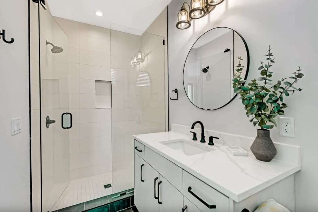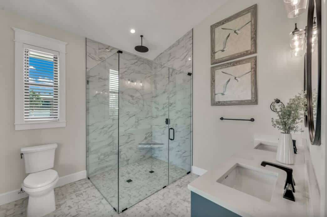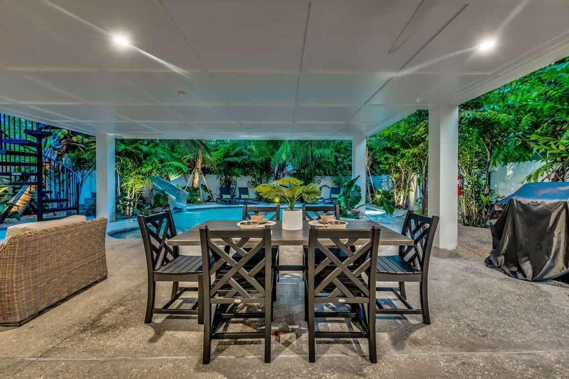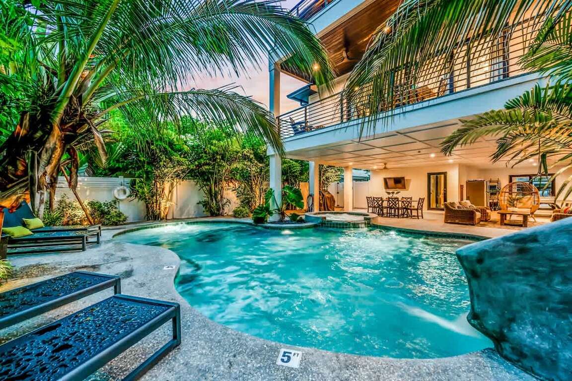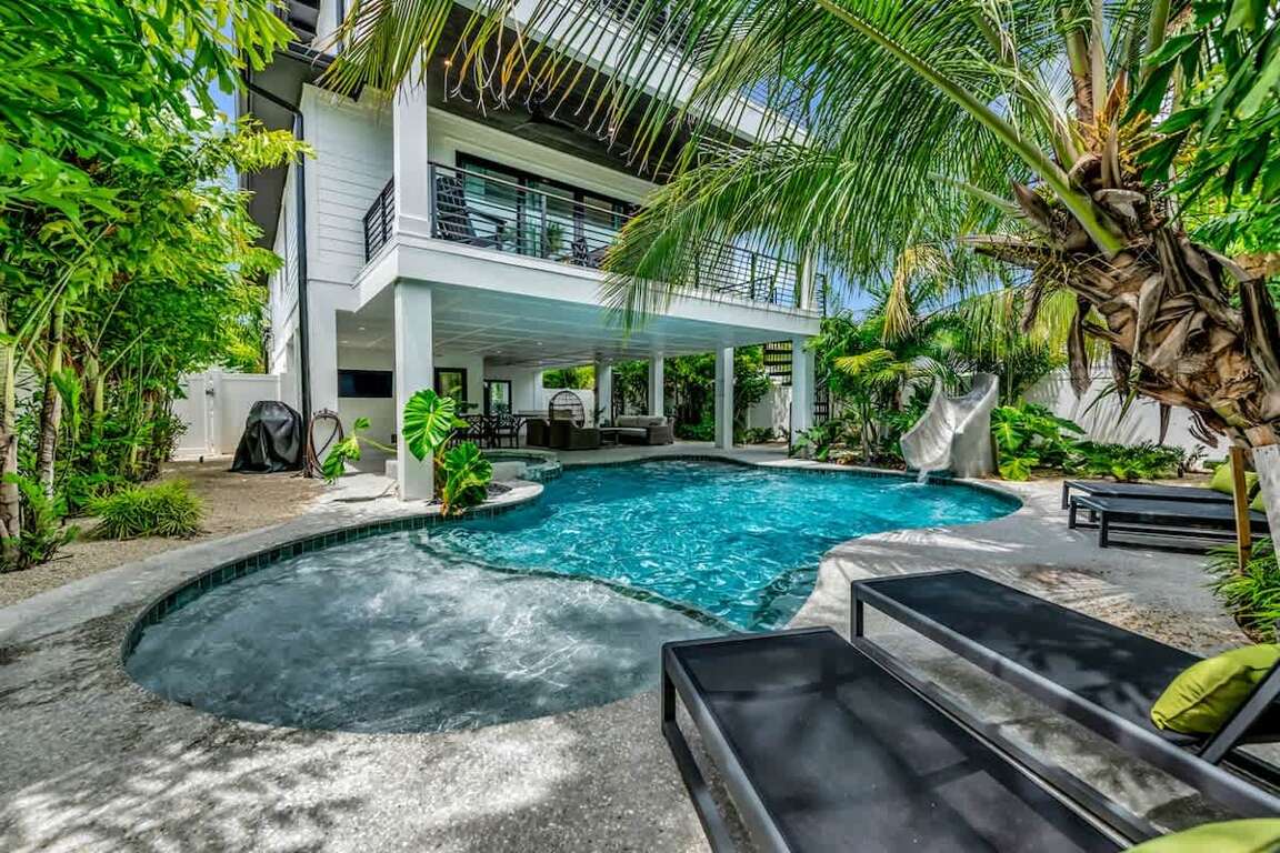 Each home offers parking for up to four vehicles, with two spaces covered and two in the driveway, providing a combined total of eight spaces for guest use. The ground-level outdoor areas of each home are fully fenced and designed for recreation and relaxation. One backyard features an oversized heated saltwater pool with a sun shelf, water slide, LED lighting, and spa. The second home’s backyard includes another resort-style pool with a built-in swim-up bar and submerged stools beside a privacy wall. Both pools are surrounded by lush native landscaping that ensures both privacy and natural beauty.