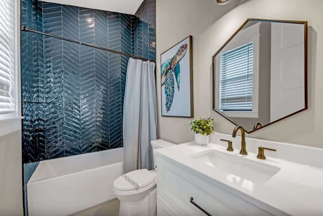 In Home B, the third floor includes a similar club room, enhanced with retro arcade games such as Pac-Man and Galaga. A full bathroom services the club room space. This home’s master suite features a king bed, seating area, balcony with rooftop access, walk-in closet, and an en-suite bathroom complete with a soaking tub and spacious shower. Bedrooms, two and five each include a king bed, balcony access, and en-suite bathrooms with walk-in showers.