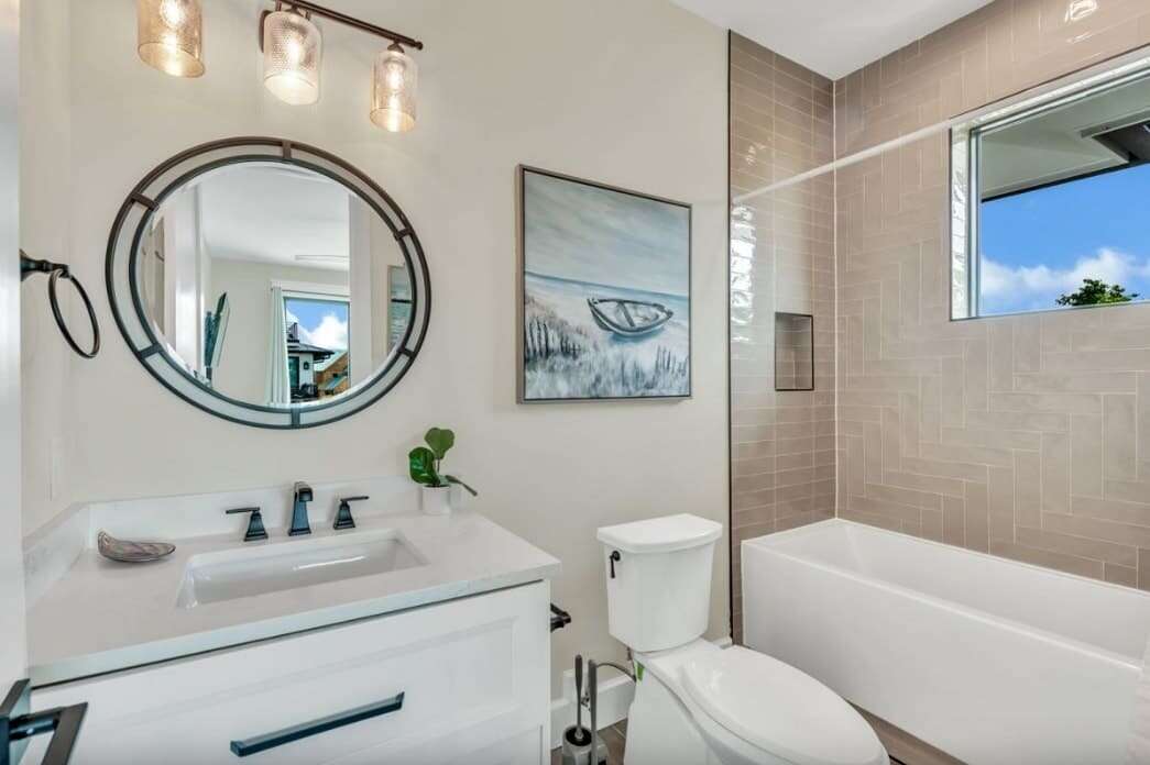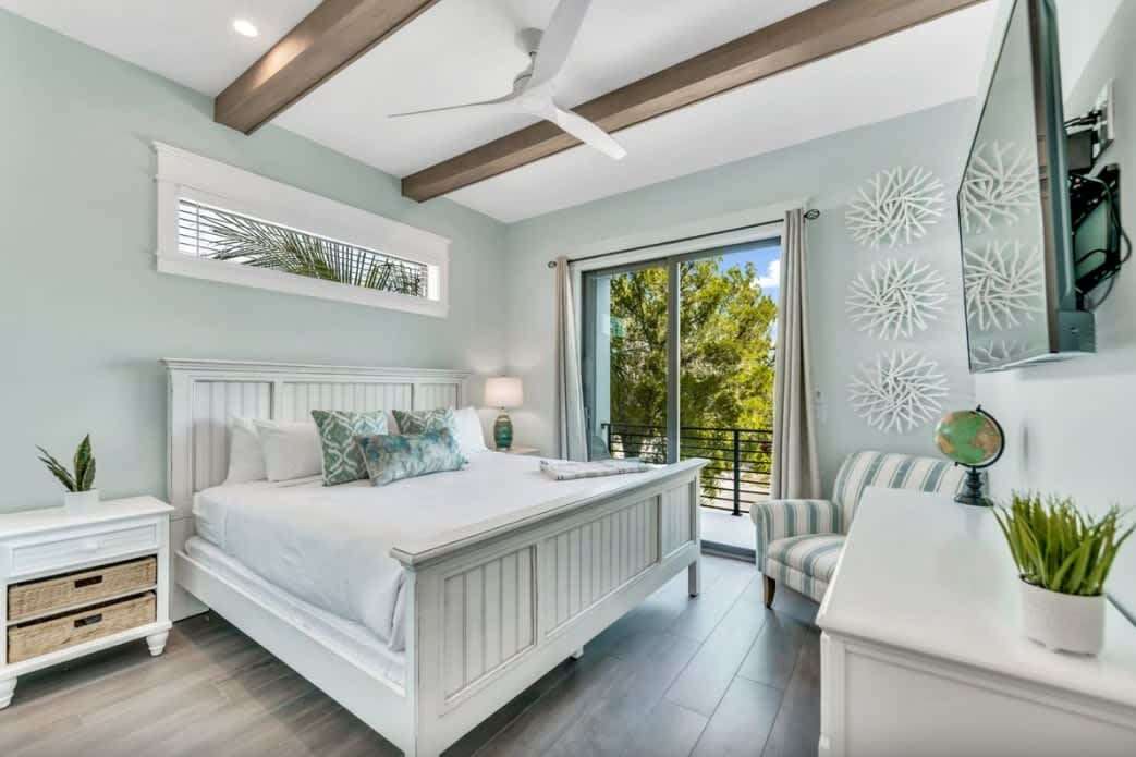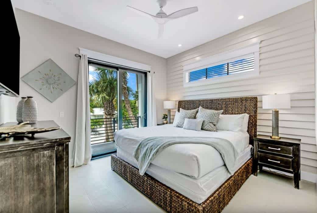 The rooftop decks at both homes are showstoppers. Elevated above the treetops, they provide sweeping views of the Gulf of Mexico, St. Armands Circle, downtown Sarasota, and the coastline of Lido Key. These rooftop oases are each furnished with soft seating, sunset bar-top dining areas, umbrellas for sun protection, and smart TVs for open-air entertainment.