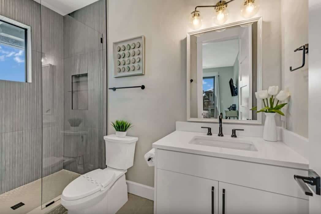 These backyards also offer shaded covered patios furnished with plush seating, outdoor dining spaces (with seating for six and eight, respectively), smart TVs, natural gas grills, ping pong tables, ceiling fans for added comfort, and dry bars with beverage refrigerators. A shared gate connects both backyards, creating a sense of unity while preserving individual privacy. For beach days, each home is stocked with essentials including two beach wagons, two coolers, six beach chairs, and four bikes—providing a total of four wagons, four coolers, twelve chairs, and eight bikes. Each patio also includes an exterior refrigerator and deep freezer for storing beverages, snacks, and ice, ensuring convenient access throughout the day. Guests enter through private foyers in each home, where staircases and elevators lead to all upper levels.