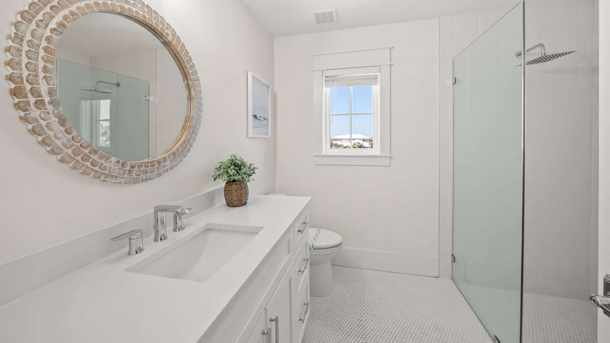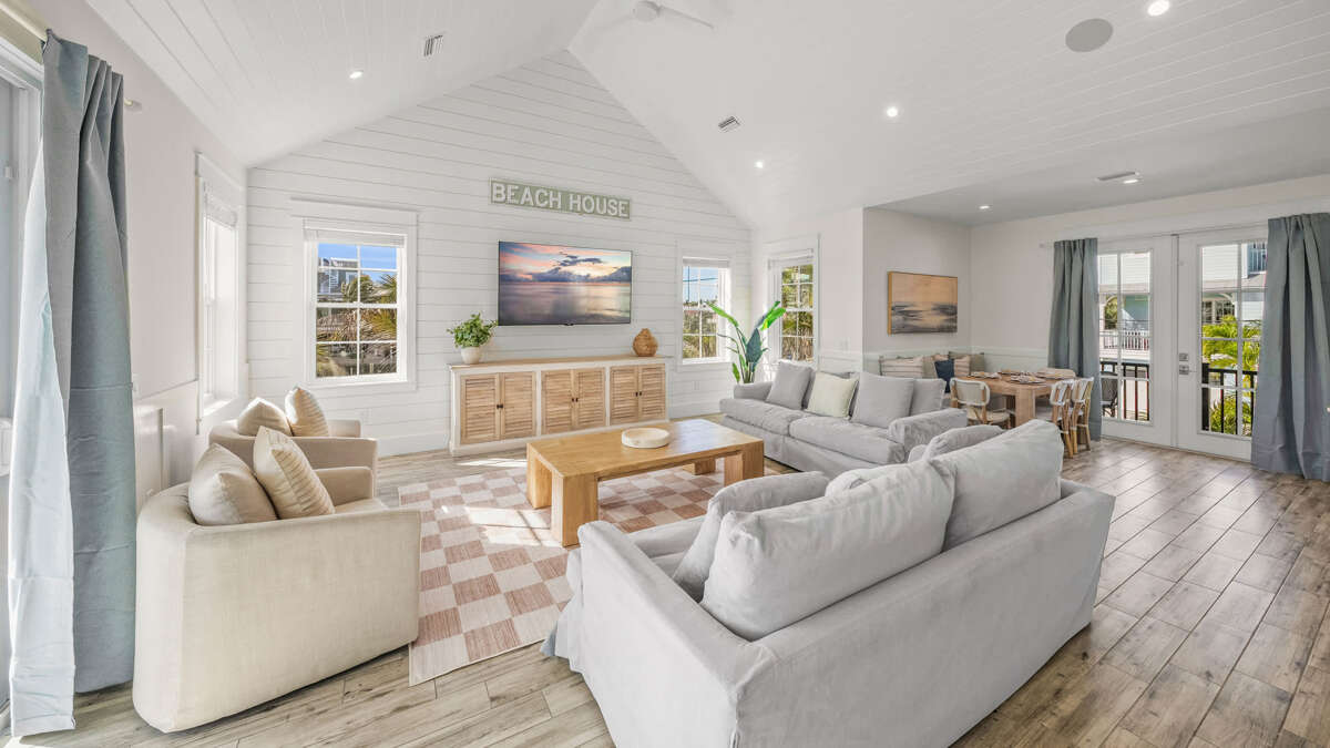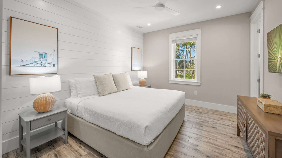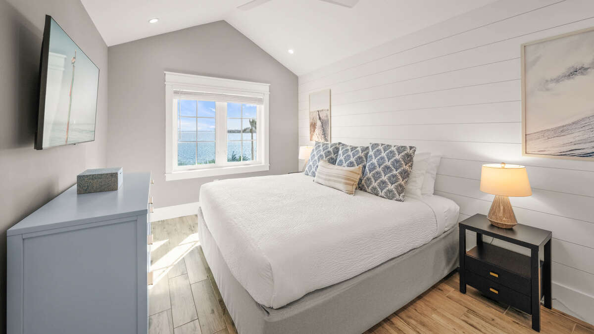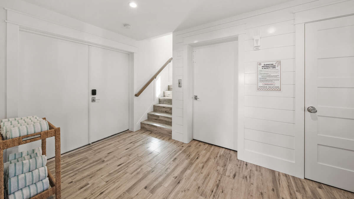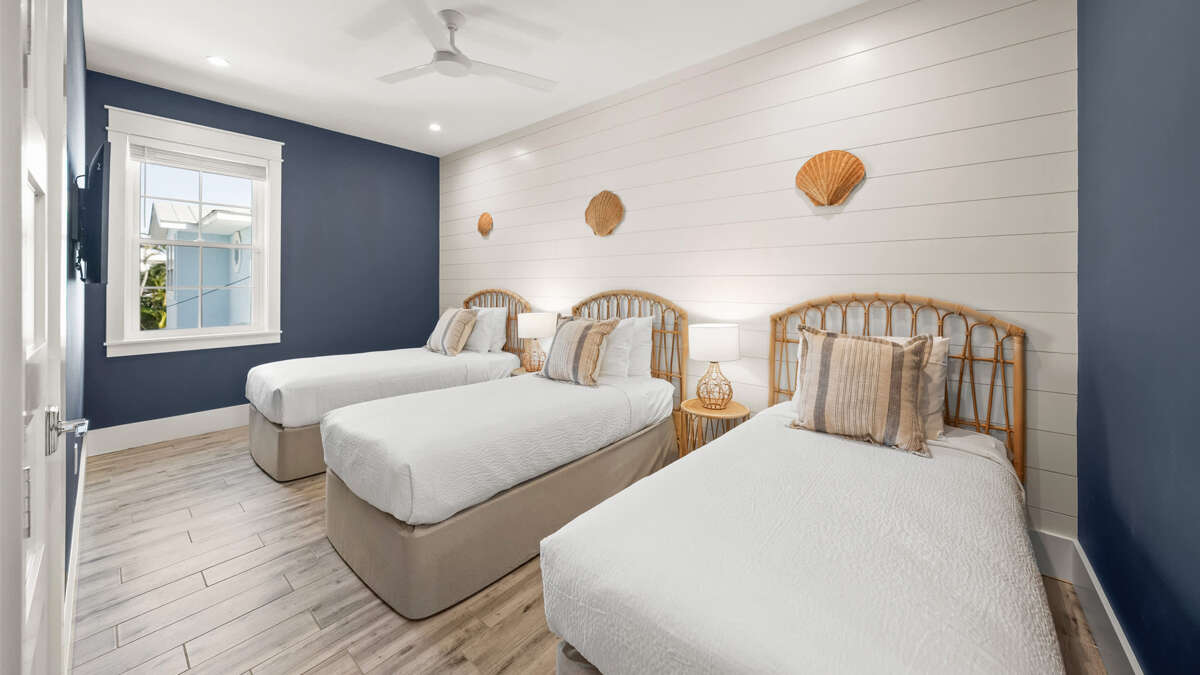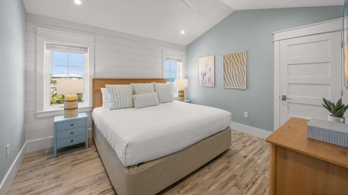 The home's great room is on this level with the fully stocked kitchen with premium appliances, and everything you need cooking for the family. The interior dining area has a dining table for 10, plus additional bar seating at the waterfall kitchen island. The living room provides comfortable coastal furnishings and a media center with large smart TV. The great room opens to a large balcony with dining that overlooks the pool area and provides beautiful water views. Bedrooms 1-5 are on this level. Bedroom 1 is the home's master bedroom, featuring water views, a king bed, private balcony access, walk-in closet, and an oversized en suite bath with double vanity and large walk-in shower. Bedrooms 2-4 are king suites that feature king beds, luxury bedding, walk-in closets, and en suite bathrooms with vanities and walk-in showers. Bedroom 5 features three twin beds and an en suite bathroom with shower/tub combo. There is also a half bath and laundry room with stackable washer/dryer units on this level.
