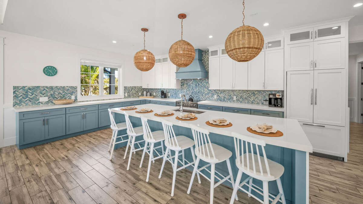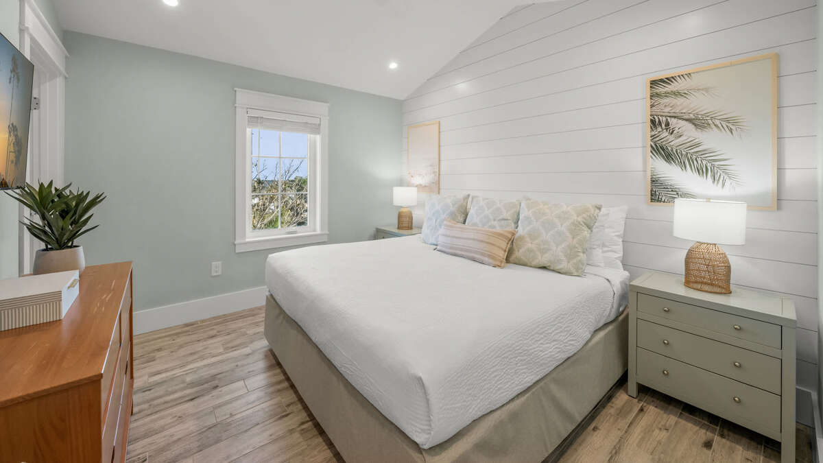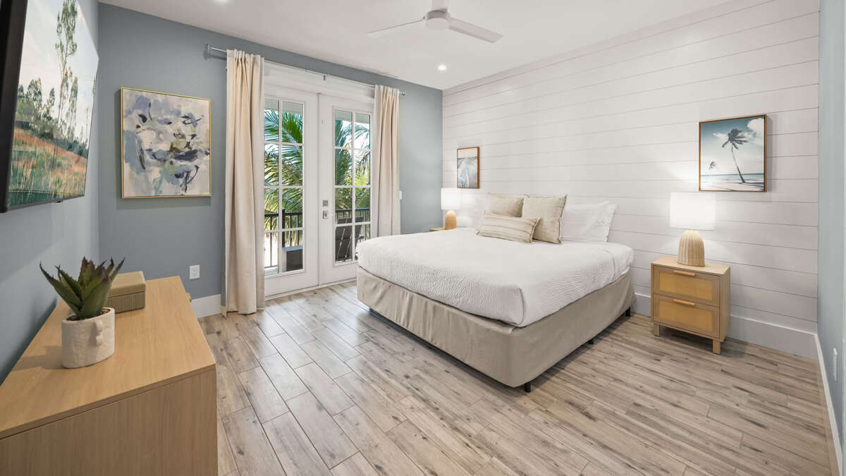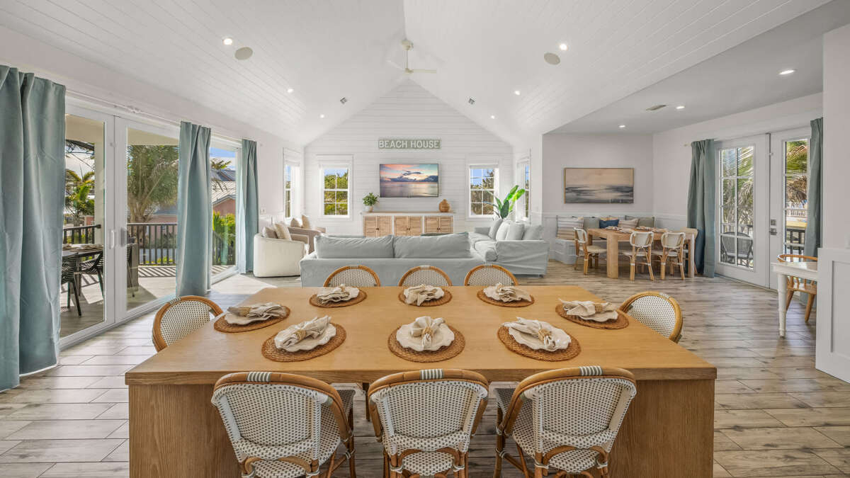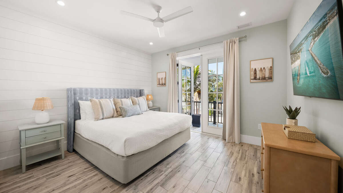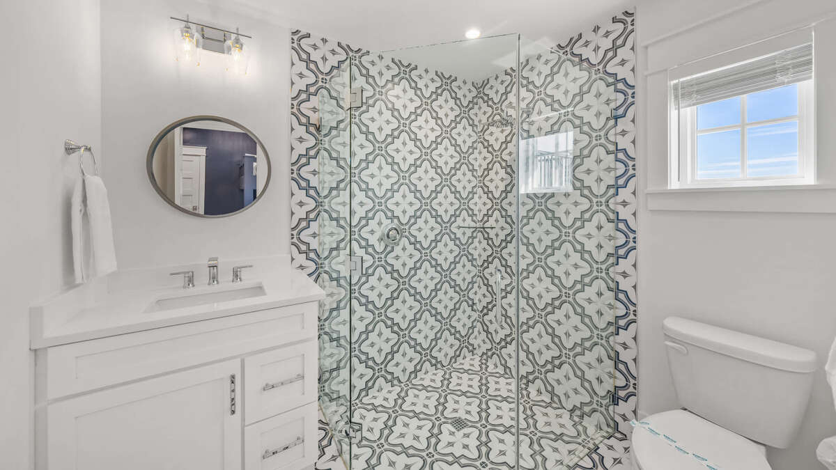 The home's great room is on this level with the fully stocked kitchen with premium appliances, and everything you need cooking for the family. The interior dining area has a dining table for 10, plus additional bar seating at the waterfall kitchen island. The living room provides comfortable coastal furnishings and a media center with large smart TV. The great room opens to a large balcony with dining that overlooks the pool area and provides beautiful water views. Bedrooms 1-5 are on this level. Bedroom 1 is the home's master bedroom, featuring water views, a king bed, private balcony access, walk-in closet, and an oversized en suite bath with double vanity and large walk-in shower. Bedrooms 2-4 are king suites that feature king beds, luxury bedding, walk-in closets, and en suite bathrooms with vanities and walk-in showers. Bedroom 5 features three twin beds and an en suite bathroom with shower/tub combo. There is also a half bath and laundry room with stackable washer/dryer units on this level.