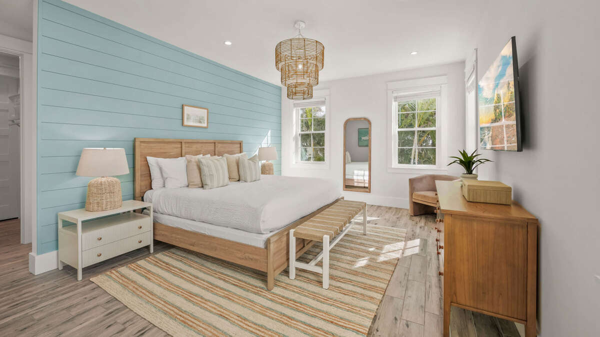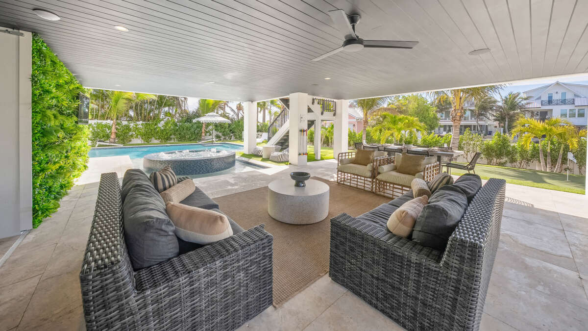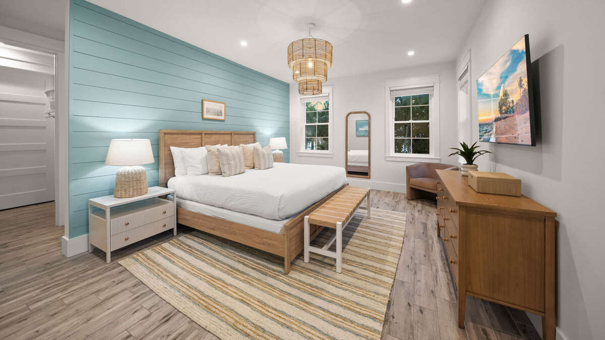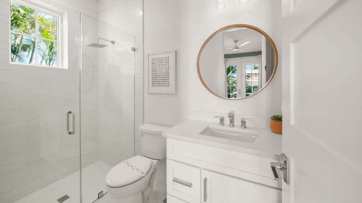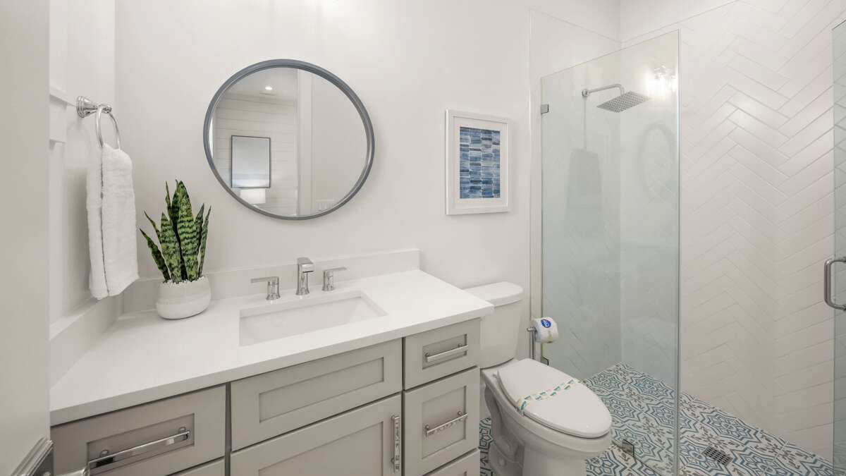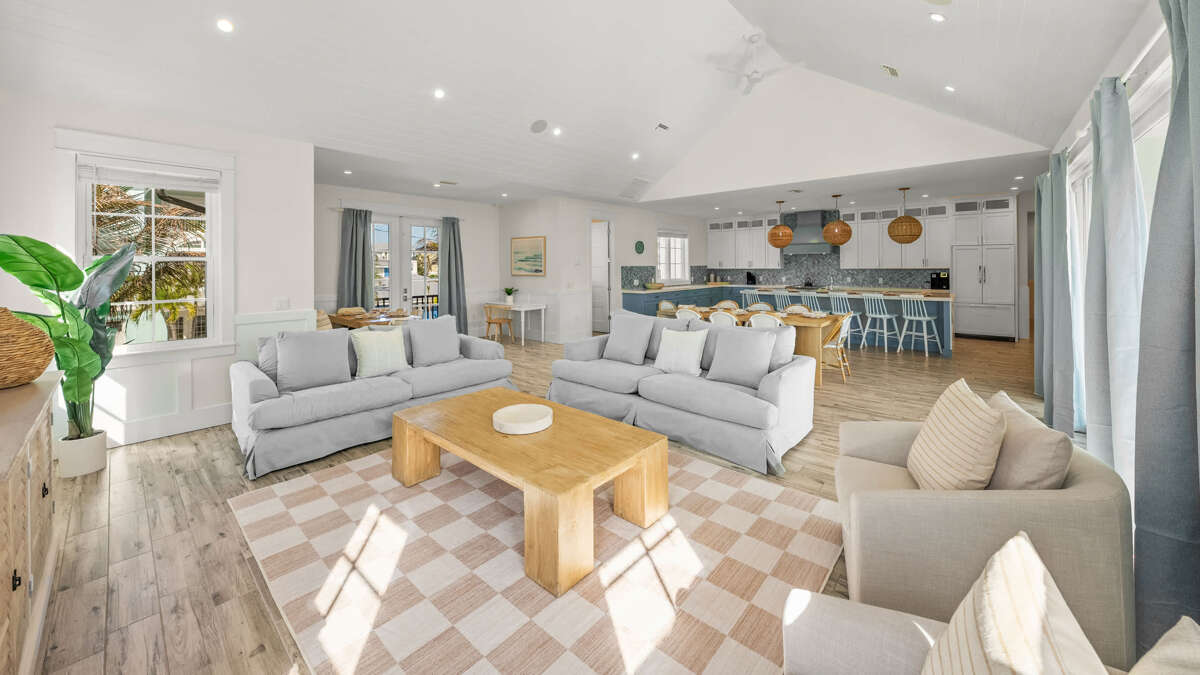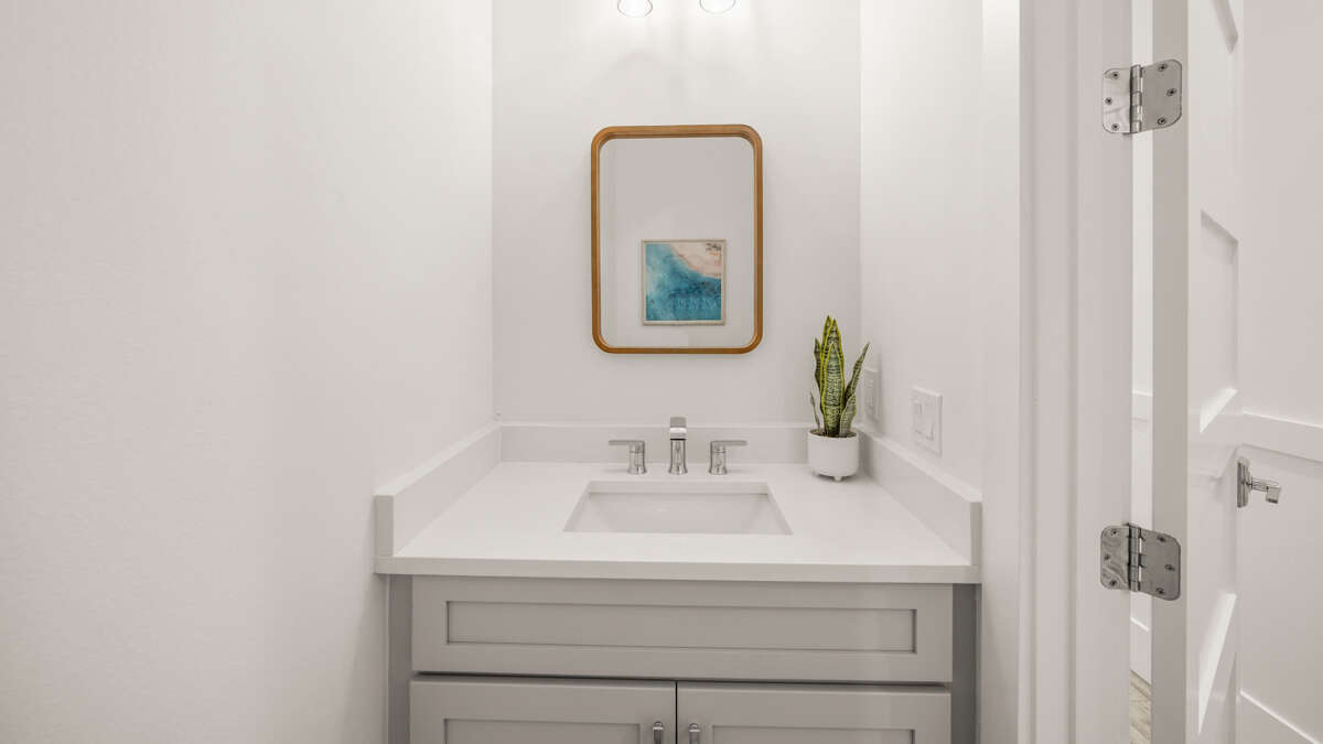 The home's great room is on this level with the fully stocked kitchen with premium appliances, and everything you need cooking for the family. The interior dining area has a dining table for 10, plus additional bar seating at the waterfall kitchen island. The living room provides comfortable coastal furnishings and a media center with large smart TV. The great room opens to a large balcony with dining that overlooks the pool area and provides beautiful water views. Bedrooms 1-5 are on this level. Bedroom 1 is the home's master bedroom, featuring water views, a king bed, private balcony access, walk-in closet, and an oversized en suite bath with double vanity and large walk-in shower. Bedrooms 2-4 are king suites that feature king beds, luxury bedding, walk-in closets, and en suite bathrooms with vanities and walk-in showers. Bedroom 5 features three twin beds and an en suite bathroom with shower/tub combo. There is also a half bath and laundry room with stackable washer/dryer units on this level.