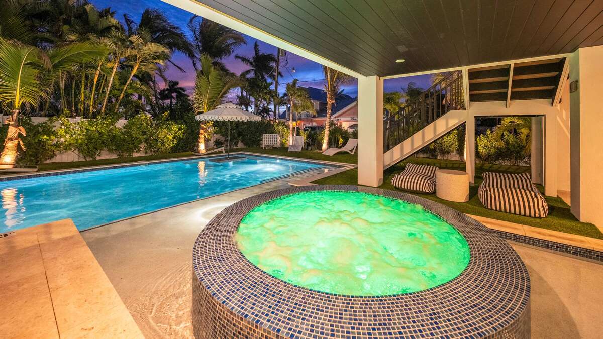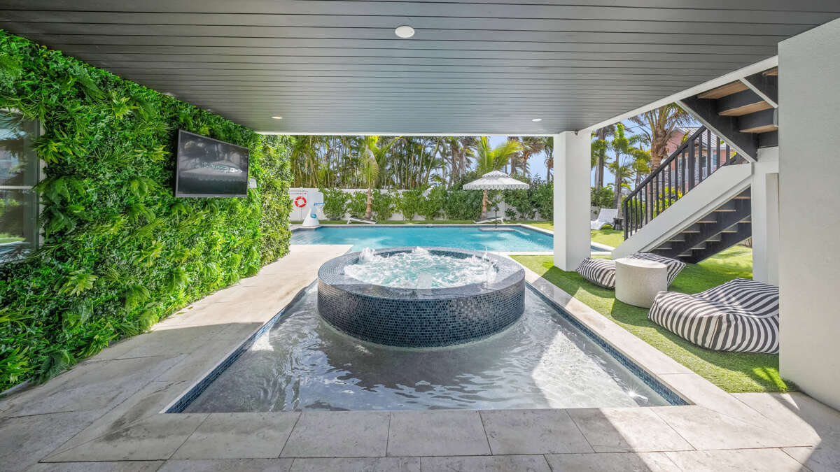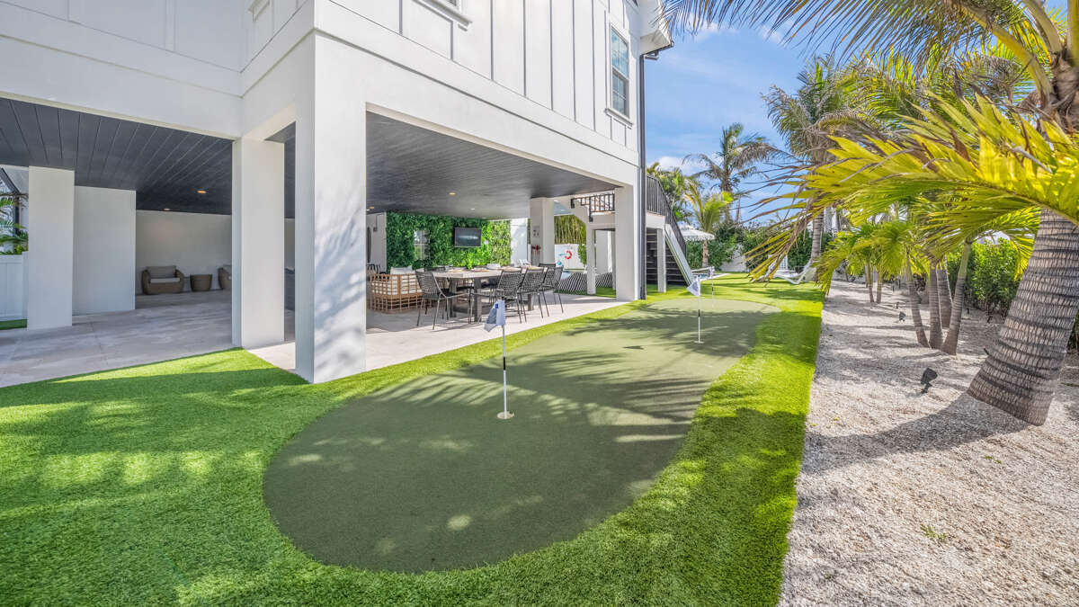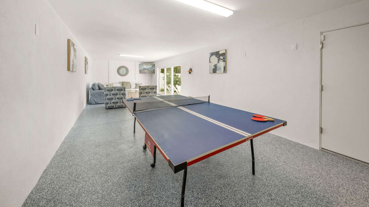 This home provides free parking for up to 5 vehicles with 2 covered spaces in the garage and 3 spaces in the driveway. The main staircase and elevator access to all levels is here (excluding rooftop). In the garage, you'll find beach equipment and bikes provided, a full refrigerator and freezer for additional storage and convenience, and a ping pong table with seating and sliding doors that open directly to the pool area. The backyard area is fully fenced and features turf throughout with a putting green, heated pool with sun shelf and heated spa, covered patio with soft seating and dining spaces, and BBQ grill with propane. Steps from the pool area lead up to the first level of living.