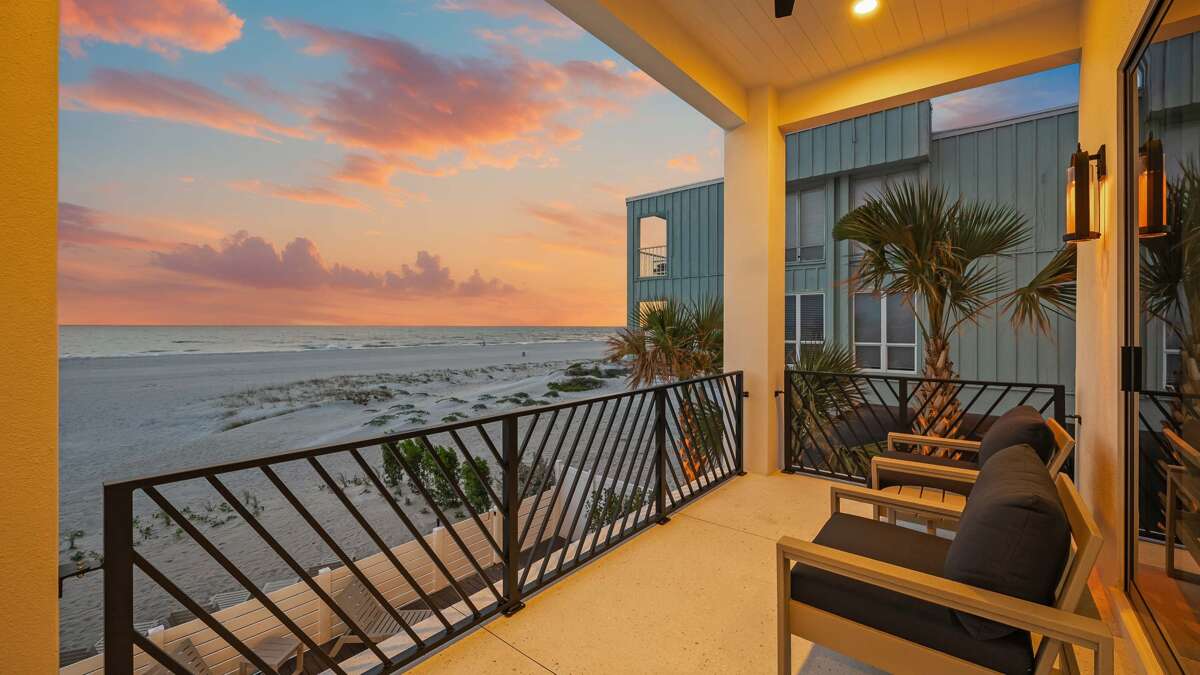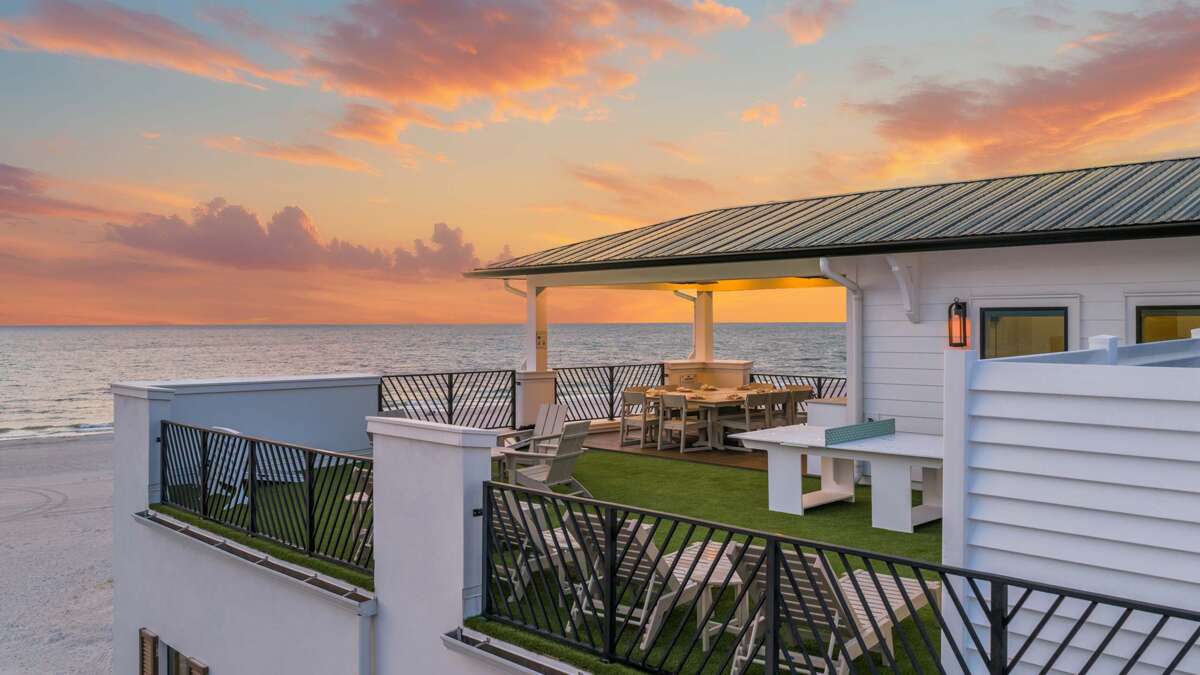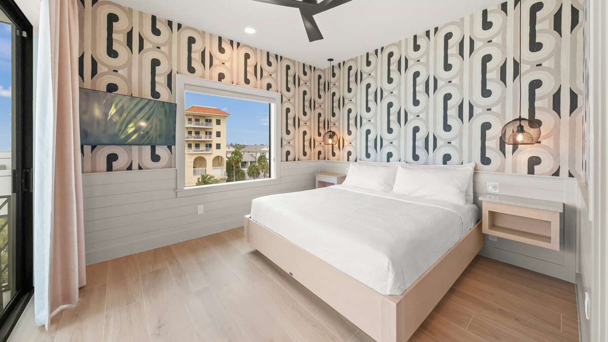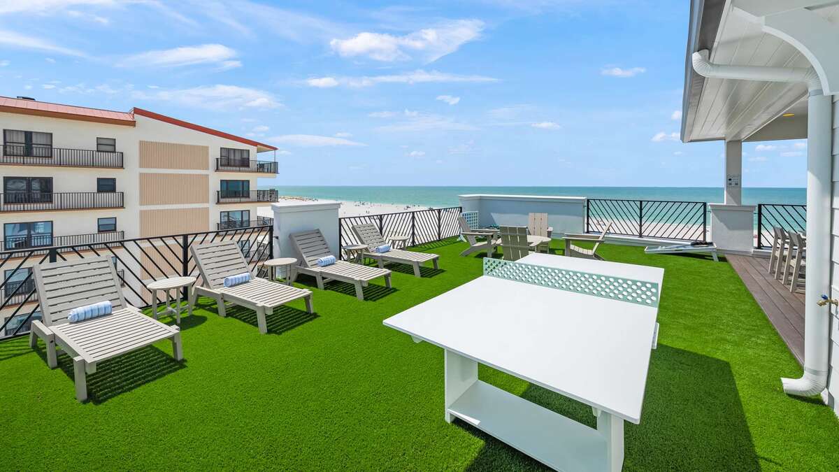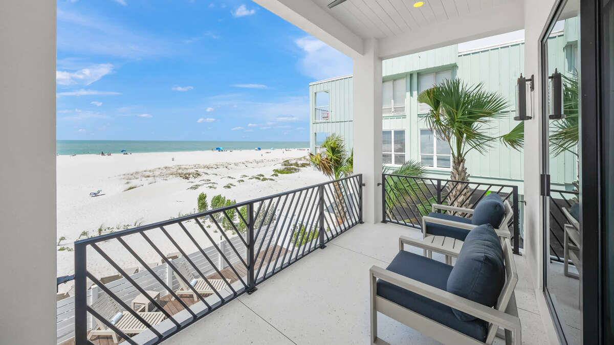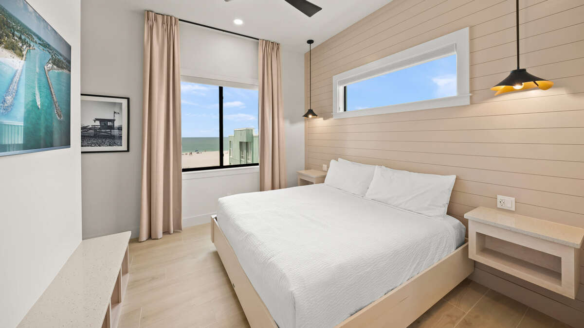 The rooftop deck is the showpiece of The Pearl, offering breathtaking views of the Gulf of Mexico. Up here, you’ll find the perfect mix of sun and shade, with both open-air and covered spaces designed for relaxing and entertaining. The covered area features dining for 10, a beverage fridge, and an ice maker—perfect for enjoying your favorite drink as the sun sets over the water. Step into the open section and you’ll find a turfed area with four loungers, a cocktail table, ping pong table, outdoor connect 4 and corn hole. Just off the rooftop, Master Bedroom 2 serves as a private retreat with a king bed, an en suite bathroom with a shower, and a private balcony with soft seating where you can unwind and take in the beautiful beach views—an incredible way to start or end your day in paradise.