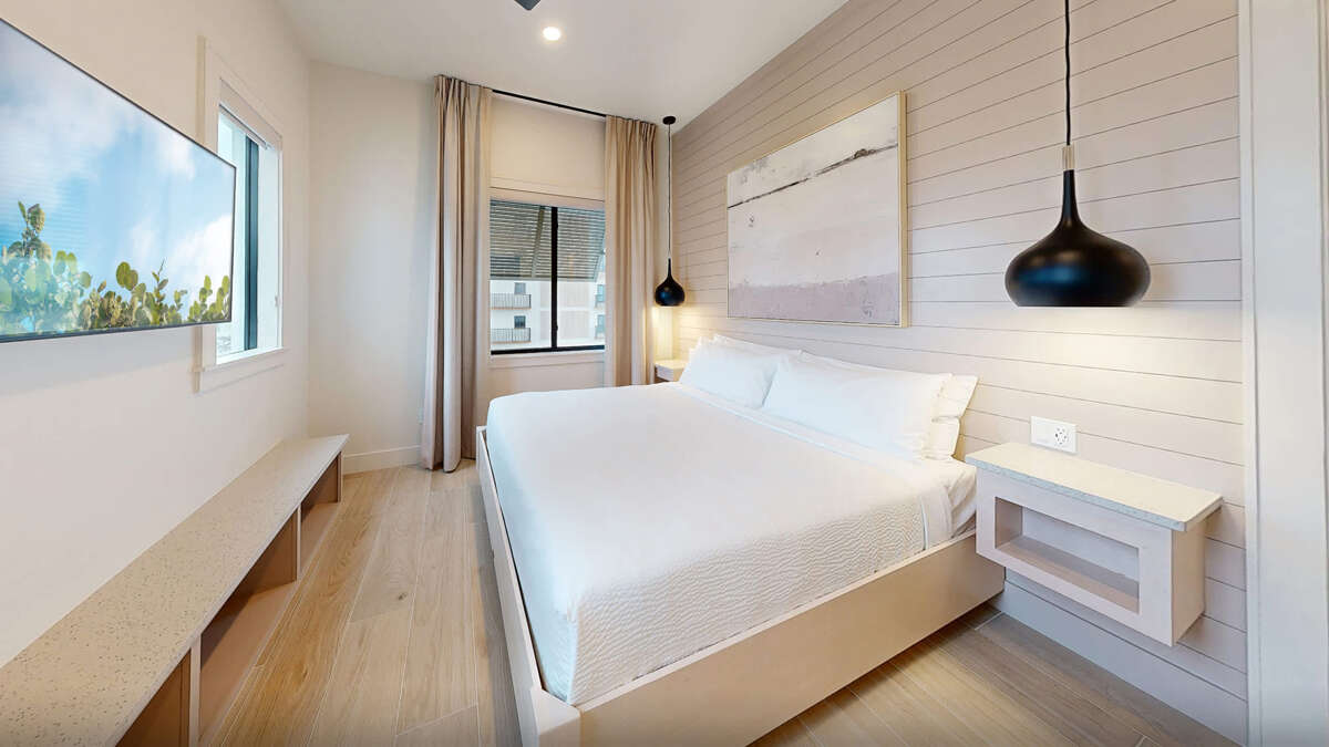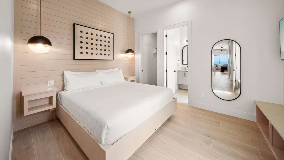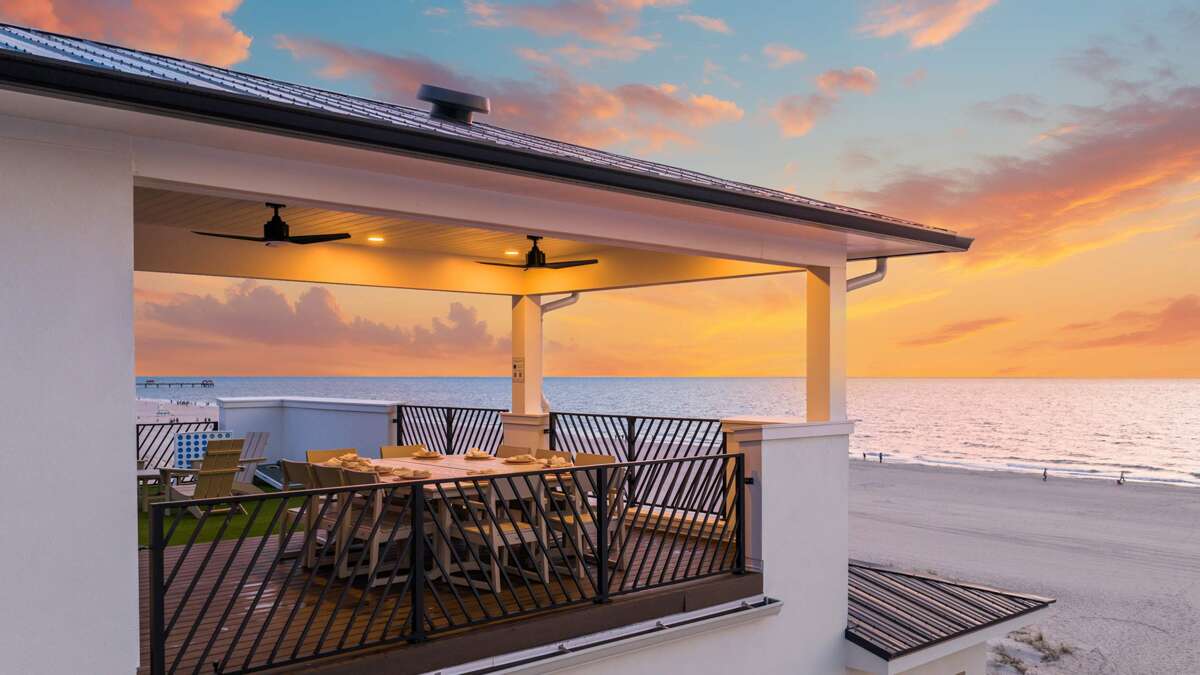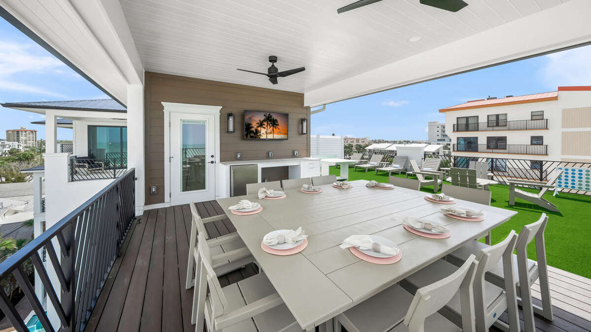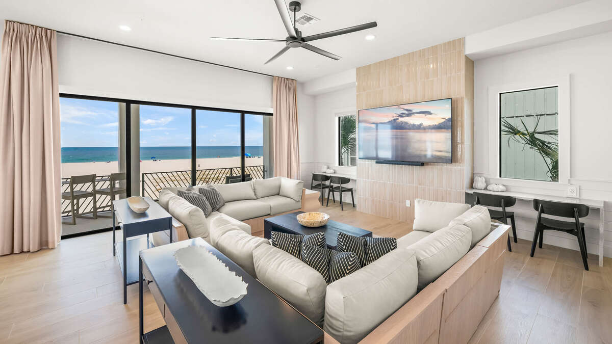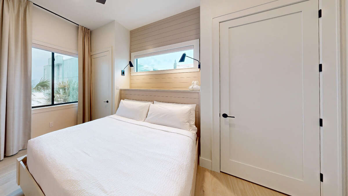 The rooftop deck is the showpiece of The Pearl, offering breathtaking views of the Gulf of Mexico. Up here, you’ll find the perfect mix of sun and shade, with both open-air and covered spaces designed for relaxing and entertaining. The covered area features dining for 10, a beverage fridge, and an ice maker—perfect for enjoying your favorite drink as the sun sets over the water. Step into the open section and you’ll find a turfed area with four loungers, a cocktail table, ping pong table, outdoor connect 4 and corn hole. Just off the rooftop, Master Bedroom 2 serves as a private retreat with a king bed, an en suite bathroom with a shower, and a private balcony with soft seating where you can unwind and take in the beautiful beach views—an incredible way to start or end your day in paradise.