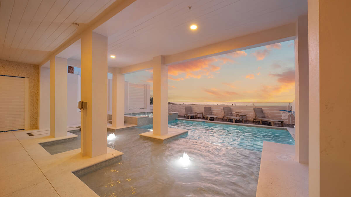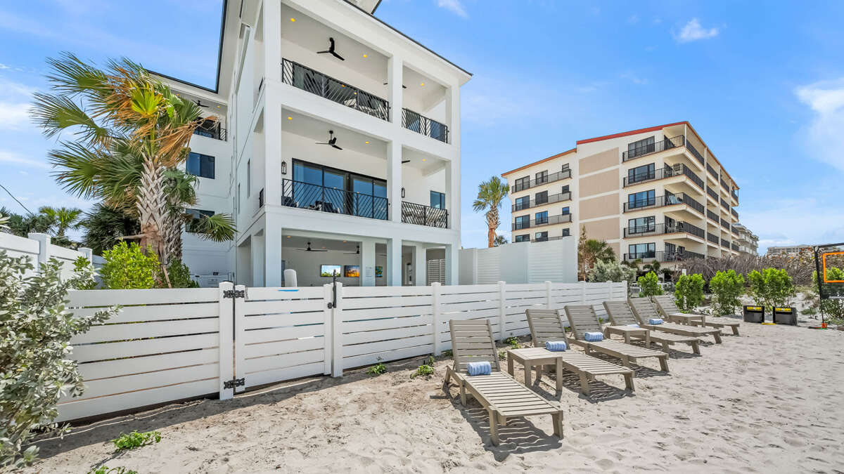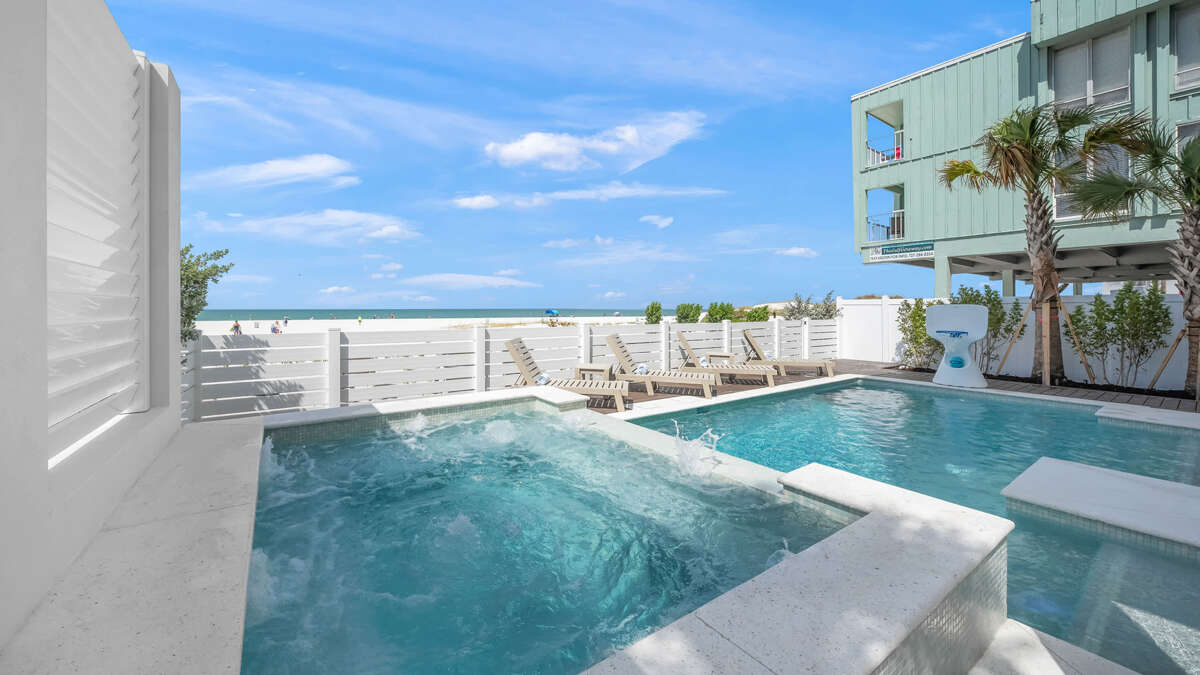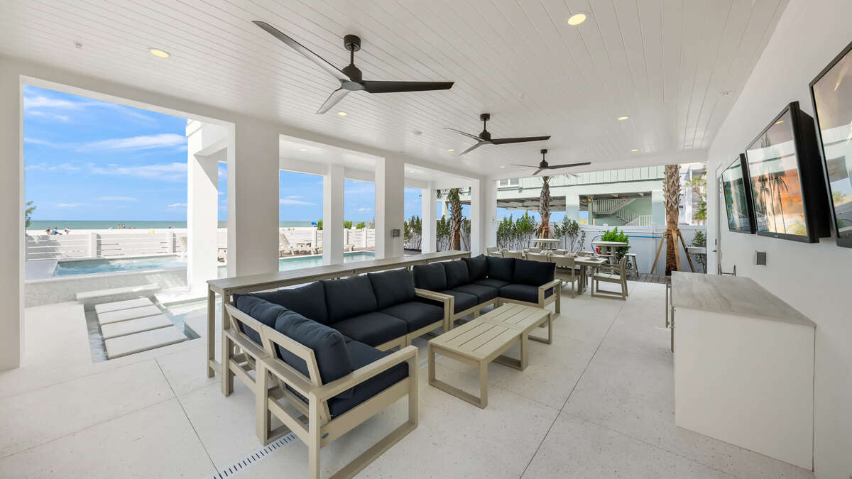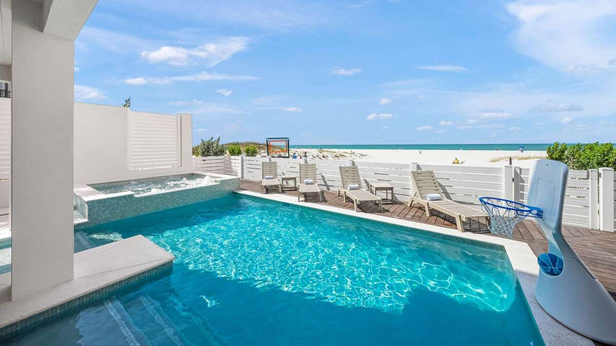 The ground floor begins with a private foyer offering both stair and elevator access to the upper levels. This level includes garage parking for 2 vehicles and driveway parking for 2 additional ones. Just beyond the foyer, your private beach access makes it easy to move between the sand and the home, with an outdoor shower conveniently placed inside the gate. The pool deck sits just steps away and features the resort-style pool and oversized spa, along with the outdoor seating, TVs, and entertainment amenities described above. Beach volleyball, jazzminton, and Kan Jam are provided for friendly competition on the sand. It’s a well-organized space that’s meant for laid-back luxury, warm breezes, and hours of poolside relaxation.