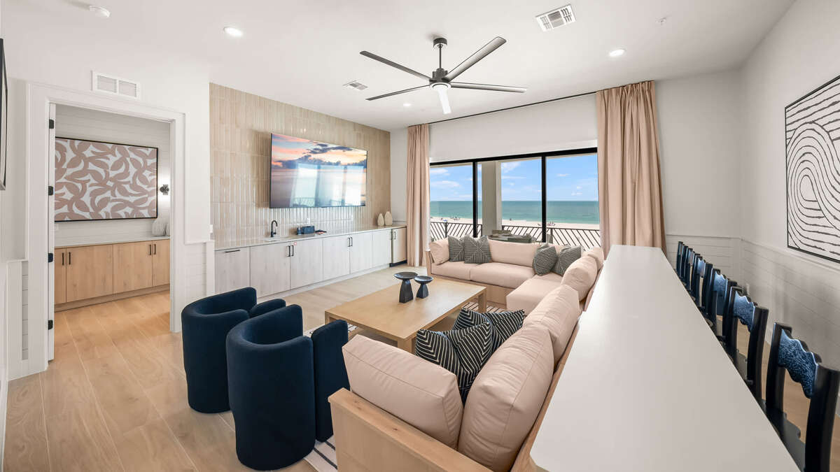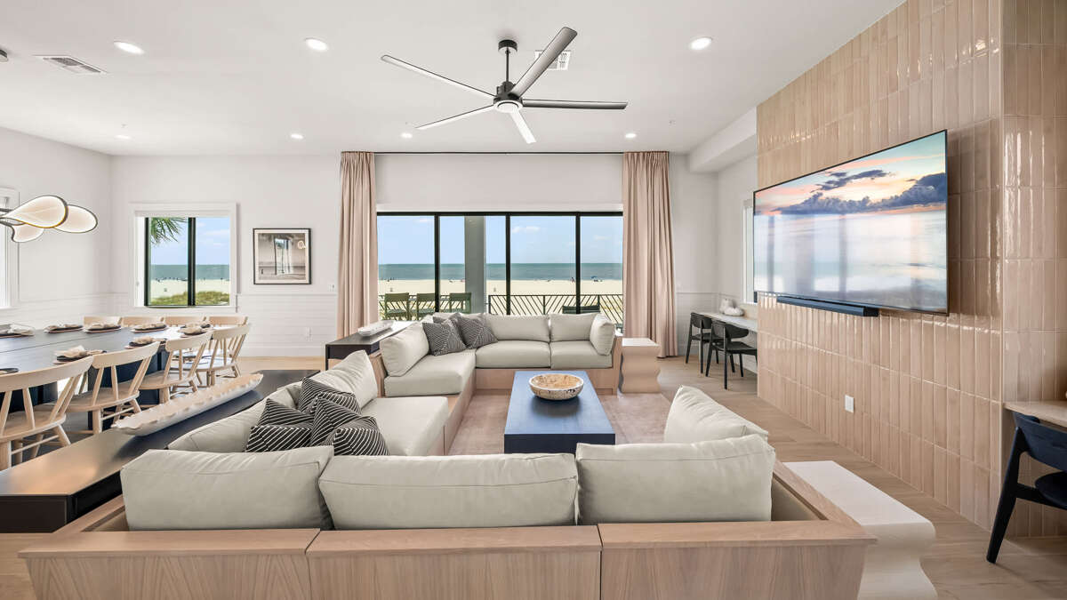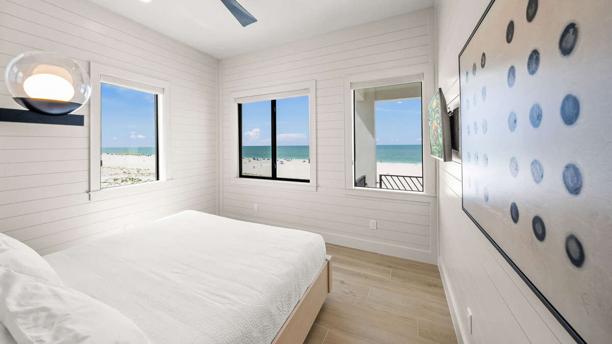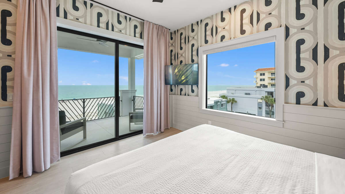 This level is the private sanctuary of the home, where comfort and coastal luxury come together. The spacious club room is made for relaxing and entertaining, featuring a cozy seating area, bar seating for 7, a media center for a true home theater experience, Nintendo Switch gaming console, wall scrabble and a fully equipped wet bar with a beverage fridge, sink, and ice drawer—perfect for movie nights or evening cocktails with a view. There is also a balcony access right off the club room, offering a breezy outdoor space with soft seating and dining for 4 where you can take in the sights and sounds of the coast. The Master Bedroom 1 that's on this level feels like a true escape. You will wake up to stunning views of Clearwater Beach and the Gulf of Mexico and unwind later in a spa-inspired bathroom with a freestanding soaking tub and walk-in shower. Even the walk-in closet in the Master Bedroom 1 has Gulf Views! Bedrooms 4, 5, and 6 (with Gulf Views!) each feature king beds, built-in ledge seating and private en suite bathrooms, giving every guest their own serene retreat after a day in the sun.