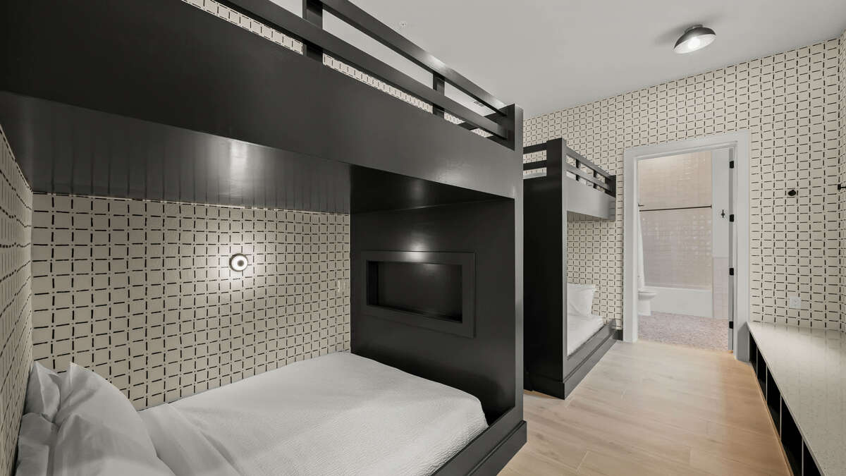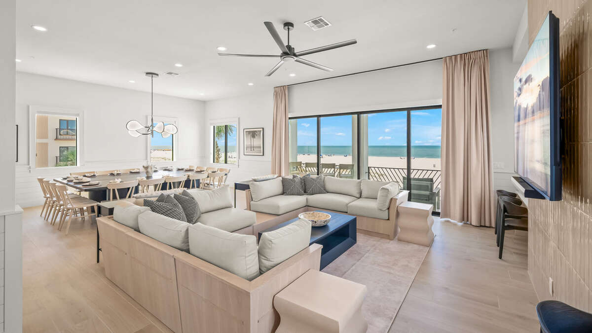 This main level centers around the open-concept great room with a large living area, dining for 18, and a chef’s kitchen with double ovens, 2 dishwashers, a pantry and an island with seating for 5. Expansive windows and sliding glass doors fill the space with natural light and open to a furnished balcony directly off the kitchen, offering bar top dining for 6, additional soft seating, and stunning views of the Gulf of Mexico and Clearwater Beach. The living area includes soft seating, a media center (80"+ Smart TV w/ Surround Sound), and 4 dedicated workspaces (if you really have to work). The kitchen features top-notch appliances along with elegant finishes and a spacious layout designed for both everyday meals and entertaining. Two bedrooms are located on this level: Bedroom 3 features a king bed, TV, built-in ledge seating, and en suite bath; Bedroom 7 is a bunk room with 2 queen-over-queen bunks, individual TVs for both lower bunks and an extra TV on the wall, and an en suite bath with shower/tub combination. A laundry room with dual stacked washer/dryers, sink, and folding counter adds convenience to this level.