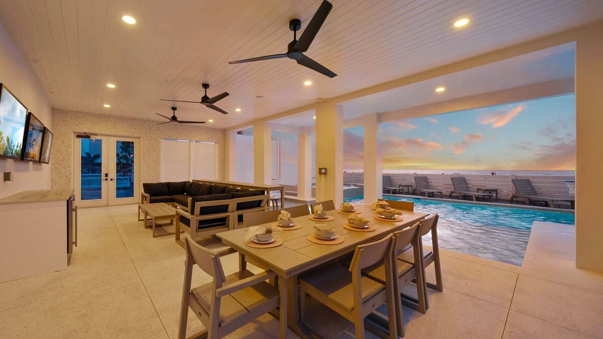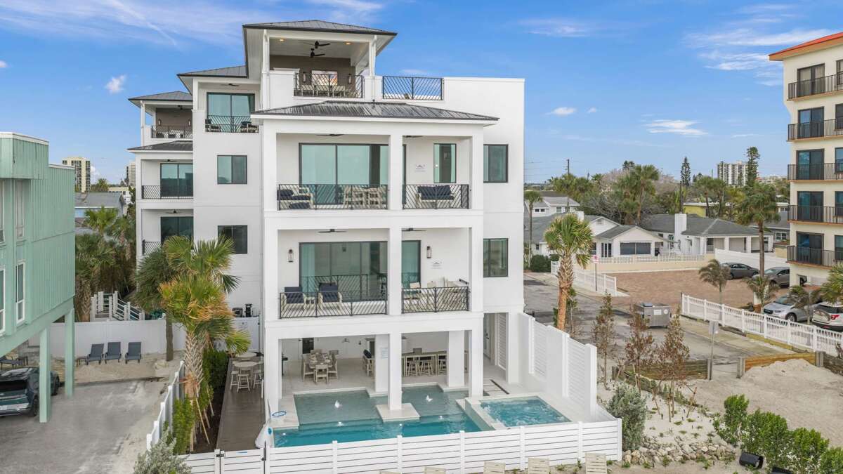 7-bedroom house in Clearwater Beach with private beach access, rooftop deck, pool and spa, elevator, and multiple living areas for groups.