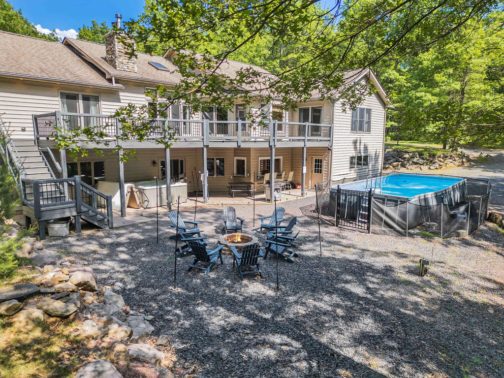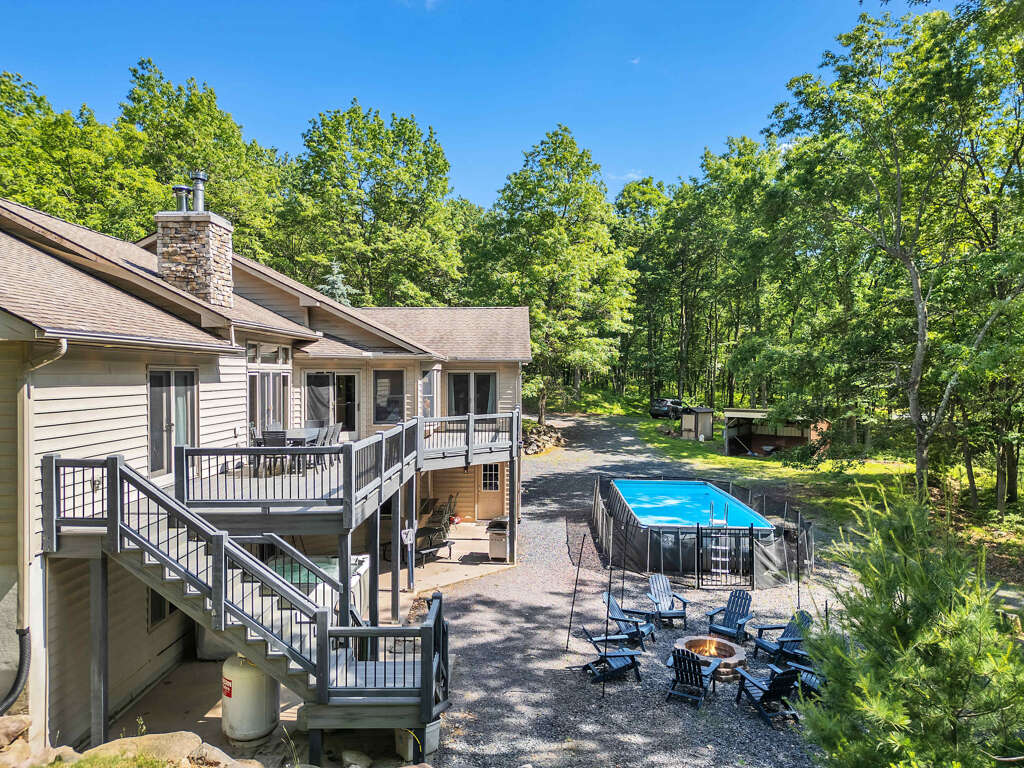 Located in Albrightsville, PA, this 4 bedroom house offers a private pond, pool, hot tub, game rooms, and a theatre for a perfect place to stay: Pondside Playhouse